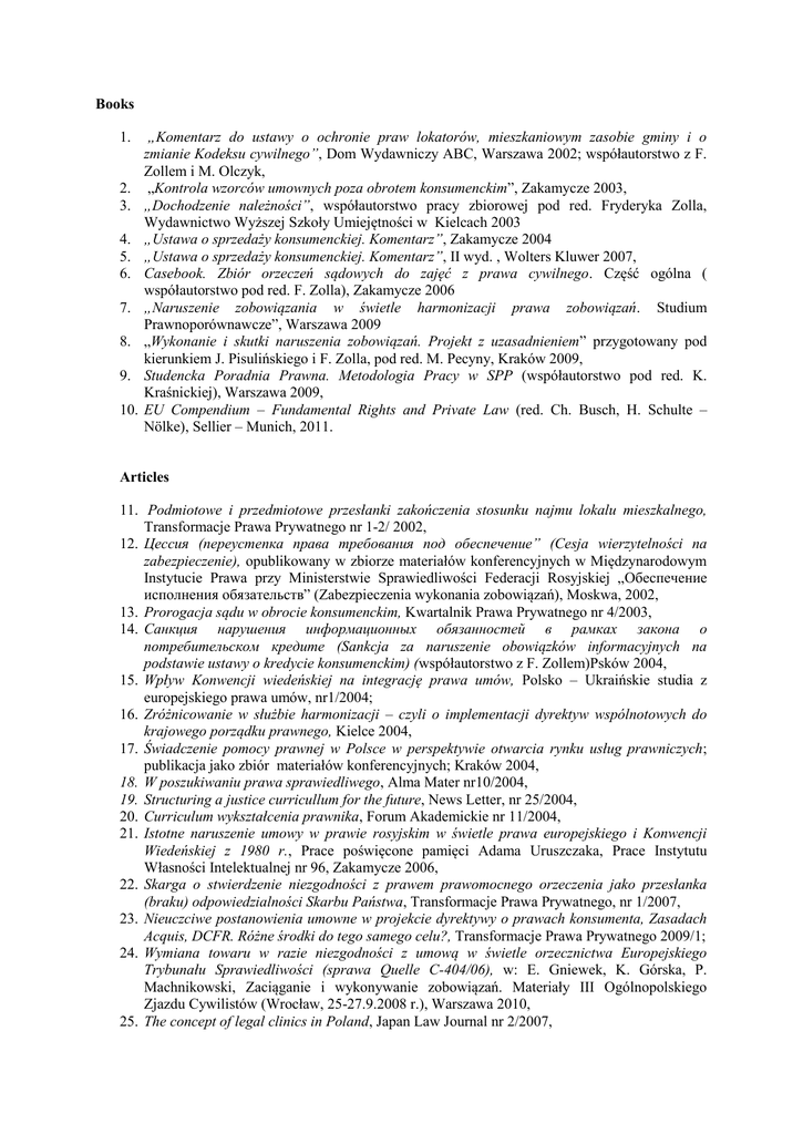 Books 1. 2. 3. 4. 5. 6. 7. 8. 9. 10. „Komentarz do ustawy o ochronie praw lokatorów, mieszkaniowym zasobie gminy i o zmianie Kodeksu cywilnego”, Dom Wydawniczy ABC, Warszawa 2002; współautorstwo z F. Zollem i M. Olczyk, „Kontrola wzorców umownych poza obrotem konsumenckim”, Zakamycze 2003, „Dochodzenie należności”, współautorstwo pracy zbiorowej pod red. Fryderyka Zolla, Wydawnictwo Wyższej Szkoły Umiejętności w Kielcach 2003 „Ustawa o sprzedaży konsumenckiej. Komentarz”, Zakamycze 2004 „Ustawa o sprzedaży konsumenckiej. Komentarz”, II wyd. , Wolters Kluwer 2007, Casebook. Zbiór orzeczeń sądowych do zajęć z prawa cywilnego. Część ogólna ( współautorstwo pod red. F. Zolla), Zakamycze 2006 „Naruszenie zobowiązania w świetle harmonizacji prawa zobowiązań. Studium Prawnoporównawcze”, Warszawa 2009 „Wykonanie i skutki naruszenia zobowiązań. Projekt z uzasadnieniem” przygotowany pod kierunkiem J. Pisulińskiego i F. Zolla, pod red. M. Pecyny, Kraków 2009, Studencka Poradnia Prawna. Metodologia Pracy w SPP (współautorstwo pod red. K. Kraśnickiej), Warszawa 2009, EU Compendium – Fundamental Rights and Private Law (red. Ch. Busch, H. Schulte – Nölke), Sellier – Munich, 2011. Articles 11. Podmiotowe i przedmiotowe przesłanki zakończenia stosunku najmu lokalu mieszkalnego, Transformacje Prawa Prywatnego nr 1-2/ 2002, 12. Цессия (переустепка права требования под обеспечение” (Cesja wierzytelności na zabezpieczenie), opublikowany w zbiorze materiałów konferencyjnych w Międzynarodowym Instytucie Prawa przy Ministerstwie Sprawiedliwości Federacji Rosyjskiej „Обеспечение исполнения обязательств” (Zabezpieczenia wykonania zobowiązań), Moskwa, 2002, 13. Prorogacja sądu w obrocie konsumenckim, Kwartalnik Prawa Prywatnego nr 4/2003, 14. Санкция нарушения информационных обязанностей в рамках закона о потребительском кредите (Sankcja za naruszenie obowiązków informacyjnych na podstawie ustawy o kredycie konsumenckim) (współautorstwo z F. Zollem)Psków 2004, 15. Wpływ Konwencji wiedeńskiej na integrację prawa umów, Polsko – Ukraińskie studia z europejskiego prawa umów, nr1/2004; 16. Zróżnicowanie w służbie harmonizacji – czyli o implementacji dyrektyw wspólnotowych do krajowego porządku prawnego, Kielce 2004, 17. Świadczenie pomocy prawnej w Polsce w perspektywie otwarcia rynku usług prawniczych; publikacja jako zbiór materiałów konferencyjnych; Kraków 2004, 18. W poszukiwaniu prawa sprawiedliwego, Alma Mater nr10/2004, 19. Structuring a justice curricullum for the future, News Letter, nr 25/2004, 20. Curriculum wykształcenia prawnika, Forum Akademickie nr 11/2004, 21. Istotne naruszenie umowy w prawie rosyjskim w świetle prawa europejskiego i Konwencji Wiedeńskiej z 1980 r., Prace poświęcone pamięci Adama Uruszczaka, Prace Instytutu Własności Intelektualnej nr 96, Zakamycze 2006, 22. Skarga o stwierdzenie niezgodności z prawem prawomocnego orzeczenia jako przesłanka (braku) odpowiedzialności Skarbu Państwa, Transformacje Prawa Prywatnego, nr 1/2007, 23. Nieuczciwe postanowienia umowne w projekcie dyrektywy o prawach konsumenta, Zasadach Acquis, DCFR. Różne środki do tego samego celu?, Transformacje Prawa Prywatnego 2009/1; 24. Wymiana towaru w razie niezgodności z umową w świetle orzecznictwa Europejskiego Trybunału Sprawiedliwości (sprawa Quelle C-404/06), w: E. Gniewek, K. Górska, P. Machnikowski, Zaciąganie i wykonywanie zobowiązań. Materiały III Ogólnopolskiego Zjazdu Cywilistów (Wrocław, 25-27.9.2008 r.), Warszawa 2010, 25. The concept of legal clinics in Poland, Japan Law Journal nr 2/2007, 26. Europejski kodeks cywilny a sektorowa harmonizacja prawa prywatnego, w: M. Pazdan i in. (red.), Europeizacja prawa prywatnego, Wolters Kluwer, Warszawa 2008, 27. Dni kultury pokoju na UJ, Alma Mater 5/2008, 28. Dyspozytywność przepisów o dawności, Transformacje Prawa Prywatnego nr 2/1010, 29. Uzasadnienie projektu „Treść, wykonanie i naruszenie zobowiązań” (współautorstwo z F. Zollem), Transformacje Prawa Prywatnego nr 4/2010 , 30. Uzasadnienie projektu „Niedozwolone postanowienia i wzorce” (współautorstwo z F. Zollem), Transformacje Prawa Prywatnego nr 4/2010, 31. Uzasadnienie projektu „Obowiązki informacyjne” (współautorstwo z F. Zollem), Transformacje Prawa Prywatnego nr 4/2010, 32. Regulacja niedozwolonych postanowień umownych, materiały z konferencji „Kierunki rozwoju europejskiego prawa prywatnego - Wpływ europejskiego prawa konsumenckiego na prawo krajowe” (w druku), 33. Contemporary trends in the regulation of the control scope of covenants in European proposals and in Polish Civil Code project, WCR, 2010/9, 34. Mediation proceedings and a settlement in the frames of Polish civil proceedings as an alternative manner of resolution of disputes in Polish law, WCR 2010/2 Commentary 35. Komentarz do wyroku SN z 24 stycznia 2008 r. (I CSK 341/07) (opublikowany na stronie HFPC), Translations 36. z języka rosyjskiego na język polski: Oleg Kuznietzow: Działalność Sądu Konstytucyjnego Republiki Białorusi, Transformacje Prawa Prywatnego 2003/2 (21 stron), 37. z języka polskiego na rosyjski artykułów: F. Czernicki Droga do powołania Fundacji Uniwersyteckich Poradni Prawnych, F. Czernicki Podróż studyjna do Republiki Południowej Afryki, D. Buniak Alternatywa wewnętrznego uchodźstwa w ustawie o cudzoziemcach – odniesienie do prawa europejskiego oraz międzynarodowego, M. Cholewa Klient poradni jako strona procesu w sprawach ubezpieczenia społecznego (zamieszczone w czasopiśmie Klinika z 2005 r.) 38. z języka angielskiego na rosyjski artykułu C. Klein Symulacja procesowa w sprawie przemocy w rodzinie (zamieszczone w czasopiśmie Klinika z 2005 r.) 39. z języka rosyjskiego