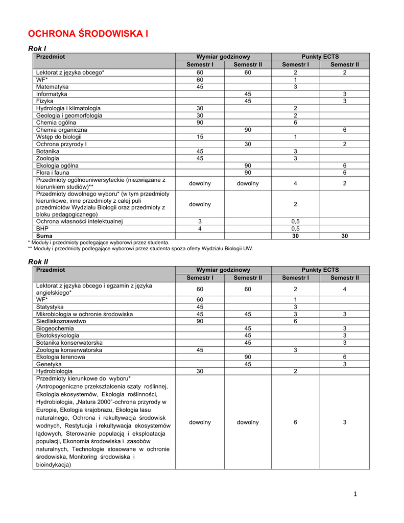 OCHRONA ŚRODOWISKA I Rok I Przedmiot Lektorat z języka obcego* WF* Matematyka Informatyka Fizyka Hydrologia i klimatologia Geologia i geomorfologia Chemia ogólna Chemia organiczna Wstęp do biologii Ochrona przyrody I Botanika Zoologia Ekologia ogólna Flora i fauna Przedmioty ogólnouniwersyteckie (niezwiązane z kierunkiem studiów)** Przedmioty dowolnego wyboru* (w tym przedmioty kierunkowe, inne przedmioty z całej puli przedmiotów Wydziału Biologii oraz przedmioty z bloku pedagogicznego) Ochrona własności intelektualnej BHP Suma Wymiar godzinowy Semestr I Semestr II 60 60 60 45 45 45 30 30 90 90 15 30 45 45 90 90 dowolny dowolny Punkty ECTS Semestr I Semestr II 2 2 1 3 3 3 2 2 6 6 1 2 3 3 6 6 4 dowolny 2 3 4 0,5 0,5 30 2 30 * Moduły i przedmioty podlegające wyborowi przez studenta. ** Moduły i przedmioty podlegające wyborowi przez studenta spoza oferty Wydziału Biologii UW. Rok II Przedmiot Lektorat z języka obcego i egzamin z języka angielskiego* WF* Statystyka Mikrobiologia w ochronie środowiska Siedliskoznawstwo Biogeochemia Ekotoksykologia Botanika konserwatorska Zoologia konserwatorska Ekologia terenowa Genetyka Hydrobiologia Przedmioty kierunkowe do wyboru* (Antropogeniczne przekształcenia szaty roślinnej, Ekologia ekosystemów, Ekologia roślinności, Hydrobiologia, „Natura 2000”-ochrona przyrody w Europie, Ekologia krajobrazu, Ekologia lasu naturalnego, Ochrona i rekultywacja środowisk wodnych, Restytucja i rekultywacja ekosystemów lądowych, Sterowanie populacją i eksploatacja populacji, Ekonomia środowiska i zasobów naturalnych, Technologie stosowane w ochronie środowiska, Monitoring środowiska i bioindykacja) Wymiar godzinowy Semestr I Semestr II 60 60 45 45 90 60 45 Punkty ECTS Semestr I Semestr II 2 1 3 3 6 45 45 45 45 3 3 3 3 3 90 45 30 dowolny 4 6 3 2 dowolny 6 3 1 Przedmioty dowolnego wyboru* (w tym przedmioty kierunkowe, inne przedmioty z całej puli przedmiotów Wydziału Biologii oraz przedmioty z bloku pedagogicznego) Praktyki zawodowe Suma dowolny 4 4 tygodnie 30 2 30 * Moduły i przedmioty podlegające wyborowi przez studenta. ** Moduły i przedmioty podlegające wyborowi przez studenta spoza oferty Wydziału Biologii UW. Rok III Przedmiot Prawne aspekty ochrony środowiska/Problematyka prawna ochrony przyrody Ocena oddziaływania na środowisko Systemy informacji przestrzennej Przedmioty kierunkowe do wyboru* (Antropogeniczne przekształcenia szaty roślinnej, Ekologia ekosystemów, Ekologia roślinności, Hydrobiologia, „Natura 2000”-ochrona przyrody w Europie, Ekologia krajobrazu, Ekologia lasu naturalnego, Ochrona i rekultywacja środowisk wodnych, Restytucja i rekultywacja ekosystemów lądowych, Sterowanie populacją i eksploatacja populacji, Ekonomia środowiska i zasobów naturalnych, Technologie stosowane w ochronie środowiska, Monitoring środowiska i bioindykacja) Przedmioty dowolnego wyboru* (w tym przedmioty kierunkowe, inne przedmioty z całej puli przedmiotów Wydziału Biologii oraz przedmioty z bloku pedagogicznego) Przedmioty ogólnouniwersyteckie (niezwiązane z kierunkiem studiów)** Pracownia licencjacka (w tym przygotowanie pracy licencjackiej i egzamin magisterski)* Suma Wymiar godzinowy Semestr I Semestr II 30 Punkty ECTS Semestr I Semestr II 2 90 15 dowolny 6 1 14 8 dowolny 6 6 dowolny 3 dowolny dowolny dowolny 4 10 30 30 * Moduły i przedmioty podlegające wyborowi przez studenta. ** Moduły i przedmioty podlegające wyborowi przez studenta spoza oferty Wydziału Biologii UW. 2