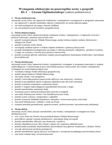Wymagania edukacyjne na poszczególne oceny z geografii Kl. I - Liceum Ogólnokształcące (zakres podstawowy) 1. Ocenę niedostateczną otrzymuje uczeń, który nie opanował wiadomości i umiejętności wymaganych w programie nauczania • nie opanował w sposób minimalny zakresu wiadomości na ocenę dopuszczającą • nie umie posługiwać się mapą i innymi źródłami • nie zna podstawowych terminów geograficznych 2. Ocenę dopuszczającą otrzymuje uczeń, który opanował jedynie minimum wiedzy i umiejętności, a większość ćwiczeń i poleceń wykonuje z pomocą nauczyciela oraz: • potrafi wymienić planety Układu Słonecznego, podać róŜnicę między ruchem obrotowym i obiegowym Ziemi • potrafi wymienić strefy Ziemi • rozwiązuje zadania typowe o niskim stopniu trudności z pomocą nauczyciela • posiada umiejętności posługiwania się mapą w zakresie pomiarów odległości, przelicza wymiary z mapy na wymiary w terenie przy pomocy nauczyciela • potrafi wymienić główne zaleŜności między poszczególnymi elementami środowiska i zjawiskami przyrodniczymi 3. Ocenę dostateczną otrzymuje uczeń, który opanował wiedzę i umiejętności wymagane w programie nauczania w stopniu zadawalającym i wykorzystuje je przy niewielkiej pomocy nauczyciela; ma wiedzę i umiejętności wymagane na ocenę dopuszczającą oraz: • wymienia rodzaje źródeł informacji geograficznej • potrafi opisać budowę Układu Słonecznego • zna ruchy Ziemi i ich następstwa • potrafi z niewielką pomocą nauczyciela obliczyć czas słoneczny i strefowy • potrafi na przykładach opisać wzajemne oddziaływanie sfer kuli ziemskiej • potrafi wymienić waŜniejsze wydarzenia Ziemi • potrafi w stopniu zadowalającym samodzielnie korzystać z mapy • potrafi samodzielnie zamieniać skalę • wymienia nazwy metod przedstawiania zjawisk na mapach • zna strefy klimatyczne świata i ich charakterystyczne cechy • potrafi czytać wykresy i temperatury i odpadów • potrafi wymienić składniki krajobrazu: naturalne i wytworzone przez człowieka • zna strefy klimatyczno- roślinne i wody na Ziemi • rozumie potrzebę gromadzenia, opracowywania, archiwizowania i prezentowania informacji 4. Ocenę dobrą otrzymuje uczeń, który pracuje samodzielnie, ma wiedzę i umiejętności wymagane na ocenę dostateczną oraz: • wie, czym róŜni się Ziemia od pozostałych planet Układu Słonecznego • prawidłowo opisuje sytuacje problemowe i poszukuje dróg rozwiązań • potrafi samodzielnie obliczać czas słoneczny i strefowy • potrafi scharakteryzować sfery Ziemi i opisać ich wzajemne oddziaływanie • potrafi podać przykłady skamieniałości przewodnich oraz główne wydarzenia z dziejów Ziemi • wie jak odczytywać przekrój geologiczny • potrafi samodzielnie opisać procesy wewnętrzne i zewnętrzne kształtujące powierzchnię Ziemi • zna róŜne rodzaje map i ich przeznaczenie • • • • • • dokonuje przeliczeń skali na wymiary rzeczywiste potrafi samodzielnie, podając przykłady, opisać wpływ czynników klimatotwórczych na warunki klimatyczne zna róŜnicę między klimatem strefowym i astrefowym zna podział skał (magmowe, osadowe, przeobraŜone) i potrafi wyjaśnić jak powstały interpretuje profil i przekrój systematyzuje zebrane informacje 5. Ocenę bardzo dobrą otrzymuje uczeń, który opanował cały materiał przewidziany w programie nauczania, ma wiedzę i umiejętności wymagane na ocenę dobrą oraz: • samodzielnie formułuje problemy, kształtuje pojęcia, analizuje i wyciąga wnioski • potrafi podać dowody istnienia ruchu obrotowego i obiegowego Ziemi i uzasadnić swoją odpowiedź • rozumie róŜnicę między czasem strefowym i urzędowym • potrafi korzystać z rysunków i schematów w trakcie swojej wypowiedzi • potrafi udowodnić na przykładach, Ŝe skamieniałości są świadectwem przeszłości geologicznej Ziemi • potrafi udowodnić wpływ czynników wewnętrznych i zewnętrznych na ukształtowanie powierzchni Ziemi • potrafi wykonać i odczytywać profile hipsometryczne • potrafi posługiwać się róŜnymi rodzajami map • potrafi wyjaśnić mechanizm powstawania wiatrów (stałych, sezonowych, lokalnych) i odpadów • potrafi analizować wykresy temperatur i opadów • potrafi porównać strefy klimatyczne i wskazać zasadnicze róŜnice między nimi • potrafi uzasadnić tezę, Ŝe najwaŜniejszym czynnikiem klimatotwórczym jest szerokość geograficzna • potrafi podać róŜnicę między skałą a glebą, • potrafi podać przykłady skał magmowych, osadowych i przeobraŜonych • potrafi wymienić miejsca na świecie będące przykładem róŜnych typów krajobrazów, zarówno strefowych, jak i astrefowych • potrafi analizować problemy i uzasadniać swoje wypowiedzi • zna problemy dotyczące ochrony środowiska 6. Ocenę celującą Otrzymuje uczeń, którego wiedza i umiejętności wykraczają poza zakres materiału przewidzianego w programie nauczania, ma wiedzę i umiejętności wymagane na ocenę bardzo dobrą oraz: • w trakcie swoich wypowiedzi korzysta z mapy oraz trafnie posługuje się terminologią geograficzną • zna przemiany geograficzne, społeczne i polityczne we współczesnym świecie • samodzielnie rozwiązuje złoŜone problemy geograficzne • odnosi sukcesy w konkursach geograficznych Opracowała: Małgorzata Mistur