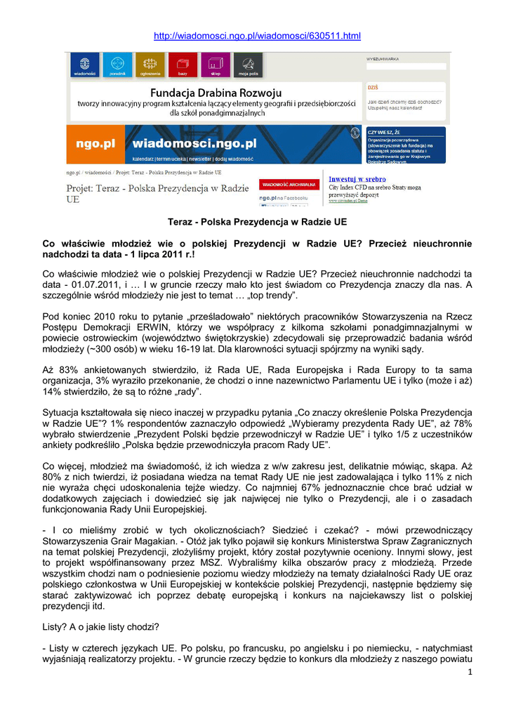 http://wiadomosci.ngo.pl/wiadomosci/630511.html Teraz - Polska Prezydencja w Radzie UE Co właściwie młodzież wie o polskiej Prezydencji w Radzie UE? Przecież nieuchronnie nadchodzi ta data - 1 lipca 2011 r.! Co właściwie młodzież wie o polskiej Prezydencji w Radzie UE? Przecież nieuchronnie nadchodzi ta data - 01.07.2011, i … I w gruncie rzeczy mało kto jest świadom co Prezydencja znaczy dla nas. A szczególnie wśród młodzieży nie jest to temat … „top trendy”. Pod koniec 2010 roku to pytanie „prześladowało” niektórych pracowników Stowarzyszenia na Rzecz Postępu Demokracji ERWIN, którzy we współpracy z kilkoma szkołami ponadgimnazjalnymi w powiecie ostrowieckim (województwo świętokrzyskie) zdecydowali się przeprowadzić badania wśród młodzieży (~300 osób) w wieku 16-19 lat. Dla klarowności sytuacji spójrzmy na wyniki sądy. Aż 83% ankietowanych stwierdziło, iż Rada UE, Rada Europejska i Rada Europy to ta sama organizacja, 3% wyraziło przekonanie, że chodzi o inne nazewnictwo Parlamentu UE i tylko (może i aż) 14% stwierdziło, że są to różne „rady”. Sytuacja kształtowała się nieco inaczej w przypadku pytania „Co znaczy określenie Polska Prezydencja w Radzie UE”? 1% respondentów zaznaczyło odpowiedź „Wybieramy prezydenta Rady UE”, aż 78% wybrało stwierdzenie „Prezydent Polski będzie przewodniczył w Radzie UE” i tylko 1/5 z uczestników ankiety podkreśliło „Polska będzie przewodniczyła pracom Rady UE”. Co więcej, młodzież ma świadomość, iż ich wiedza z w/w zakresu jest, delikatnie mówiąc, skąpa. Aż 80% z nich twierdzi, iż posiadana wiedza na temat Rady UE nie jest zadowalająca i tylko 11% z nich nie wyraża chęci udoskonalenia tejże wiedzy. Co najmniej 67% jednoznacznie chce brać udział w dodatkowych zajęciach i dowiedzieć się jak najwięcej nie tylko o Prezydencji, ale i o zasadach funkcjonowania Rady Unii Europejskiej. - I co mieliśmy zrobić w tych okolicznościach? Siedzieć i czekać? - mówi przewodniczący Stowarzyszenia Grair Magakian. - Otóż jak tylko pojawił się konkurs Ministerstwa Spraw Zagranicznych na temat polskiej Prezydencji, złożyliśmy projekt, który został pozytywnie oceniony. Innymi słowy, jest to projekt współfinansowany przez MSZ. Wybraliśmy kilka obszarów pracy z młodzieżą. Przede wszystkim chodzi nam o podniesienie poziomu wiedzy młodzieży na tematy działalności Rady UE oraz polskiego członkostwa w Unii Europejskiej w kontekście polskiej Prezydencji, następnie będziemy się starać zaktywizować ich poprzez debatę europejską i konkurs na najciekawszy list o polskiej prezydencji itd. Listy? A o jakie listy chodzi? - Listy w czterech językach UE. Po polsku, po francusku, po angielsku i po niemiecku, - natychmiast wyjaśniają realizatorzy projektu. - W gruncie rzeczy będzie to konkurs dla młodzieży z naszego powiatu 1 na najlepszy list „O szansach i wyzwaniach Polskiej Prezydencji w Radzie UE“, którego pierwsze zdanie będzie brzmiało: „Czy wiesz, że Polska od lipca przewodniczy w Radzie Unii Europejskiej…”. Najciekawsze z nich zostaną rozesłane do polskich placówek edukacyjnych oraz szkół zlokalizowanych na terytorium UE. Taka forma kontaktu będzie szansą do lepszej integracji młodzieży UE oraz rozgłoszenia faktu polskiej Prezydencji. Ponadto, autorzy najlepszych opracowań-listów zostaną nagrodzeni nagrodami książkowymi. Stowarzyszenie już wydało Zestaw Dydaktyczno-Treningowy pt. „Polska Prezydencja w Radzie UE”, który został opracowany specjalnie dla projektu. Grupa wolontariuszy skończyła też rekrutację ~300 uczestników bezpośrednich i zaczęły się seminaria i warsztaty, czyli zajęcia dydaktyczne o polskiej Prezydencji w Radzie UE (zadania, cele, perspektywy, wyzwania itd.). W szeregu innych działań, realizatorzy wyróżniają m. in. debatę. - W jej organizacji, w ramach przewidywanej współpracy, będą zaangażowani również nauczyciele historii i WOS-u ze szkól ponadgimnazjalnych z naszego powiatu, - wyjaśnia G. Magakian. - Właśnie podczas debaty młodzież będzie dyskutowała o kosztach i korzyściach polskiej Prezydencji. Członkowie Stowarzyszenia mają nadzieję, iż wdrażanie projektu podniesie poziom wiedzy młodzieży (16 - 19 lat) na tematy związane z działalnością Rady UE oraz polskim członkostwem w Unii Europejskiej w kontekście polskiej Prezydencji, przekaże im rzetelną i konkretną informację na temat roli i zadań państwa przewodzącego pracom Rady UE (w szczególności po zmianach wprowadzonych przez Traktat z Lizbony) oraz przedstawi konkretne korzyści, jakie będą płynąć dla młodzieży z tejże Prezydencji. Warsztat ”Analiza SWOT Prezydencji” data publikacji: 2011-03-21 Uwaga! Przedruk, kopiowanie, skracanie, wykorzystanie tekstów (lub ich fragmentów) publikowanych w portalu www.ngo.pl w innych mediach lub w innych serwisach internetowych wymaga zgody Redakcji portalu! 2