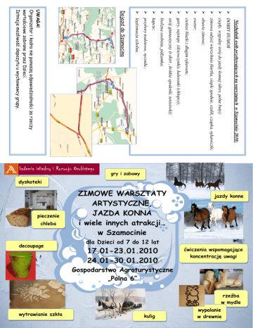 Niezbędnik osób przebywających na warsztatach w Szamocinie 2010: DOBRY HUMOR ciepły, wygodny strój do jazdy konnej (dres, pełne buty); zimowa odzież wierzchnia (kurtka, ciepłe spodnie, szalik, czapka, rękawiczki; obuwie zimowe; sweter; cieńsze bluzki z długim rękawem; getry, rajstopy (dziewczynki), kalesonki (chłopcy); strój gimnastyczny (t-shirt , krótkie spodenki, tenisówki); bielizna osobista, pidżamka; kapcie; przybory toaletowe, ręczniki.; legitymacja szkolna. kulig ćwiczenia wspomagające koncentrację uwagi 17.01-23.01.2010 24.01-30.01.2010 wypalanie w drewnie wytrawianie szkła Dojazd do Szamocina UWAGA! Organizator i kadra nie ponoszą odpowiedzialności za rzeczy wartościowe zabrane przez Dzieci. Istnieje możliwość depozytu u wychowawcy grupy. chleba dla Dzieci od 7 do 12 lat decoupage jazdy konne ZIMOWE WARSZTATY ARTYSTYCZNE, JAZDA KONNA i wiele innych atrakcji… w Szamocinie pieczenie gry i zabawy kademia Wiedzy i Rozwoju Osobistego dyskoteki Gospodarstwo Agroturystyczne „Polna 6” rzeźba w mydle Zimowe warsztaty artystyczne, jazda konna i … dla Dzieci od 7 do 12 lat w Gospodarstwie Agroturystycznym „Polna 6" w Szamocinie pieczenie chleba, gofrów; zajęcia plastyczne (m.in.: origami); dyskoteki; kino zimowe; TURNUS TERMIN I do dyspozycji stół do tenisa; konkursy z nagrodami; oraz inne atrakcje (m.in.: psy, koty, gęś Doda, indyk Leon). CENA UWAGI 17-23 stycznia 2010 740 zł 1) i 2) UWAGA! Atrakcje zależne od pogody !!! II 24-30 stycznia 2010 740 zł 1) i 2) III 17-30 stycznia 2010 1380 zł 1) i 2) jazdy konne pod opieką instruktora jeździectwa (3 h/tydzień); kulig. W przypadku niesprzyjającej aury uczestnikom zapewniamy inne atrakcje. UWAGI: 1) opiekunowie przywożą Dzieci do Szamocina w niedzielę (17.01 lub 24.01) na godz.11:30. 2) opiekunowie przyjeżdżają w sobotę (23.01 lub 30.01) na godz. 10:00 – oglądają wystawę prac Młodych Artystów, piją kawkę, jedzą ciacho i razem z Pociechami wracają do domu. PROMOCJE: 50 zł zniżki dla rodzeństw - każde dziecko otrzymuje zniżkę; 3 % zniżki dla Stałych Klientów – Dzieci, które 3. raz wyjeżdżają na wypoczynek organizowany przez Lilianę Kortus (każdy kolejny wyjazd to kolejny 1% zniżki) UWAGA! Promocje nie łączą się! Dzieciom zapewniamy: 6 lub 13 noclegów; wyżywienie - 3 posiłki dziennie; wykwalifikowanych instruktorów i wychowawców grup; ubezpieczenie NW wszystkich uczestników; ciekawy program rekreacyjny: malowanie na porcelanie z Chodzieży; szklanka własnoręcznie zdobiona - wytrawianie szkła; wykonanie pojemnika na długopisy - decoupage (sztuka zdobienia); wypalanie w drewnie; „Nie taki diabeł straszny …” – zapamiętywanie wyrazów z trudnościami ortograficznymi; ćwiczenia wspomagające koncentrację uwagi oraz rozwijające spostrzegawczość; piesze wycieczki; zajęcia ruchowe przy muzyce; Informacje dodatkowe: Organizator zapewnia wszystkie materiały i narzędzia potrzebne do aktywnego uczestnictwa w w/w zajęciach. Wykonane w trakcie warsztatów prace są własnością Młodych Artystów. Noclegi w kilkuosobowych pokojach (w każdym pokoju prysznic i toaleta). Więcej informacji na temat Gospodarstwa Agroturystycznego „Polna 6” w Szamocinie, na stronie: www.polna6.pl. Warunki płatności i rezerwacji: Rezerwacja miejsca następuje po dokonaniu wpłaty w wysokości 100 zł do dnia 20.12.2009r. W przypadku rezygnacji kwota ta nie podlega zwrotowi. Zaliczkę w wysokości 50% ceny turnusu należy wpłacić do dnia 31.12.2009r. Pozostałą część kwoty należy wpłacić do dnia 12.01.2010r. Wszystkie wpłaty proszę dokonać na konto numer: 56 1140 2004 0000 3402 5448 6322 z dopiskiem : Szamocin, imię i nazwisko dziecka + turnus. Kartę Uczestnika można odebrać osobiście lub otrzymać drogą mailową. Wypełniony dokument proszę przesłać na adres biura lub dostarczyć do organizatora warsztatów – Liliany Kortus do dnia 10.01.2010r. UWAGA! Organizator zastrzega sobie prawo odwołania turnusu w przypadku zbyt małej liczby uczestników (z pełnym zwrotem wpłaty). Zapraszamy !!! Akademia Wiedzy i Rozwoju Osobistego „AWIRO” Liliana Kortus os. B. Śmiałego 21/17, 60-682 Poznań tel kom. 0504 219 199 e-mail: [email protected] , www.awiro.pl
