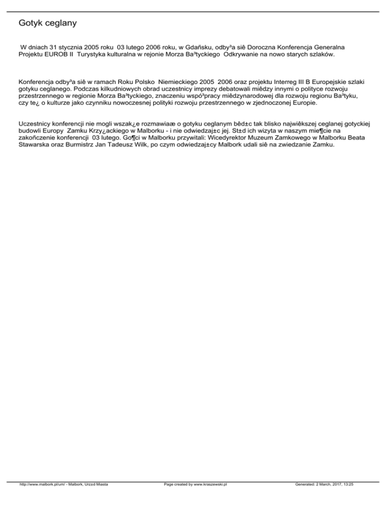 Gotyk ceglany W dniach 31 stycznia 2005 roku 03 lutego 2006 roku, w Gdañsku, odby³a siê Doroczna Konferencja Generalna Projektu EUROB II Turystyka kulturalna w rejonie Morza Ba³tyckiego Odkrywanie na nowo starych szlaków. Konferencja odby³a siê w ramach Roku Polsko Niemieckiego 2005 2006 oraz projektu Interreg III B Europejskie szlaki gotyku ceglanego. Podczas kilkudniowych obrad uczestnicy imprezy debatowali miêdzy innymi o polityce rozwoju przestrzennego w regionie Morza Ba³tyckiego, znaczeniu wspó³pracy miêdzynarodowej dla rozwoju regionu Ba³tyku, czy te¿ o kulturze jako czynniku nowoczesnej polityki rozwoju przestrzennego w zjednoczonej Europie. Uczestnicy konferencji nie mogli wszak¿e rozmawiaæ o gotyku ceglanym bêd±c tak blisko najwiêkszej ceglanej gotyckiej budowli Europy Zamku Krzy¿ackiego w Malborku - i nie odwiedzaj±c jej. St±d ich wizyta w naszym mie¶cie na zakoñczenie konferencji 03 lutego. Go¶ci w Malborku przywitali: Wicedyrektor Muzeum Zamkowego w Malborku Beata Stawarska oraz Burmistrz Jan Tadeusz Wilk, po czym odwiedzaj±cy Malbork udali siê na zwiedzanie Zamku. http://www.malbork.pl/um/ - Malbork, Urz±d Miasta Page created by www.kraszewski.pl Generated: 2 March, 2017, 13:25