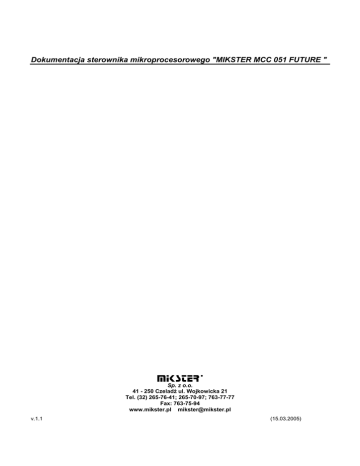 Dokumentacja sterownika mikroprocesorowego "MIKSTER MCC 051 FUTURE " Sp. z o.o. 41 - 250 Czeladź ul. Wojkowicka 21 Tel. (32) 265-76-41; 265-70-97; 763-77-77 Fax: 763-75-94 www.mikster.pl [email protected] v.1.1 (15.03.2005) Instrukcja obsługi sterownika mikroprocesorowego "MIKSTER MCC 051 FUTURE" SPIS TREŚCI 1. WSTĘP ....................................................................................................................................................................... 3 2. PULPIT STEROWNICZY S.M. MIKSTER MCC 051 FUTURE.............................................................................. 3 3. KOD BEZPIECZEŃSTWA........................................................................................................................................ 4 4. POCZĄTEK PRACY S.M. MIKSTER 051 FUTURE................................................................................................ 5 4.1. PROGRAMOWANIE PROCESÓW TECHNOLOGICZNYCH .................................................... 5 4.2. NIEZWŁOCZNE ROZPOCZĘCIE REALIZACJI PROGRAMU TECHNOLOGICZNEGO S.M. MIKSTER MCC 051 FUTURE.................................................................................................................... 6 4.3. URUCHOMIENIE PROGRAMU Z OPÓŹNIENIEM [AUTO-START] .................................... 7 4.4. SPOSÓB REALIZACJI PROGRAMU ................................................................................................. 8 4.5. RĘCZNE ZMIANY PARAMETRÓW PROCESU TECHNOLOGICZNEGO W CZASIE PRACY URZĄDZENIA ............................................................................................................................................ 8 4.6. PRACA "RĘCZNA" ................................................................................................................................... 9 SYGNALIZACJA BŁĘDÓW I AWARII ................................................................................................................. 10 5. WYKAZ SYGNALIZOWANYCH BŁĘDÓW ..................................................................................................... 10 6. SYGNALIZACJA DŹWIĘKOWA........................................................................................................................... 11 7. KALIBRACJA STEROWNIKA MCC 051. ............................................................................................................. 11 8. ODCZYT TEMPERATURY PŁASZCZA ............................................................................................................... 12 9. PRZERWA REALIZACJI PROGRAMU -PAUZA- ................................................................................................ 12 10. ZAKOŃCZENIE PRACY KOMORY .................................................................................................................. 13 11. "DELTA" .............................................................................................................................................................. 13 12. REAKCJA NA PRZEKROCZENIE DOPUSZCZALNYCH TEMPERATUR.................................................... 13 13. REAKCJA STEROWNIKA NA ZANIK ZASILANIA W CZASIE PROCESU TECHNOLOGICZNEGO ....... 13 14. USTAWIANIE ZEGARA CZASU RZECZYWISTEGO..................................................................................... 14 -2- 15.03.2005 Instrukcja obsługi sterownika mikroprocesorowego "MIKSTER MCC 051 FUTURE" 1. WSTĘP Sterowniki mikroprocesorowe serii MIKSTER MCC 050 FUTURE są urządzeniami przeznaczonym do automatycznego sterowania i kontroli parametrów procesów technologicznych w urządzeniach stosowanych przede wszystkim w przemyśle mięsnym i spożywczym do obrobki termicznej produktów. W szczególności sterownik typ. MIKSTER MCC 051 FUTURE znalazł zastosowanie do sterowania kotłami warzelnymi oraz komorami parzelniczymi. Podstawowymi funkcjami S.M. MIKSTER MCC 051 FUTURE są: - kontrola i regulacja temperatury kotła (komory), (zakres od -10-450°C), - kontrola i regulacja przyrostu temperatury w funkcji temperatury batonu DELTA(max=25.5°C), - kontrola temperatury "BATONU" zakres od -10-450°C, - kontrola i regulacja temperatury płaszcza (czynnika pośredniego), zakres od -10-450°C, - sterowanie urządzeniami wykonawczymi (styczniki, elektrozawory, itp.), - analiza i sygnalizacja stanów awaryjnych, - automatyczna realizacja programu technologicznego. S.M. MIKSTER MCC 051 FUTURE posiada możliwość zaprogramowania 50 (0-49) programów technologicznych, które mogą być w dowolny sposób zmieniane przez użytkownika. Wyłączenie zasilania nie powoduje skasowania zapisanych programów. Realizacja zapisanego programu pozwala na całkowicie automatyczne przeprowadzenie obróbki termicznej produktów zgodnie z technologią. Tryb pracy ręcznej umożliwia sprawdzenie urządzeń wykonawczych poprzez ich wysterowanie z klawiatury sterownika (prace serwisowe), oraz przeprowadzenie prostego procesu technologicznego "poza programem". 2. PULPIT STEROWNICZY S.M. MIKSTER MCC 051 FUTURE Wszelkie operacje związane z uruchamianiem sterownika, programowaniem, ręcznymi zmianami, itp. są wykonywane za pomocą pulpitu sterowniczego (rys.1). Na pulpicie można wyróżnić następujące bloki funkcjonalne: - wyświetlacze numeryczne -1- - diody sygnalizacyjne -2- - klawisze funkcyjne -3- - klawisze stanu urządzeń -4 -3- 15.03.2005 Instrukcja obsługi sterownika mikroprocesorowego "MIKSTER MCC 051 FUTURE" ? Futur e Rys. 1. Wszelkie informacje dotyczące stanu pracującego S.M."MIKSTER MCC 051 FUTURE" (stan pracy, wartości parametrów zadanych i odczytanych, sygnalizacja zał/wył urządzeń) są wyświetlane na wyświetlaczach numerycznych i diodach. Jeżeli dane urządzenie jest w stanie pracy lub dana funkcja jest aktywna dioda w odpowiednim polu jest zaświecona, jeżeli urządzenie jest wyłączone lub dana funkcja nie jest aktywna dioda nie świeci. Wprowadzanie danych do pamięci S.M."MI