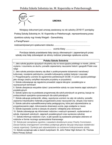 Polska Szkoła Sobotnia im. M. Kopernika w Peterborough UMOWA Niniejszy dokument jest umową zawieraną na rok szkolny 2016/17 pomiędzy Polską Szkołą Sobotnią im. M. Kopernika w Peterborough, reprezentowaną przez dyrektora szkoły mgr Anetę Weigelt - Garwolińską a Panią/Panem .............................................................................................. rodzicami/prawnymi opiekunami dziecka ........................................................... ............................................................. ucznia klasy ............... . Poniższa tabela przedstawia listę rzeczy oferowanych i zapewnianych przez szkołę oraz listę zobowiązań ze strony rodzica/ prawnego opiekuna ucznia. Polska Szkoła Sobotnia 1. Jako szkoła języków ojczystych skupiamy się na nauce języka polskiego w mowie, piśmie, czytaniu i rozumieniu ze słuchu; ponadto zapewniamy nauczanie historii i geografii Polski oraz religii 2. Jako szkoła polonijna staramy się dbać o podtrzymywanie tożsamości narodowej i kulturowej, rozwijanie patriotyzmu; ponadto kultywujemy polskie tradycje i zwyczaje 3. Przygotowujemy uczniów do egzaminów państwowych GCSE i A Level z języka polskiego jako obcego (ważny certyfikat niezwykle przydatny w przyszłości) 4. Szkoła zobowiązuje się regularnie prowadzić zajęcia lekcyjne i pozalekcyjne w wyznaczonych terminach 5. Szkoła ubezpiecza wszystkie dzieci i pracowników szkoły na czas trwania zajęć szkolnych i pozalekcyjnych 6. Szkoła opiera się na podstawie programowej dla szkół polonijnych za granicą; bazuje na podręcznikach specjalnie opracowanych dla szkół polonijnych 7. Szkoła zakupuje podręczniki, atlasy, wypożycza uczniom na cały rok szkolny; ponadto zapewnia indywidualne materiały przygotowane przez nauczycieli (np. skrypty oraz ksero) 8. Szkoła zatrudnia wykwalifikowaną kadrę pedagogiczną, która jest odpowiedzialna za przygotowywanie zajęć, dokonywanie obserwacji ucznia, jego postępów w nauce 9. Szkoła wyposaża ucznia w zeszyty do pisania i wklejania prac domowych 10. Szkoła zobowiązuje się informować rodziców o ważnych sprawach, wydarzeniach w szkole, imprezach szkolnych, zajęciach pozalekcyjnych oraz wycieczce szkolnej 11. Szkoła informuje rodziców o tym, w jaki sposób są wydawane pieniądze zbierane od rodziców w formie rocznego sprawozdania finansowego 12. Szkoła jest zarządzana zgodnie z zasadami określonymi przez Charity Commission. Zarzad Szkoły (management committee) podejmuje główne decyzje dotyczące działalności naszej organizacji. Dyrekcja jest odpowiedzialna za codzienne funkcjonowanie szkoły. 13. Szkoła wynajmuje sale w dwóch budynkach: St. John Fisher High School i St. Thomas More Primary School Polska Szkoła Sobotnia im. M. Kopernika w Peterborough Rodzic / opiekun prawny 1. Zobowiązuje się punktualnie przyprowadzać dziecko do szkoły i odbierać po zakończonych zajęciach 2. Zobowiązuje się informować wychowawcę klasy / sekretariat o nieobecności dziecka w szkole z podaniem powodu tej nieobecności 3. Zobowiązuje się interesować tym, co się dzieje w szkole (regularnie odbiera pocztę elektroniczną, czyta szkolne „Aktualności”, kontaktuje się z nauczycielem, gdy istnieje taka potrzeba) 4. Zobowiązuje się pomagać dziecku w nauce (sprawdzać, czy dziecko odrabia zadania domowe i jest odpowiednio przygotowane do szkoły) 5. Zobowiązuje się dokonać opłaty tzw. "wpisowego" w przypadku zapisu dziecka po raz pierwszy do szkoły oraz po rezygnacji i ponownym zapisie do szkoły po dłuższej przerwie 6. Zobowiązuje się dokonywać opłaty za szkołę dokonując przelewu na konto lub dokonując opłaty w sobotę rano w sekretariacie szkoły (dwie pierwsze soboty miesiąca) 7. Jest świadomy, iż dziecko zostanie skreślone z listy uczniów z powodu zadłużenia w opłatach za 3 miesiące, jednocześnie zobowiązuje się zapłacić dodatkowe £ 5.00 za opóźnienie w płatności za każdy zaległy miesiąc 8. Rodzic pokrywa koszt szkód i zniszczeń dokonanych przez ucznia w szkole 9. Zobowiązuje się informować sekretariat szkoły o zmianie danych osobowych (adresu zamieszkania, numeru telefonu, adresu mailowego itp.) oraz o rezygnacji (jednocześnie zwraca podręczniki) 10. Zobowiązuje się uczestniczyć w zebraniach rodziców z wychowawcą oraz w zebraniach organizowanych przez Zarzad Szkoły 11. Zobowiązuje się dokonać dodatkowej opłaty za każdy egzamin państwowy 12. Zobowiązuje się zakupić ćwiczenia, jeśli dziecko uczęszcza w klasach od 1 do GCSE 13. Zobowiązuje się zapłacić £ 5.00 kaucji za wypożyczane podręczniki; kaucja będzie zwrócona w przypadku rezygnacji lub zatrzymana w przypadku zagubienia / zniszczenia podręcznika. Kolejna kaucja musi być wpłacona w przypadku wydania kolejnego podręcznika. 14. Informuje sekretariat szkoły, gdy nie wyraża zgody na zamieszczanie zdjęć na stronie internetowej szkoły; nie zgadza się na uczestnictwo dziecka w lekcjach religii 15. Zobowiązuje się powiadomić wychowawcę o wszelkich przewlekłych chorobach lub ciągłych dolegliwościach dziecka, które mogłyby wpłynąć na jego bezpieczeństwo podczas zajęć szkolnych i pozalekcyjnych . Tak samo dotyczy to informacji o wymaganych i przyjmowanych przez dziecko lekarstwach. Umowa zostaje zawarta w dniu .............................................. Podpis ...................................................... rodzic / opiekun prawny Podpis Dyrektora Szkoły ..... Aneta Weigelt-Garwolińska...... Umowę sporządzono w dwóch jednobrzmiących egzemplarzach, po jednym dla każdej ze stron.