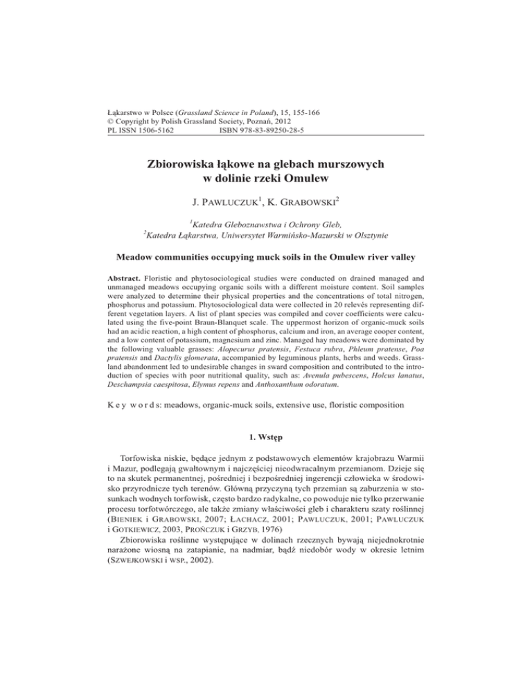 £¹karstwo w Polsce (Grassland Science in Poland), 15, 155-166 © Copyright by Polish Grassland Society, Poznañ, 2012 PL ISSN 1506-5162 ISBN 978-83-89250-28-5 Zbiorowiska ³¹kowe na glebach murszowych w dolinie rzeki Omulew J. PAWLUCZUK1, K. GRABOWSKI2 1 2 Katedra Gleboznawstwa i Ochrony Gleb, Katedra £¹karstwa, Uniwersytet Warmiñsko-Mazurski w Olsztynie Meadow communities occupying muck soils in the Omulew river valley Abstract. Floristic and phytosociological studies were conducted on drained managed and unmanaged meadows occupying organic soils with a different moisture content. Soil samples were analyzed to determine their physical properties and the concentrations of total nitrogen, phosphorus and potassium. Phytosociological data were collected in 20 relevés representing different vegetation layers. A list of plant species was compiled and cover coefficients were calculated using the five-point Braun-Blanquet scale. The uppermost horizon of organic-muck soils had an acidic reaction, a high content of phosphorus, calcium and iron, an average cooper content, and a low content of potassium, magnesium and zinc. Managed hay meadows were dominated by the following valuable grasses: Alopecurus pratensis, Festuca rubra, Phleum pratense, Poa pratensis and Dactylis glomerata, accompanied by leguminous plants, herbs and weeds. Grassland abandonment led to undesirable changes in sward composition and contributed to the introduction of species with poor nutritional quality, such as: Avenula pubescens, Holcus lanatus, Deschampsia caespitosa, Elymus repens and Anthoxanthum odoratum. K e y w o r d s: meadows, organic-muck soils, extensive use, floristic composition 1. Wstêp Torfowiska niskie, bêd¹ce jednym z podstawowych elementów krajobrazu Warmii i Mazur, podlegaj¹ gwa³townym i najczêœciej nieodwracalnym przemianom. Dzieje siê to na skutek permanentnej, poœredniej i bezpoœredniej ingerencji cz³owieka w œrodowisko przyrodnicze tych terenów. G³ówn¹ przyczyn¹ tych przemian s¹ zaburzenia w stosunkach wodnych torfowisk, czêsto bardzo radykalne, co powoduje nie tylko przerwanie procesu torfotwórczego, ale tak¿e zmiany w³aœciwoœci gleb i charakteru szaty roœlinnej (B IENIEK i G RABOWSKI, 2007; £ ACHACZ, 2001; P AWLUCZUK, 2001; P AWLUCZUK i GOTKIEWICZ, 2003, PROÑCZUK i GRZYB, 1976) Zbiorowiska roœlinne wystêpuj¹ce w dolinach rzecznych bywaj¹ niejednokrotnie nara¿one wiosn¹ na zatapianie, na nadmiar, b¹dŸ niedobór wody w okresie letnim (SZWEJKOWSKI i WSP., 2002). 156 J. Pawluczuk, K. Grabowski Zaniedbania w gospodarce na tych terenach, zw³aszcza, zaniechanie lub ograniczenie u¿ytkowania prowadzi czêsto do zubo¿enia sk³adu gatunkowego oraz opanowania runi przez nieliczne gatunki roœlin (GRABOWSKI i WSP., 2005; KRYSZAK i WSP., 2007; STYPIÑSKI i GROBELNA, 2000). Ustêpowanie roœlin w tych warunkach siedliskowych jest zjawiskiem bardzo niepokoj¹cym. Odrêbnoœæ zbiorowisk ³¹kowo-pastwiskowych na terenie Pojezierza Olsztyñskiego wynika czêsto ze specyfiki fizjograficznej, genezy i w³aœciwoœci utworów wyœcielaj¹cych doliny, bardzo zró¿nicowanych i dynamicznie ulegaj¹cych przeobra¿eniom gleb hydrogenicznych (OLESIÑSKI i OLKOWSKI, 1979). Celem niniejszych badañ by³o okreœlenie sk³adu florystycznego zbiorowisk ³¹kowych jako skutku zmieniaj¹cych siê warunków siedliskowych i u¿ytkowania na dawno zmeliorowanym obiekcie G³uch, w dolinie rzeki Omulew. 2. Materia³ i metody Badania prowadzono na ekstensywnie u¿ytkowanym obiekcie ³¹kowym G³uch (137 ha), po³o¿onyn na zmeliorowanym i zagospodarowanym torfowisku niskim, w dolinie rzeki Omulew, w mezoregionie Równiny Mazurskiej (KONDRACKI, 2000). W latach 1969–1970 badany obszar zmeliorowano za pomoc¹ sieci rowów otwartych. G³ównym Ÿród³em wody, która zasila ³¹ki na obiekcie jest rzeka Omulew. Nawadnianie ca³ego obiektu odbywa siê za pomoc¹ stacji pomp i rowów odwadniaj¹co-nawadniaj¹cych. Specyfik¹ badanego obiektu jest podnoszenie siê jego rzeŸby terenu w miarê oddalania od koryta rzeki Omulew oraz charakterystyczna mikrorzeŸba spowodowana licznymi mineralnymi wyniesieniami gr¹dowymi o deniwelacjach do 1,4 m. Takie warunki powoduj¹, ¿e poziom wód gruntowych jest zró¿nicowany. W latach dziewiêædziesi¹tych na skutek przemian w³asnoœciowych zmala³o zainteresowanie opisywanym obiektem. Brak odpowiedniej konserwacji urz¹dzeñ melioracyjnych obni¿y³o sprawnoœæ systemu odwadniaj¹co-nawadniaj¹cego i doprowadzi³o do zachwiania stosunków wodno-powietrznych i degradacji runi. W reprezentatywnych profilach glebowych (po piêæ na ³¹ce dawno zagospodarowanej i zdegradowanej) pobrano próby glebowe, w których oznaczono podstawowe w³aœciwoœci fizykochemiczne metodami powszechnie stosowanymi (OKRUSZKO, 1988; SAPEK i SAPEK, 1997). Oznaczono: – gêstoœæ objêtoœciow¹ przy u¿yciu cylinderków o pojemnoœci 100 cm3; – porowatoœæ ogóln¹ wyliczon¹ z gêstoœci i zawartoœci materii organicznej wg wzoru: P = (1–G obj./G w³.)3 x 100; – pH w H2O i w 1 mol dcm–3KCl – metod¹ potencjometryczn¹; – zawartoœæ wêgla organicznego metod¹ ISO; – zawartoœæ azotu ogólnego – metod¹ Kjeldahla; © PT£, £¹karstwo w Polsce, 15, 2012 Zbiorowiska ³¹kowe na glebach murszowych w dolinie rzeki Omulew 157 – zawartoœæ fosforu i potasu przyswajalnego – metod¹ kolorymetryczn¹ po ekstrakcji w 0,5 M HCl. W pracy przedstawiono uœrednione wyniki analiz chemicznych badanych gleb. Badania florystyczno-fitosocjologiczne szaty roœlinnej obejmowa³y u¿ytki produktywne (ok. 60%) i nieproduktywne, czyli wy³¹czone z u¿ytkowania (ok. 40% powierzchni) wystêpuj¹ce w zró¿nicowanych warunkach wilgotnoœciowo-glebowych. Szczególn¹ uwagê zwrócono na szatê roœlinn¹ na suchych i okresowo suchych ³¹kach. Wykono po 10 zdjêæ fitosocjologicznych (po 2 zdjêcia wokó³ odkrywki glebowej) w charakterystycznych p³atach roœlinnoœci na ³¹ce 