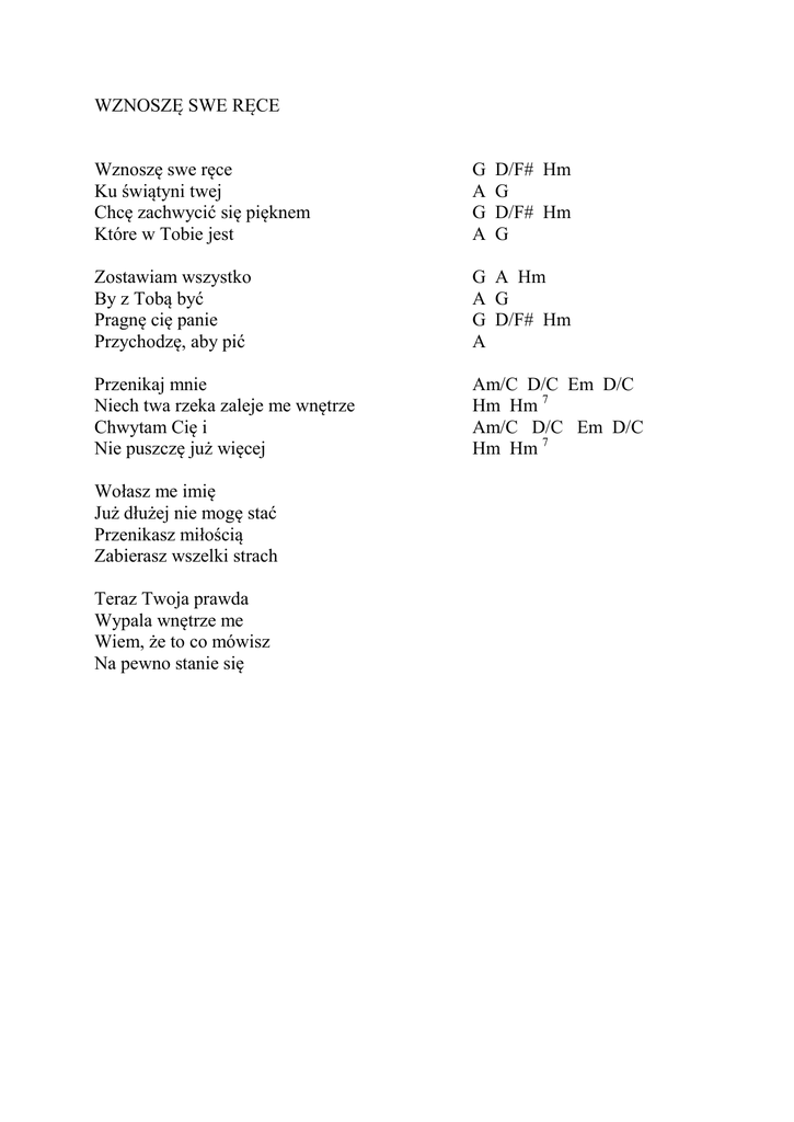 WZNOSZĘ SWE RĘCE Wznoszę swe ręce Ku świątyni twej Chcę zachwycić się pięknem Które w Tobie jest G A G A Zostawiam wszystko By z Tobą być Pragnę cię panie Przychodzę, aby pić G A Hm A G G D/F# Hm A Przenikaj mnie Niech twa rzeka zaleje me wnętrze Chwytam Cię i Nie puszczę już więcej Am/C D/C Em D/C Hm Hm 7 Am/C D/C Em D/C Hm Hm 7 Wołasz me imię Już dłużej nie mogę stać Przenikasz miłością Zabierasz wszelki strach Teraz Twoja prawda Wypala wnętrze me Wiem, że to co mówisz Na pewno stanie się D/F# Hm G D/F# Hm G