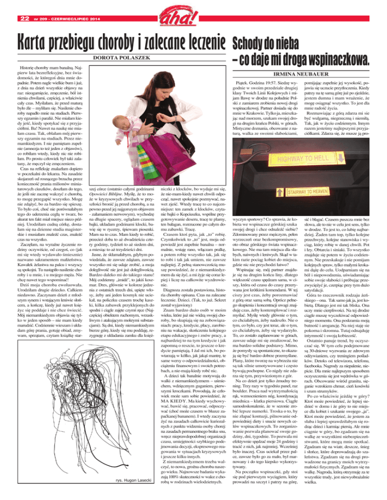 22 nr 209 - CZERWIEC/LIPIEC 2014 Karta przebiegu choroby i zalecane leczenie Schody do nieba – co daje mi droga wspinaczkowa. DOROTA POLASZEK Historię choroby mam banalną. Najpierw lata bezrefleksyjne, bez świadomości, że któregoś dnia mnie dopadnie. Potem nagle wielkie bum i już, z dnia na dzień wszystkie objawy na raz: nieogarnięcie, zmęczenie, ból istnienia chwilami, częściej, a właściwie cały czas. Myślałam, że przed maturą było źle – myliłam się. Nasilenie choroby napadło mnie na studiach. Pierwszy egzamin i paraliż. Nie miałam kiedy jeść, kiedy spotykać się z przyjaciółmi. Ba! Nawet na naukę nie miałam czasu. Tak, oblałam mój pierwszy egzamin na studiach. Przez niemamkiedyzm. I nie pamiętam zupełnie (amnezja to też jeden z objawów), co robiłam wtedy, kiedy nic nie robiłam. Po prostu człowiek był taki zalatany, że męczył się zmęczeniem. Czas na refleksję znalazłam dopiero w poczekalni do lekarza. Na zasadzie skojarzeń od rosnącego brzucha przez konieczność prania milionów miniaturowych ciuszków, doszłam do tego, że jeśli nie zacznę walczyć z chorobą, to mogę przegapić wszystko. Mogę nie zdążyć, bo za bardzo się spieszę. To było coś, choć nie porównałabym tego do uderzenia cegłą w twarz, bo akurat ten fakt miał miejsce nieco później. Urodziłam cudną córkę, dostałam się na dzienne studia magisterskie i musiałam znaleźć czas, znaleźć czas na wszystko. Zaczęłam, na wyraźne życzenie rodziny oczywiście, od czegoś, co (jak mi się wtedy wydawało śmiesznie) nazwano sakramentem małżeństwa. Kawałek żelastwa na palcu i wszyscy są spokojni. Tu nastąpiło nasilenie choroby i u mnie, i u mojego męża. Nie chcę nawet tego wspominać! Dziś moja choroba ewoluowała. Urodziłam drugie dziecko. Całkiem niedawno. Zaczynam dzień z młodszym synem i wstającym leniwie słońcem, a kończę, kiedy już nawet księżyc się poddaje i nie chce świecić. Mój niemamkiedyzm objawia się tylko w jeden sposób – nie mam kiedy marudzić. Codziennie wieszam i układam górę prania, gotuję obiad, zmywam, sprzątam, czytam książkę star- IRMINA NEUBAUER szej córce (ostatnio całymi godzinami Opowieści Biblijne. Myślę, że to może w kryzysowych chwilach w przyszłości bronić ją przed chorobą, a na pewno przed jej najgorszym objawem - załamaniem nerwowym), wychodzę na długie spacery, oglądam czasem bajki, układam godzinami klocki, bawię się w rycerzy, śpiewam piosenki. Mam na to czas. Mam kiedy to robić, przecież doba to aż dwadzieścia cztery godziny, tydzień to aż siedem dni, a miesiąc to aż trzydzieści dni. Jasne, że skłamałabym, gdybym powiedziała, że zawsze zdążam, zawsze wszystko mi się udaje zrobić, a moja dolegliwość nie jest już dolegliwością. Bardzo daleko mi do takiego stanu! Mój codzienny „imidż”, to jakiś koszmar. Dres, głównie w kolorze jedzenia z ostatnich trzech dni, upięte włosy, żeby ani jeden kosmyk nie uciekał, na policzku czasem trochę kaszki, kilka zabawek przyklejonych do spodni i ciągle zajęte czymś ręce (Najczęściej obiektem ruchomym, wrzaskliwym i atakującym mokrymi substancjami). Są dni, kiedy niemamkiedyzm bierze górę, kiedy się mu poddaję, rezygnuję z układania zamku dla księż- rys. Hugon Lasecki niczki z klocków, bo wydaje mi się, że nie-mam-kiedy nawet chwili odpocząć, nawet spokojnie pozmywać, nawet zjeść. Wtedy tracę to co najcenniejsze: ten zamek z klocków, czytanie bajki o Kopciuszku, wspólne przygotowywanie deseru, tracę te plamy, ten bałagan, rozrzucone po całym domu zabawki. Tracę. Czasem ktoś pyta, jak „to” robię. Czymkolwiek to „to” jest, moja odpowiedź jest zupełnie banalna – normalnie, wstaję rano, włączam pralkę, a potem robię wszystko tak, jak się to robi i tak jak umiem, nie zawsze najlepiej. Z pełną stanowczością muszę powiedzieć, że z niemamkiedyzmem da się żyć, a mi żyje się coraz lepiej i liczę na całkowite wyzdrowienie. Diagnoza została postawiona, historia choroby opisana. Czas na zalecane leczenie. Dzieci. (Tak, to już. Sekret został wyjawiony) Znam bardzo dużo osób w moim wieku, które już nie widzą swojej choroby, bo skupiają się na zobowiązaniach: pracy, kredycie, płacy, zarobieniu na wakacje, skończeniu kolejnego etapu edukacyjnego i znów pracy, a najbardziej to na tym kredycie i jak zapomną o reszcie, to jeszcze o kredycie pamiętają. I żal mi ich, bo powtarzają w kółko, jak jakąś mantrę, te same wersy o odpowiedzialności, obciążeniu finansowym i swoich potrzebach, a nie-mają-kiedy robć nic. A dzieci tak banalnie motywują do walki z niemamkiedyzmem – uśmiechem, wdzięcznym guganiem, pierwszymi kroczkami. Powodują, że człowiek może sam sobie powiedzieć, że MA KIEDY. Ma kiedy wychowywać, bawić się, pracować, odpoczywać (choć może czasem w bluzce zapaćkanej bananem). I wtedy zaczyna żyć na zasadach całkowicie kuriozalnych z punktu widzenia osoby chorej: na zasadach permanentnego braku snu, wręcz nieprawdopodobnej organizacji czasu, umiejętności szybkiego podejmowania decyzji, ekspresowego reagowania w sytuacjach kryzysowych i jeszcze kilku innych. Z niemamkiedyzmem trzeba walczyć, to nowa, groźna choroba naszego wieku. Najnowsze badania wykazują 100% skuteczności w walce z chorobą w rodzinach wielodzietnych. Piątek. Godzina 19:57. Siedzę wygodnie w swoim przedziale drugiej klasy Twoich Linii Kolejowych i mijam Iławę w drodze na południe Polski z zamiarem zrobienia nowej drogi wspinaczkowej. Partner dosiada się do mnie w Krakowie. Tylko ja, mieszkając nad morzem, szukam swojej drogi na drugim krańcu Polski, w górach. Mistyczne doznania, obcowanie z naturą, walka ze swoimi słabościami, pomijając zupełnie jej wysokość, pojawia się uczucie przytłoczenia. Kiedy patrzy na tę samą górę już po zjeździe, jestem dumna i mam wrażenie, że mogę osiągnąć 