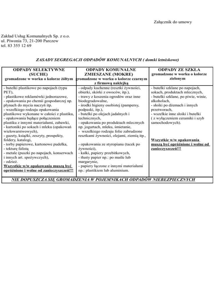 Załącznik do umowy Zakład Usług Komunalnych Sp. z oo