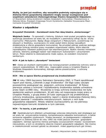 Myślę, że jest już możliwe, aby wszystkie podmioty zajmujące się w Zielonej Górze gospodarką odpadami mogły zacząć występować pod wspólnym sztandarem Zielonogórskiego Klastra Gospodarki Odpadami. (Z Wojciechem Janką dyrektorem Zakładu Gospodarki Komunalnej i Mieszkaniowej w Zielonej Górze, Prezesem Krajowego Forum Dyrektorów Zakładów Oczyszczania Miast – rozmawia Krzysztof Chmielnik) Klaster z odpadków Krzysztof Chmielnik - Zaciekawił mnie Pan ideą klastra „śmieciowego” Wojciech Janka - To opowieść z historią. Gdybym miał szukać początków tego co wykonuję zawodowo od wielu lat, do musiałbym z pewnością cofnąć się do druha Czarnucha i Makusynów. Będąc długo związanym z Makusynami, uczestnicząc na obozach w Siedlisku, wyznaczano mi wiele zadań które dzisiaj nazwałbym działalnością w sferze gospodarki komunalnej. Na przykład pełniąc podczas jednego z obozów funkcję ministra pracy musiałem organizować roboty, które obecnie nazwalibyśmy robotami publicznymi lub interwencyjnymi. Byłem również ministrem zdrowia, któremu podlegał nadzór nad właściwym wykonaniem i utrzymaniem latryn. Może właśnie to doświadczenie miało wpływ, że zostałem inżynierem sanitarnym. KCH -A jak to było z „dorosłymi” śmieciami WJ –Zaraz po studiach zajmowałem się rozwiązywaniem problemów ochrony wód w naszym województwie. W 1983 roku rozpocząłem pracę w Urzędzie Miasta w Wydziale Gospodarki Komunalnej, którego zakres poszerzyliśmy o ochronę środowiska. KCH - Kto w epoce Gierka przejmował się środowiskiem? JW W roku 1969 ówczesny Sekretarz Generalny ONZ, U Thant opublikował raport pod nazwą „Człowiek a jego środowiska”. Od tego czasu zaczęto powszechnie posługiwać się pojęciem „ochrona środowiska”. W Polsce pierwsza ustawa o ochronie i kształtowaniu środowiska została uchwalona przez Sejm w1980 roku. Wcześniej w kraju ochrona środowiska nie była społecznie ważnym problemem. W pół roku od rozpoczęcia mojej pracy w Urzędzie Miasta, z grupą blisko 20 ludzi zajmujących się problematyką ochrony środowiska, opracowaliśmy raport o stanie środowiska Zielonej Góry. Raport zawierał 7 rozdziałów merytorycznych. Jednym z nich była gospodarka odpadami. Wtedy właśnie wyznaczyliśmy po raz pierwszy najważniejsze kierunki działania w tym zakresie. KCH - To teoria, a jak praktyka? JW –Spektakularnym efektem uchwalonego wówczas dokumentu jest działająca już od wielu lat oczyszczalnia ścieków, kompostowania odpadów komunalnych, a także sortownia odpadów użytkowych. Trzeba zauważyć, że postępowanie z odpadami miejskim w Zielonej Górze do roku 1992 nie miało jeszcze znamion gospodarki odpadami. Istnieje ogromna różnica pomiędzy oczyszczaniem miasta i wywożeniem nieczystości, a tym co określamy obecnie mianem gospodarki odpadami. Nie można w nieskończoność wznosić gdzieś na obrzeżach miast gigantycznych gór śmieci. Wywiad z Wojciechem Janką – Krzysztof Chmielnik Odpady należy traktować jako surowiec, który trzeba z umiejętnością wykorzystać. KCH - Zatem przepraszam za „śmieci”, poprawiam się na „odpady” WJ – Zaczynając budowanie zielonogórskiej gospodarki odpadami byliśmy krajowymi pionierami w tak nowatorskim na ówczesny czas, rozwiązywaniu problemu. W 1992 roku wystartowaliśmy w konkursie „Innowacje w mieście” ogłoszonym przez Związek Miast Polskich. Zgłosiliśmy do niego nie tylko samą wówczas budowaną kompostownię, ale cały zorganizowany miejski system postępowania z wszystkimi rodzajami odpadów. Doceniono nas, otrzymaliśmy jedno z pięciu równorzędnych wyróżnień. KCH –A wracając do raportu, i co się z tym raportem stało po jego opracowaniu? WJ - Rada Miasta przyjęła ten raport. Proponowany w nim system gospodarowania odpadami stał się obowiązujący w mieście. Ujmował on gospodarkę odpadami kompleksowo. System zawiera wiele elementów, od infrastruktury technicznej zaczynając, na elementach oddziaływania psychologicznego, jakim jest chociażby wpajanie nawyku segregowania odpadów w domu kończąc. Nic nie jest w tym systemie przypadkowe. Nawet kolory. Realizujemy go permanentnie do dnia dzisiejszego z dalszą wizją rozwoju. KCH - To pachnie innowacją WJ - Wyprzedziliśmy obowiązek prawny o prawie 10 lat. Bowiem dopiero w 2001 roku, prawo zobowiązało gminy do opracowania planów gospodarki odpadami i budowy kompleksowych zakładów zagospodarowania odpadów. Miasto powinno dokładnie wiedzieć kto, co, gdzie i jak będzie robić z każdym rodzajem odpadów powstających na jego terenie. KCH – Czyli znowu pionierzy? WJ – Kiedy w roku 1990 wydzielono z własności państwowej własność komunalną , przedsiębiorstwa komunalne pozostawiono same sobie. Dlatego też zaistniała naturalna potrzeba stworzenia krajowej platformy wymiany myśli, doświadczeń i informacji związanych z funkcjonowaniem budującej się branży gospodarki odpadami. Mając już określone doświadczenie, a zarazem wizję funkcjonowania krajowej gospodarki odpadami zaprosiłem w 1992 roku na pierwsze spotkanie do naszego miasta dyrektorów z podobnych firm, z miast wojewódzkich. W efekcie tego spotkania powstało stowarzyszenie o nazwie „Krajowe Forum Dyrektorów Zakładów Oczyszczania Miast”. Pierwsza organizacja tej branży w kraju. KCH - A wymiar osobisty? WJ - Zostałem niedawno po raz 6-ty wybrany na kolejną kadencję prezesem zarządu naszego Forum. To sukces przede wszystkim miasta, gdyż wciąż jesteśmy postrzegani w kraju, jako centrum innowacyjnej myśli związanej z gospodarką odpadami. Mamy jako miasto prestiż i uznanie. Zorganizowaliśmy w różnych częściach kraju 32 zjazdy poświęcone wymianie myśli i doświadczeń. Każde takie spotkanie, to 300 branżystów uczących się i dyskutujących w jednym czasie i miejscu. Zorganizowaliśmy dla ponad 3000 osób ponad 60 szkoleń zagrani