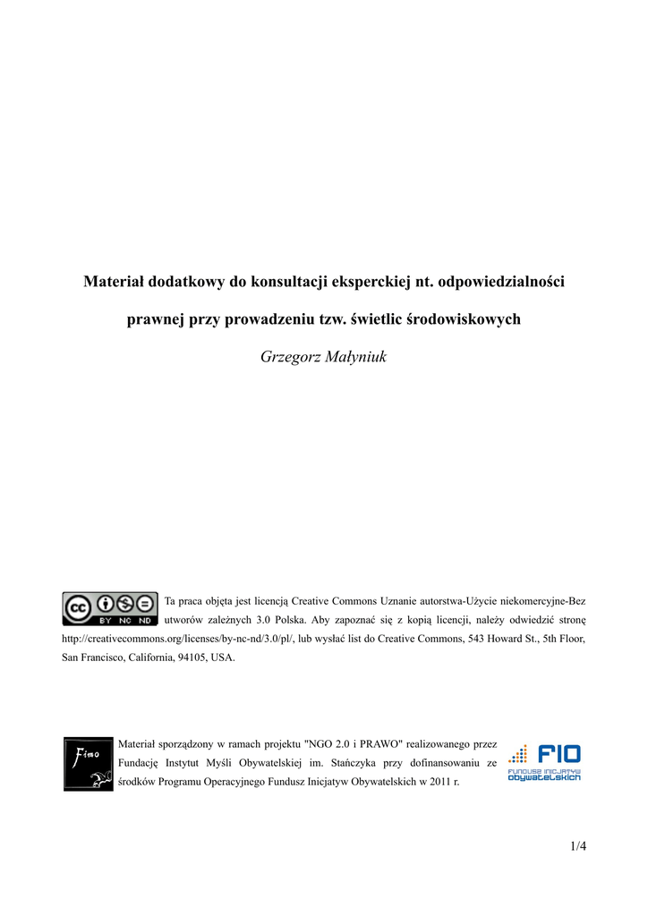 Materiał dodatkowy do konsultacji eksperckiej nt. odpowiedzialności prawnej przy prowadzeniu tzw. świetlic środowiskowych Grzegorz Małyniuk Ta praca objęta jest licencją Creative Commons Uznanie autorstwa-Użycie niekomercyjne-Bez utworów zależnych 3.0 Polska. Aby zapoznać się z kopią licencji, należy odwiedzić stronę http://creativecommons.org/licenses/by-nc-nd/3.0/pl/, lub wysłać list do Creative Commons, 543 Howard St., 5th Floor, San Francisco, California, 94105, USA. Materiał sporządzony w ramach projektu "NGO 2.0 i PRAWO" realizowanego przez Fundację Instytut Myśli Obywatelskiej im. Stańczyka przy dofinansowaniu ze środków Programu Operacyjnego Fundusz Inicjatyw Obywatelskich w 2011 r. 1/4 Odpowiedzialność prawna osób prowadzących świetlice środowiskowe Pierwszą i zasadniczą kwestią jest ustalenie czym jest świetlica środowiskowa i wskazanie, czy istnieje jakiś szczególny reżim prawny, któremu takie świetlice podlegają. W obecnym stanie normatywnym, pojęcie świetlicy (środowiskowej) występuje w art. 71 ustawy o pomocy społecznej, która określa świetlicę jako placówkę opiekuńczo-wychowawczą wsparcia dziennego dla dzieci. Placówka taka może być prowadzona bezpośrednio przez gminę albo w formie zleconego zadania przez: 1) organizacje pozarządowe prowadzące działalność w zakresie pomocy społecznej, 2) osoby prawne i jednostki organizacyjne działające na podstawie przepisów o stosunku Państwa do Kościoła Katolickiego w Rzeczypospolitej Polskiej, stosunku Państwa do innych kościołów i związków wyznaniowych oraz o gwarancji wolności sumienia i wyznania, jeżeli ich cele statutowe obejmują prowadzenie działalności w zakresie pomocy społecznej Takie placówki musza wówczas spełniać określone wymogi organizacyjno-personalne unormowane w rozporządzeniu Ministra Pracy i Polityki Społecznej z dnia 19 października 2007 r. w sprawie placówek opiekuńczo-wychowawczych. W obecnej chwili (na dzień 12.12.2011 r.) brak jest jednak przeciwwskazań w przepisach, by takie świetlice były prowadzone przez inne podmioty bez porozumienia z gminą. Stan ten jednak ulegnie zmianie już z dniem 01.01.2012 r., kiedy w życie wejdzie ustawa o wspieraniu rodziny i systemie pieczy zastępczej z 9 czerwca 2011 r. Zgodnie z tą ustawą placówki wsparcia dziennego będzie mogła prowadzić jedynie gmina lub podmiot, któremu zleci ona prowadzenie tej działalności w drodze konkursu przeprowadzanego na podstawie ustawy z 24 kwietnia 2003 r. o działalności pożytku publicznego i o wolontariacie. Taką placówkę będzie mógł też założy inny podmiot, pod warunkiem że uzyska zezwolenia wójta, burmistrza lub prezydenta miasta. Wówczas wszystkie takie placówki będą podlegały rozporządzeniu Ministra Pracy i Polityki Społecznej z dnia 19 października 2007 r. w sprawie placówek opiekuńczo-wychowawczych. Istniejące obecnie placówki mają czas do końca 2012 r. by spełnić wymogi nowej ustawy. Niezależnie jednak od formy prawnej prowadzonej działalności, osoby prowadzące taka placówkę odpowiadają za bezpieczeństwo dzieci korzystających z takiej placówki. Odpowiedzialność traka może mieć charakter cywilny (odszkodowawczy) i karny. 2/4 Nie wdając się w bardziej teoretyczne rozważania o podstawach odpowiedzialności, należy wskazać, iż niezależnie od tego, czy dziecko przebywa w danej placówce za zgodą rodziców, czy też bez ich zgody prowadzący placówkę odpowiada za wszystko, co stało się dziecku w czasie przebywania w tej placówce czy tez w innym miejscu pod opieką wychowawcy-opiekuna. W zakresie odpowiedzialności cywilnej, należy wskazać, iż ponosi ją organizacja prowadząca placówkę – czyli stowarzyszenie albo fundacja. Jest to odpowiedzialności odszkodowawcza za wszelkie szkody – na zdrowiu, jak i na mieniu. Jeśli dziecko przebywa na terenie placówki za zgodą rodziców – jest to odpowiedzialność za naruszenie umowy z rodzicami o opiekę nad dzieckiem. Jeśli dziecko przebywa na terenie placówki bez zgody rodziców, to jest to odpowiedzialności za naruszenie obowiązków wynikających z prowadzenia cudzych spraw bez zlecenia. Należy także podkreślić, iż tak samo kształtuje się odpowiedzialność organizacji, jeśli dziecku coś się przydarzy np. na wycieczce. Opisywana odpowiedzialność jest bowiem odpowiedzialnością za sprawowanie opieki nad dzieckiem, a nie za prowadzenie świetlicy. Jeśli stowarzyszenie lub fundacja będą musiały wypłacić odszkodowanie, to przysługuje mu tzw. roszczenie regresowe do wychowawcy, który doprowadził do powstania szkody w wyniku niedopełnienia swoich obowiązków. Odpowiedzialność ta może zostać wyłączona, jeśli organizacja prowadząca świetlicę wykaże, iż dochowała należytej staranności w opiece nad dzieckiem. Oznacza to, że jeśli świetlicę prowadzą wyspecjalizowani wychowawcy, to sprawowali opiekę z uwzględnieniem standardów dla specjalistów. Jeśli natomiast opiekę sprawowały osoby bez specjalistycznego przygotowanie, obowiązuje standard zapobiegliwego rodzica, sprawujące opiekę na własnym dzieckiem. Warto jednak zaznaczyć, iż od 1 stycznia 2012 r. tylko wyspecjalizowani wychowawcy będą mogli prowadzić takie świetlice. Odpowiedzialność karna kształtuje się identycznie co do jej przesłanek, ale ponosi ją jedynie wychowawca, a nie organizacja prowadząca świetlicę. Jest to odpowiedzialność za niedopełnienie swoich obowiązków i dopuszczenie do tego, ze podopieczny poniósł szkodę. Największe wątpliwości budzi jednak sytuacja, gdy dziecko opuszcza placówkę. Możliwych jest kilka sytuacji. Przede wszystkim należy wskazać, iż jeśli rodzice dziecka zastrzegli, ze dziecko może opuścić świetlicę tylko pod opieką rodzica, to nie wolno go samego ze świetlicy wypuścić, a jeśli dziecko nie ukończyło 15. roku życia – nawet zatrzymać siłą. Jeśli 
