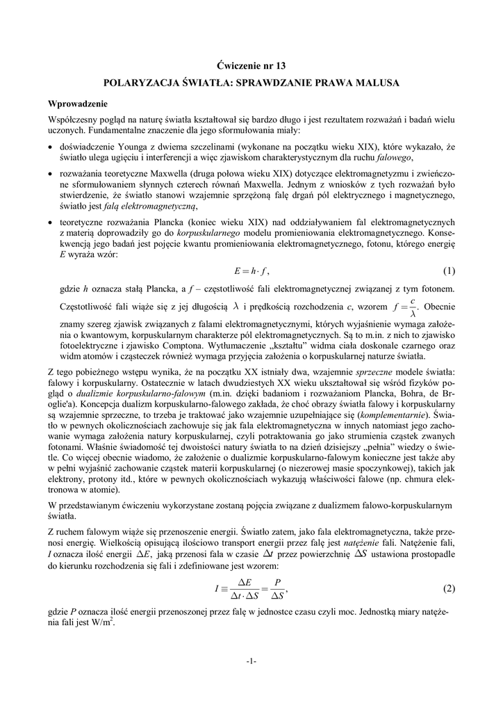 Ćwiczenie nr 13 POLARYZACJA ŚWIATŁA: SPRAWDZANIE PRAWA MALUSA Wprowadzenie Współczesny pogląd na naturę światła kształtował się bardzo długo i jest rezultatem rozważań i badań wielu uczonych. Fundamentalne znaczenie dla jego sformułowania miały: doświadczenie Younga z dwiema szczelinami (wykonane na początku wieku XIX), które wykazało, że światło ulega ugięciu i interferencji a więc zjawiskom charakterystycznym dla ruchu falowego, rozważania teoretyczne Maxwella (druga połowa wieku XIX) dotyczące elektromagnetyzmu i zwieńczone sformułowaniem słynnych czterech równań Maxwella. Jednym z wniosków z tych rozważań było stwierdzenie, że światło stanowi wzajemnie sprzężoną falę drgań pól elektrycznego i magnetycznego, światło jest falą elektromagnetyczną, teoretyczne rozważania Plancka (koniec wieku XIX) nad oddziaływaniem fal elektromagnetycznych z materią doprowadziły go do korpuskularnego modelu promieniowania elektromagnetycznego. Konsekwencją jego badań jest pojęcie kwantu promieniowania elektromagnetycznego, fotonu, którego energię E wyraża wzór: E h f , (1) gdzie h oznacza stałą Plancka, a f – częstotliwość fali elektromagnetycznej związanej z tym fotonem. c Częstotliwość fali wiąże się z jej długością i prędkością rozchodzenia c, wzorem f . Obecnie znamy szereg zjawisk związanych z falami elektromagnetycznymi, których wyjaśnienie wymaga założenia o kwantowym, korpuskularnym charakterze pól elektromagnetycznych. Są to m.in. z nich to zjawisko fotoelektryczne i zjawisko Comptona. Wytłumaczenie „kształtu” widma ciała doskonale czarnego oraz widm atomów i cząsteczek również wymaga przyjęcia założenia o korpuskularnej naturze światła. Z tego pobieżnego wstępu wynika, że na początku XX istniały dwa, wzajemnie sprzeczne modele światła: falowy i korpuskularny. Ostatecznie w latach dwudziestych XX wieku ukształtował się wśród fizyków pogląd o dualizmie korpuskularno-falowym (m.in. dzięki badaniom i rozważaniom Plancka, Bohra, de Broglie'a). Koncepcja dualizm korpuskularno-falowego zakłada, że choć obrazy światła falowy i korpuskularny są wzajemnie sprzeczne, to trzeba je traktować jako wzajemnie uzupełniające się (komplementarnie). Światło w pewnych okolicznościach zachowuje się jak fala elektromagnetyczna w innych natomiast jego zachowanie wymaga założenia natury korpuskularnej, czyli potraktowania go jako strumienia cząstek zwanych fotonami. Właśnie świadomość tej dwoistości natury światła to na dzień dzisiejszy „pełnia” wiedzy o świetle. Co więcej obecnie wiadomo, że założenie o dualizmie korpuskularno-falowym konieczne jest także aby w pełni wyjaśnić zachowanie cząstek materii korpuskularnej (o niezerowej masie spoczynkowej), takich jak elektrony, protony itd., które w pewnych okolicznościach wykazują właściwości falowe (np. chmura elektronowa w atomie). W przedstawianym ćwiczeniu wykorzystane zostaną pojęcia związane z dualizmem falowo-korpuskularnym światła. Z ruchem falowym wiąże się przenoszenie energii. Światło zatem, jako fala elektromagnetyczna, także przenosi energię. Wielkością opisującą ilościowo transport energii przez falę jest natężenie fali. Natężenie fali, I oznacza ilość energii E , jaką przenosi fala w czasie t przez powierzchnię S ustawiona prostopadle do kierunku rozchodzenia się fali i zdefiniowane jest wzorem: I E P , t S S (2) gdzie P oznacza ilość energii przenoszonej przez falę w jednostce czasu czyli moc. Jednostką miary natężenia fali jest W/m2. -1- Można wykazać, że w przypadku fali elektromagnetycznej jej natężenie jest proporcjonalne do kwadratu amplitudy wektora natężenia jej pola elektrycznego EA , czyli I EA . 2 (3) Jeżeli opisujemy natężenie światła z punktu widzenia korpuskularnego (fotonowego), to poprzez natężenie fali rozumiemy łączną ilość energii jaką przenoszą fotony światła w jednostce czasu przez jednostkową powierzchnię ustawiona prostopadle do kierunku ich rozchodzenia się. Świtało monochromatyczne, w ujęciu korpuskularnym, stanowi strumień fotonów o takiej samej energii. W takim przypadku wzór na natężenie światła przyjmuje postać: I (4) n h f , t S gdzie n oznacza liczbę fotonów przechodzących przez (padających na) powierzchnię S w czasie t. Wracając do opisu falowego światło klasyfikuje się jako falę poprzeczną. Oznacza to, że wektor pola elektrycznego tej fali wykonuje drgania (zmienia periodycznie swoją wartość) w kierunku prostopadłym do kierunku jej rozchodzenia się. Naturalne źródła światła emitują światło niespolaryzowane, co oznacza, że składa się ono z wielkiej liczby wiązek rozchodzących się w określonym kierunku, w których drgania wektora pola elektrycznego (w uproszczeniu drgania fali lub drgania światła) odbywają w kierunku prostopadłym do kierunku rozchodzenia się światła, ale innym w każdej z wiązek. Spolaryzowanie (dokładniej polaryzacja liniowa) światła polega na uporządkowaniu kierunku drgań we wszystkich wspomnianych wiązkach w ten sposób, że odbywają się one w jednej płaszczyźnie. Sposoby polaryzacji światła szczegółowo omówione są w dodatku. Prawo Malusa Jeśli na polaryzator pada wiązka światła niespolaryzowanego, to niezależnie od zasady jego działania, opuszcza go wiązka światła spolaryzowanego liniowo tak, że drgania wektora elektrycznego odbywają się tylko w jednym kierunku. Na rysunku 1 pokazano polaryzator, na który pada wiązka światła spolaryzowanego liniowo. Kierunek padającej wiązki jest prostopadły do płaszczyzny rysunku a drgania wektora elektrycznego odbywają się w jednym, zaznaczonym na rysunku kierunku. Na rysunku zaznaczono także wektor E0 natężenia pola elektrycznego odpowiadający amplitudzie drgań pola elektrycznego w wiązce światła padającego na polaryzator. Kierunek drgań, w wiązc