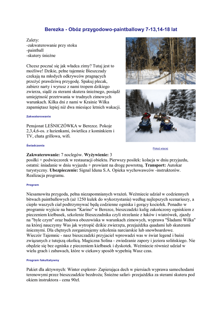 Berezka - Obóz przygodowo-paintballowy 7-13,14-18 lat Zalety: -zakwaterowanie przy stoku -paintball -skutery śnieżne Chcesz poczuć się jak władca zimy? Tutaj jest to możliwe! Dzikie, pełne tajemnic Bieszczady czekają na młodych odkrywców pragnących przeżyć prawdziwą przygodę. Spakuj plecak, zabierz narty i wyrusz z nami tropem dzikiego zwierza, siądź za sterami skutera śnieżnego, posiądź umiejętność przetrwania w trudnych zimowych warunkach. Kilka dni z nami w Krainie Wilka zapamiętasz lepiej niż dwa miesiące letnich wakacji. Zakwaterowanie Pensjonat LEŚNICZÓWKA w Berezce. Pokoje 2,3,4,6-os. z łazienkami, świetlica z kominkiem i TV, chata grillowa, wifi. Świadczenia Pokaż więcej Zakwaterowanie: 7 noclegów. Wyżywienie: 3 posiłki + podwieczorek w restauracji obiektu. Pierwszy posiłek: kolacja w dniu przyjazdu, ostatni: śniadanie w dniu wyjazdu + prowiant na drogę powrotną. Transport: Autokar turystyczny. Ubezpieczenie: Signal Iduna S.A. Opieka wychowawców -instruktorów. Realizacja programu. Program Niesamowita przygoda, pełna niezapomnianych wrażeń. Weźmiecie udział w codziennych bitwach paintballowych (aż 1250 kulek do wykorzystania) według najlepszych scenariuszy, a ciepło waszych ciał podtrzymywać będą codzienne ogniska i gorący kociołek. Ponadto w programie wyjście na basen "Karino" w Berezce, bieszczadzki kulig zakończony ogniskiem z pieczeniem kiełbasek, szkolenie Bieszczadnika czyli strzelanie z łuków i wiatrówek, zjazdy na "byle czym" oraz budowa obozowiska w warunkach zimowych, wyprawa "Śladami Wilka" na której nauczymy Was jak wytropić dzikie zwierzęta, przejażdżka quadami lub skuterami śnieznymi. Dla chętnych zorganizujemy szkolenia narciarskie lub snowboardowe. Wieczór Tajemnic - nasz bieszczadzki przyjaciel wprowadzi was w świat legend i baśni związanych z tutejszą okolicą. Magiczna Solina - zwiedzanie zapory i jeziora solińskiego. Nie obędzie się bez ogniska z pieczeniem kiełbasek i dyskotek. Weźmiecie również udział w wielu grach i zabawach, które w ciekawy sposób wypełnią Wasz czas. Program fakultatywny Pakiet dla aktywnych: Winter explorer- Zapierająca dech w piersiach wyprawa samochodami terenowymi przez bieszczadzkie bezdroża; Śnieżne safari- przejażdżka za sterami skutera pod okiem instruktora - cena 90zł. Wypad na stok- białe szaleństwo na nartach lub snowboardzie z instruktorem- cena 40zł. Uwagi Proszę zabrać: nieprzemakalne buty, rekawice, krem na mróz z filtrem, wypełnioną kartę kwalifikacyjną z nr PESEL, legitymację szkolną, strój kąpielowy. Osoby korzystajace z jazd na stoku dodtakowo (sprzęt narciarski/snowboardowy, gogle,kask ochronny, istnieje mozliwość wyporzyczenia). Cena nie obejmuje transportu z miast wyznaczonych w rozkładzie jazdy. Informacje praktyczne Cena karnetu: 40zł/karnet całodzienny. Wypożyczenie sprzętu - dzień/komplet (sprzęt+buty): ok.30zł. Warunki uczestnictwa Warunki promocji Informacje dodatkowe OWU Signal Iduna Travel ISIC-sprawdź Terminy i ceny Obóz przygodowo-paintballowy 7-13,14-18 lat Nr grupy Data Cena APBL01 17.01 - 24.01 1199 zł 1099 zł Promocja Plan podróży 1049 zł APBL02 24.01 - 31.01 1199 zł 1099 zł Promocja Plan podróży 1049 zł APBL03 31.01 - 07.02 1199 zł 1099 zł Promocja Plan podróży 1049 zł APBL04 07.02 - 14.02 1199 zł 1099 zł Promocja Plan podróży 1049 zł APBL05 14.02 - 21.02 1199 zł 1099 zł Promocja Plan podróży 1049 zł APBL06 21.02 - 28.02 1199 zł 1099 zł Promocja Plan podróży 1049 zł (skrót: BEREZOP) Cena ISIC Rezerwuj kalkulator Rezerwuj kalkulator Rezerwuj kalkulator Rezerwuj kalkulator Rezerwuj kalkulator Rezerwuj kalkulator 8 dni 8 dni 8 dni 8 dni 8 dni 8 dni