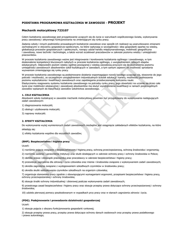 PODSTAWA PROGRAMOWA KSZTAŁCENIA W ZAWODZIE - PROJEKT Mechanik motocyklowy 723107 Celem kształcenia zawodowego jest przygotowanie uczących się do życia w warunkach współczesnego świata, wykonywania pracy zawodowej i aktywnego funkcjonowania na zmieniającym się rynku pracy. Zadania szkoły i innych podmiotów prowadzących kształcenie zawodowe oraz sposób ich realizacji są uwarunkowane zmianami zachodzącymi w otoczeniu gospodarczo-społecznym, na które wpływają w szczególności: idea gospodarki opartej na wiedzy, globalizacja procesów gospodarczych i społecznych, rosnący udział handlu międzynarodowego, mobilność geograficzna i zawodowa, nowe techniki i technologie, a także wzrost oczekiwań pracodawców w zakresie poziomu wiedzy i umiejętności pracowników. W procesie kształcenia zawodowego ważne jest integrowanie i korelowanie kształcenia ogólnego i zawodowego, w tym doskonalenie kompetencji kluczowych nabytych w procesie kształcenia ogólnego, z uwzględnieniem niższych etapów edukacyjnych. Odpowiedni poziom wiedzy ogólnej powiązanej z wiedzą zawodową przyczyni się do podniesienia poziomu umiejętności zawodowych absolwentów szkół kształcących w zawodach, a tym samym zapewni im możliwość sprostania wyzwaniom zmieniającego się rynku pracy. W procesie kształcenia zawodowego są podejmowane działania wspomagające rozwój każdego uczącego się, stosownie do jego potrzeb i możliwości, ze szczególnym uwzględnieniem indywidualnych ścieżek edukacji i kariery, możliwości podnoszenia poziomu wykształcenia i kwalifikacji zawodowych oraz zapobiegania przedwczesnemu kończeniu nauki. Elastycznemu reagowaniu systemu kształcenia zawodowego na potrzeby rynku pracy, jego otwartości na uczenie się przez całe życie oraz mobilności edukacyjnej i zawodowej absolwentów ma służyć wyodrębnienie kwalifikacji w ramach poszczególnych zawodów wpisanych do klasyfikacji zawodów szkolnictwa zawodowego. 1. CELE KSZTAŁCENIA Absolwent szkoły kształcącej w zawodzie mechanik motocyklowy powinien być przygotowany do wykonywania następujących zadań zawodowych: 1) diagnozowania motocykli; 2) obsługi i użytkowania motocykli; 3) naprawy motocykli. 2. EFEKTY KSZTAŁCENIA Do wykonywania wyżej wymienionych zadań zawodowych niezbędne jest osiągnięcie zakładanych efektów kształcenia, na które składają się: 1) efekty kształcenia wspólne dla wszystkich zawodów; (BHP). Bezpieczeństwo i higiena pracy Uczeń: 1) rozróżnia pojęcia związane z bezpieczeństwem i higieną pracy, ochroną przeciwpożarową, ochroną środowiska i ergonomią; 2) rozróżnia zadania i uprawnienia instytucji oraz służb działających w zakresie ochrony pracy i ochrony środowiska w Polsce; 3) określa prawa i obowiązki pracownika oraz pracodawcy w zakresie bezpieczeństwa i higieny pracy; 4) przewiduje zagrożenia dla zdrowia i życia człowieka oraz mienia i środowiska związane z wykonywaniem zadań zawodowych; 5) określa zagrożenia związane z występowaniem szkodliwych czynników w środowisku pracy; 6) określa skutki oddziaływania czynników szkodliwych na organizm człowieka; 7) organizuje stanowisko pracy zgodnie z obowiązującymi wymaganiami ergonomii, przepisami bezpieczeństwa i higieny pracy, ochrony przeciwpożarowej i ochrony środowiska; 8) stosuje środki ochrony indywidualnej i zbiorowej podczas wykonywania zadań zawodowych; 9) przestrzega zasad bezpieczeństwa i higieny pracy oraz stosuje przepisy prawa dotyczące ochrony przeciwpożarowej i ochrony środowiska; 10) udziela pierwszej pomocy poszkodowanym w wypadkach przy pracy oraz w stanach zagrożenia zdrowia i życia. (PDG). Podejmowanie i prowadzenie działalności gospodarczej Uczeń: 1) stosuje pojęcia z obszaru funkcjonowania gospodarki rynkowej; 2) stosuje przepisy prawa pracy, przepisy prawa dotyczące ochrony danych osobowych oraz przepisy prawa podatkowego i prawa autorskiego; 3) stosuje przepisy prawa dotyczące prowadzenia działalności gospodarczej; 4) rozróżnia przedsiębiorstwa i instytucje występujące w branży i powiązania między nimi; 5) analizuje działania prowadzone przez przedsiębiorstwa funkcjonujące w branży; 6) inicjuje wspólne przedsięwzięcia z różnymi przedsiębiorstwami z branży; 7) przygotowuje dokumentację niezbędną do uruchomienia i prowadzenia działalności gospodarczej; 8) prowadzi korespondencję związaną z prowadzeniem działalności gospodarczej; 9) obsługuje urządzenia biurowe oraz stosuje programy komputerowe wspomagające prowadzenie działalności gospodarczej; 10) planuje i podejmuje działania marketingowe prowadzonej działalności gospodarczej; 11) optymalizuje koszty i przychody prowadzonej działalności gospodarczej. (JOZ). Język obcy ukierunkowany zawodowo Uczeń: 1) posługuje się zasobem środków językowych (leksykalnych, gramatycznych, ortograficznych oraz fonetycznych), umożliwiających realizację zadań zawodowych; 2) interpretuje wypowiedzi dotyczące wykonywania typowych czynności zawodowych artykułowane powoli i wyraźnie, w standardowej odmianie języka; 3) analizuje i interpretuje krótkie teksty pisemne dotyczące wykonywania typowych czynności zawodowych; 4) formułuje krótkie i zrozumiałe wypowiedzi oraz teksty pisemne umożliwiające komunikowanie się w środowisku pracy; 5) korzysta z obcojęzycznych źródeł informacji. (KPS). Kompetencje personalne i społeczne Uczeń: 1) przestrzega zasad kultury i etyki; 2) jest kreatywny i konsekwentny w realizacji zadań; 3) przewiduje skutki podejmowanych działań; 4) jest otwarty na zmiany; 5) potrafi radzić sobie ze stresem; 6) aktualizuje wiedzę i doskonali umiejętności zawodowe; 7) przestrzega tajemnicy zawodowej; 8) potrafi ponosić odpowiedzialność za podejmowane działania; 9) potrafi negocjować warunki porozumień; 10) współpracuje w zespole. 2) efekty kształcenia wspólne dla zawodów w ramach obszaru elektryczno-elekt