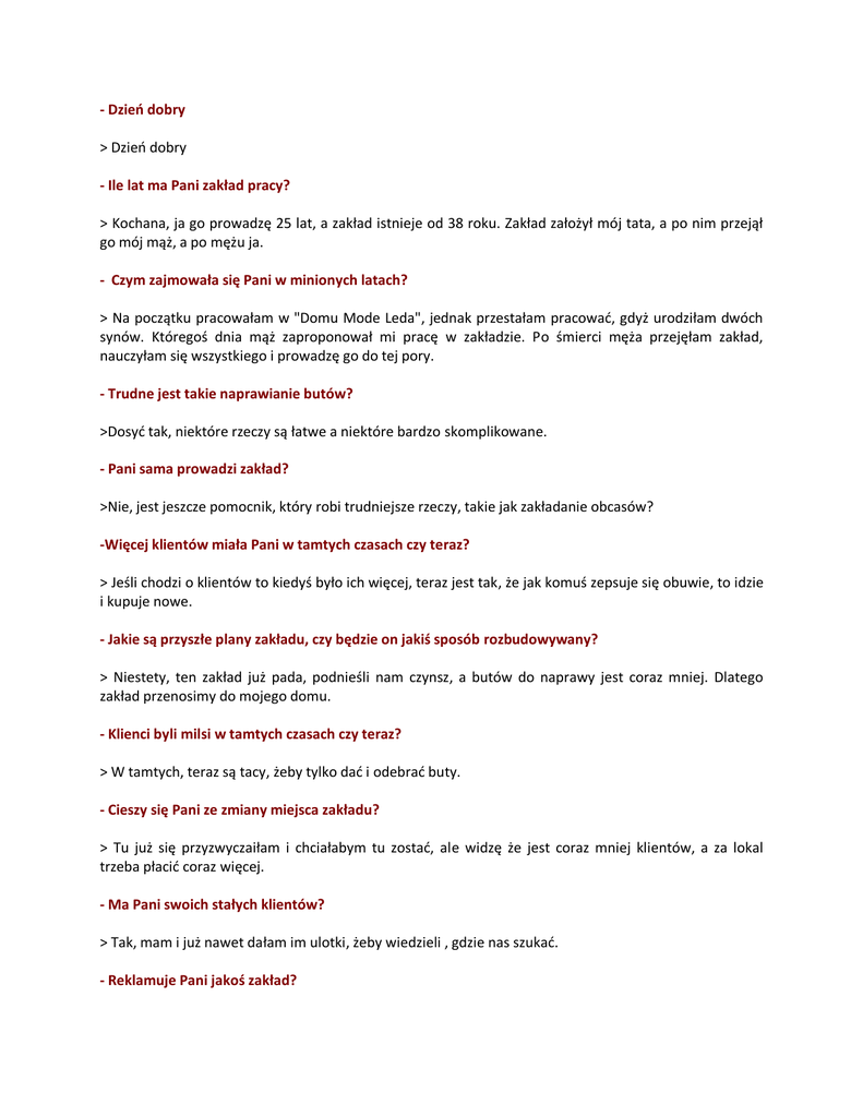 - Dzień dobry > Dzień dobry - Ile lat ma Pani zakład pracy? > Kochana, ja go prowadzę 25 lat, a zakład istnieje od 38 roku. Zakład założył mój tata, a po nim przejął go mój mąż, a po mężu ja. - Czym zajmowała się Pani w minionych latach? > Na początku pracowałam w "Domu Mode Leda", jednak przestałam pracować, gdyż urodziłam dwóch synów. Któregoś dnia mąż zaproponował mi pracę w zakładzie. Po śmierci męża przejęłam zakład, nauczyłam się wszystkiego i prowadzę go do tej pory. - Trudne jest takie naprawianie butów? >Dosyć tak, niektóre rzeczy są łatwe a niektóre bardzo skomplikowane. - Pani sama prowadzi zakład? >Nie, jest jeszcze pomocnik, który robi trudniejsze rzeczy, takie jak zakładanie obcasów? -Więcej klientów miała Pani w tamtych czasach czy teraz? > Jeśli chodzi o klientów to kiedyś było ich więcej, teraz jest tak, że jak komuś zepsuje się obuwie, to idzie i kupuje nowe. - Jakie są przyszłe plany zakładu, czy będzie on jakiś sposób rozbudowywany? > Niestety, ten zakład już pada, podnieśli nam czynsz, a butów do naprawy jest coraz mniej. Dlatego zakład przenosimy do mojego domu. - Klienci byli milsi w tamtych czasach czy teraz? > W tamtych, teraz są tacy, żeby tylko dać i odebrać buty. - Cieszy się Pani ze zmiany miejsca zakładu? > Tu już się przyzwyczaiłam i chciałabym tu zostać, ale widzę że jest coraz mniej klientów, a za lokal trzeba płacić coraz więcej. - Ma Pani swoich stałych klientów? > Tak, mam i już nawet dałam im ulotki, żeby wiedzieli , gdzie nas szukać. - Reklamuje Pani jakoś zakład? > Tak, czasami zatrudniam kogoś, by roznosił ulotki. - Żałuje Pani ciężko przepracowanych lat? > Nie, naprawianie butów sprawia mi przyjemność, to moje hobby. - A zdarza się tak, że ktoś oddaje i nie odbiera butów? > Tak, nawet bardzo często. Zdarzyło się nawet, że Pani po dwóch latach przyszła odebrać buty, a w przepisach jest wyraźnie napisane, że po 6 miesiącach, szewc może wyrzucić buty. - Skąd bierze Pani materiały potrzebne do naprawy? > Ze specjalnej firmy znajdującej się Częstochowie. - Czy chciałaby Pani może coś od siebie dodać na koniec? > Ten zakład jest dla mnie bardzo ważny, chciałabym, żeby po mnie przejęli go moi synowie, a później ich dzieci. - Dziękujemy bardzo, że poświęciła nam Pani chwilkę. > Ja również dziękuje. Wywiad przeprowadziły Aleksandra Kuczmarska i Paulina Kwiatkowska uczennice klasy 1g3 Technikum Gastronomiczno-Hotelarskiego nr 2 im. prof. Stanisława Bergera w Warszawie.