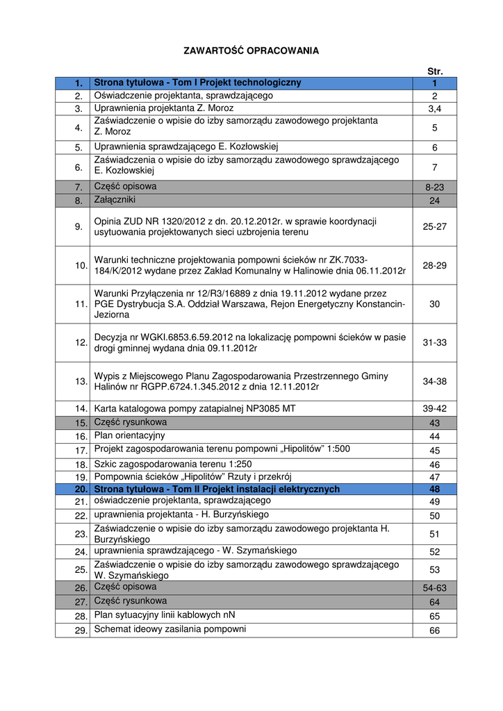 ZAWARTOŚĆ OPRACOWANIA 1. 2. 3. 4. Strona tytułowa - Tom I Projekt technologiczny Oświadczenie projektanta, sprawdzającego Uprawnienia projektanta Z. Moroz Zaświadczenie o wpisie do izby samorządu zawodowego projektanta Z. Moroz Str. 1 2 3,4 5 6. Uprawnienia sprawdzającego E. Kozłowskiej Zaświadczenia o wpisie do izby samorządu zawodowego sprawdzającego E. Kozłowskiej 7. 8. Część opisowa Załączniki 8-23 24 9. Opinia ZUD NR 1320/2012 z dn. 20.12.2012r. w sprawie koordynacji usytuowania projektowanych sieci uzbrojenia terenu 25-27 10. Warunki techniczne projektowania pompowni ścieków nr ZK.7033184/K/2012 wydane przez Zakład Komunalny w Halinowie dnia 06.11.2012r 28-29 5. Warunki Przyłączenia nr 12/R3/16889 z dnia 19.11.2012 wydane przez 11. PGE Dystrybucja S.A. Oddział Warszawa, Rejon Energetyczny KonstancinJeziorna 6 7 30 12. Decyzja nr WGKI.6853.6.59.2012 na lokalizację pompowni ścieków w pasie drogi gminnej wydana dnia 09.11.2012r 31-33 13. Wypis z Miejscowego Planu Zagospodarowania Przestrzennego Gminy Halinów nr RGPP.6724.1.345.2012 z dnia 12.11.2012r 34-38 14. Karta katalogowa pompy zatapialnej NP3085 MT 15. Część rysunkowa 16. Plan orientacyjny 17. Projekt zagospodarowania terenu pompowni „Hipolitów” 1:500 18. 19. 20. 21. Szkic zagospodarowania terenu 1:250 Pompownia ścieków „Hipolitów” Rzuty i przekrój Strona tytułowa - Tom II Projekt instalacji elektrycznych oświadczenie projektanta, sprawdzającego 22. uprawnienia projektanta - H. Burzyńskiego Zaświadczenie o wpisie do izby samorządu zawodowego projektanta H. 23. Burzyńskiego 24. uprawnienia sprawdzającego - W. Szymańskiego Zaświadczenie o wpisie do izby samorządu zawodowego sprawdzającego W. Szymańskiego 26. Część opisowa 27. Część rysunkowa 25. 28. Plan sytuacyjny linii kablowych nN 29. Schemat ideowy zasilania pompowni 39-42 43 44 45 46 47 48 49 50 51 52 53 54-63 64 65 66 30. Schemat elektroenergetyczny rozdzielnicy RP 31. Schemat sterowania pompy ścieków P1 67 32. Schemat sterowania pompy ścieków P2 33. Schemat sygnalizacji i pomiaru poziomów 69 68 70 34. Schemat sterowania - wejścia/wyjścia 35. Rozdzielni RP - widok wnętrza 71 36. Rozdzielnica RP - widok drzwi wewnętrznych 37. Plan instalacji elektrycznych w pompowni ścieków 73 38. Dokumentacja badań podłoża gruntowego 39. BIOZ 72 74 75-84 85-88