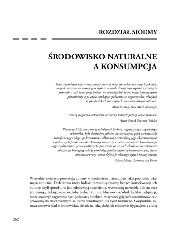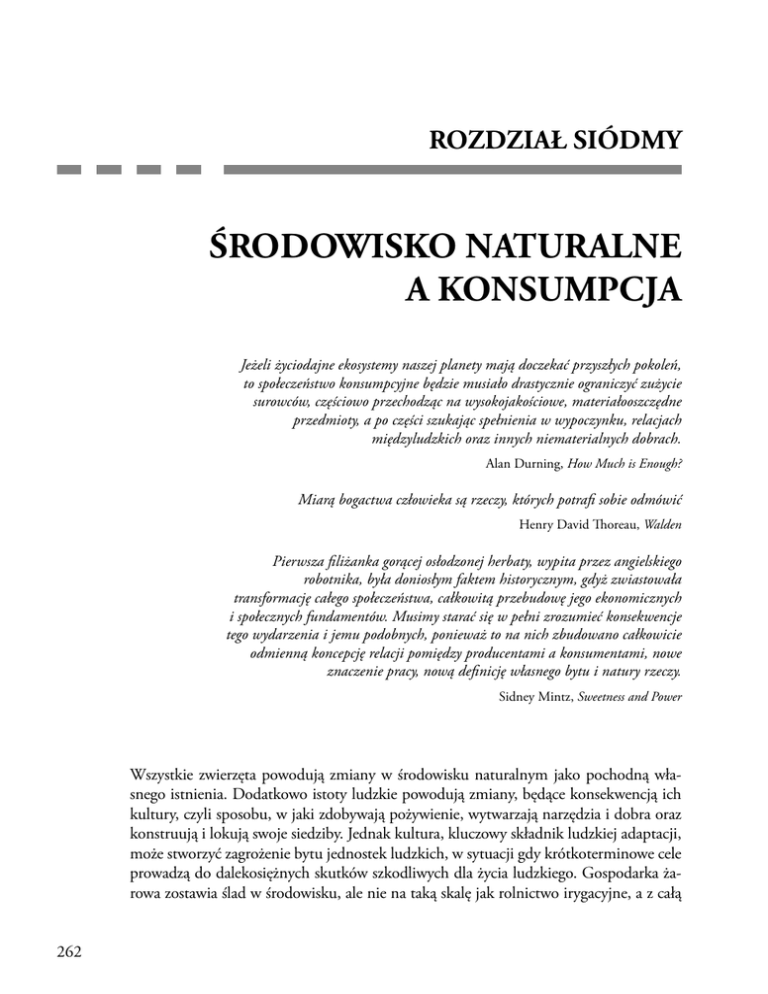 ROZDZIAŁ SIÓDMY ŚRODOWISKO NATURALNE A KONSUMPCJA Jeżeli życiodajne ekosystemy naszej planety mają doczekać przyszłych pokoleń, to społeczeństwo konsumpcyjne będzie musiało drastycznie ograniczyć zużycie surowców, częściowo przechodząc na wysokojakościowe, materiałooszczędne przedmioty, a po części szukając spełnienia w wypoczynku, relacjach międzyludzkich oraz innych niematerialnych dobrach. Alan Durning, How Much is Enough? Miarą bogactwa człowieka są rzeczy, których potrafi sobie odmówić Henry David Thoreau, Walden Pierwsza filiżanka gorącej osłodzonej herbaty, wypita przez angielskiego robotnika, była doniosłym faktem historycznym, gdyż zwiastowała transformację całego społeczeństwa, całkowitą przebudowę jego ekonomicznych i społecznych fundamentów. Musimy starać się w pełni zrozumieć konsekwencje tego wydarzenia i jemu podobnych, ponieważ to na nich zbudowano całkowicie odmienną koncepcję relacji pomiędzy producentami a konsumentami, nowe znaczenie pracy, nową definicję własnego bytu i natury rzeczy. Sidney Mintz, Sweetness and Power Wszystkie zwierzęta powodują zmiany w środowisku naturalnym jako pochodną własnego istnienia. Dodatkowo istoty ludzkie powodują zmiany, będące konsekwencją ich kultury, czyli sposobu, w jaki zdobywają pożywienie, wytwarzają narzędzia i dobra oraz konstruują i lokują swoje siedziby. Jednak kultura, kluczowy składnik ludzkiej adaptacji, może stworzyć zagrożenie bytu jednostek ludzkich, w sytuacji gdy krótkoterminowe cele prowadzą do dalekosiężnych skutków szkodliwych dla życia ludzkiego. Gospodarka żarowa zostawia ślad w środowisku, ale nie na taką skalę jak rolnictwo irygacyjne, a z całą 262 ROZDZIAŁ SIÓDMY ŚRODOWISKO NATURALNE A KONSUMPCJA 263 pewnością nie tak wszechobecny jak współczesne rolnictwo, wykorzystujące nawozy sztuczne, pestycydy i herbicydy. Udomowione zwierzęta niewątpliwie nie są obojętne dla przyrody, ale hodowla kilku sztuk bydła do prac polowych albo kilku krów do produkcji przetworów mlecznych wywołuje dużo mniejsze szkody niż wypas ogromnych stad z myślą o konsumentach, pozostających na diecie opartej głównie na mięsie. Na zakres, w jakim środowisko naturalne podlega zmianie i degradacji, ma wpływ po części liczebność populacji, a po części rodzaj stosowanej techniki. Oczywiste jest, że im więcej ludzi znajduje się na danym obszarze, tym większe niebezpieczeństwo powstania szkód dla środowiska. Ciągniki i buldożery przekształcają środowisko w większym stopniu niż motyki i pługi. Jednak najważniejszym czynnikiem zmian środowiskowych – z punktu widzenia zużycia surowców naturalnych, wykorzystania sztucznych źródeł energii i produkcji odpadów – jest konsumpcja. Z powodu rozmiarów naszej konsumpcji przeciętne amerykańskie dziecko powoduje dwukrotnie większe zniszczenie środowiska niż dziecko szwedzkie, trzykrotnie większe niż dziecko włoskie, trzynaście razy większe niż brazylijskie, trzydzieści pięć razy większe niż indyjskie, dwieście osiemdziesiąt razy większe od dziecka z Czadu lub Haiti (Kennedy 1993:32). Same tylko Stany Zjednoczone zużywają jedną czwartą światowej energii i odpowiadają za jedną czwartą światowej emisji związków węgla wpływających na globalne ocieplenie (zob. tabela 7.1). Stany Zjednoczone i Kanada mają najwyższy wskaźnik zużycia energii i emisji związków węgla w przeliczeniu na głowę mieszkańca ze wszystkich krajów świata. Są też państwami najbardziej sprzeciwiającymi się wprowadzeniu w życie protokołu z Kioto, międzynarodowego porozumienia, wynegocjowanego w 1992 r., a dotyczącego redukcji światowej emisji związków węgla do poziomu z 1990 r. Mathis Wackernagel i William Rees (1996) szacują, że potrzeba 4–6 ha ziemi, aby zabezpieczyć poziom konsumpcji przeciętnego mieszkańca wysoko uprzemysłowionego kraju. Problem polega na tym, że w 1990 r. na całym świecie było tylko 1,7 ha ekologicznie produktywnej ziemi w przeliczeniu na jednego mieszkańca. Autorzy doszli do wniosku, że wspomniany deficyt jest kompensowany przez kraje centrum dzięki wykorzystywaniu własnych surowców naturalnych i eksploatowaniu zasobów krajów peryferyjnych na drodze wymiany handlowej. Innymi słowy, ktoś musi zapłacić za nasz poziom konsumpcji i będą to albo nasze dzieci, albo mieszkańcy terenów peryferyjnych systemu światowego. Najwyraźniej konsumpcja dóbr stanowi pochodną naszej kultury. Kapitalizm w swojej obecnej postaci funkcjonuje wyłącznie dzięki wytwarzaniu i sprzedaży przedmiotów i usług. Im więcej się produkuje i im więcej kupuje, tym większy mamy postęp i dostatek. Najważniejszym wskaźnikiem wzrostu gospodarczego jest produkt narodowy brutto (PNB), suma wszystkich dóbr i usług, wyprodukowanych przez mieszkańców danego kraju w określonym roku. Inaczej mówiąc, jest to miara sukcesu danego społeczeństwa konsumpcyjnego w zakresie… konsumpcji rzecz jasna. Wytwarzanie, przetwarzanie i konsumpcja dóbr wymagają jednak pozyskiwania i zużywania surowców naturalnych (drewna, rud, paliw kopalnych czy wody), a także 274,50 1200 .00 146.00 126,10 82,80 1000 .00 31,30 59.00 59,10 57,60 171,90 100,30 216,10 113,80 125.00 12,30 2,83 96,10 33,90 26,00 21,30 13,80 12,50 11,90 10,00 9,80 8,00 8,10 5,90 3,60 1,00 0,40 0,10 0,02 25.000 8,900 6,900 5,600 3,600 3,300 3,100 2,600 2,600 2,100 2,100 1,600 1,000 0,300 0,100 0,030 0,006 % ŚWIATOWEJ KONSUMPCJI 350,70 27,00 177,30 168,40 168,60 12,90 391,00 170,00 165,30 139,00 50,00 59,10 17,70 9,00 3,30 10,60 8,27 KONSUMPCJA PER CAPITA (W MLN BTU) 1552 .0 740,4 405,0 288,5 227,5 252,6 138,5 106,6 147,4 120,0 84,5 95,0 67,8 27,1 6,4 1,9 1,1 CAŁKOWITA EMISJA ZWIĄZKÓW WĘGLA (W MLN TON) 25.000 12,100 6,600 4,700 3,700 4,100 2,300 1,700 2,400 2,000 1,400 1,500 1,100 0,400 0,100 0,030 0,018 % ŚWIATOWEJ EMISJI 5,50 0,60 2,80 2,30 2,80 0,30 4,60 1,