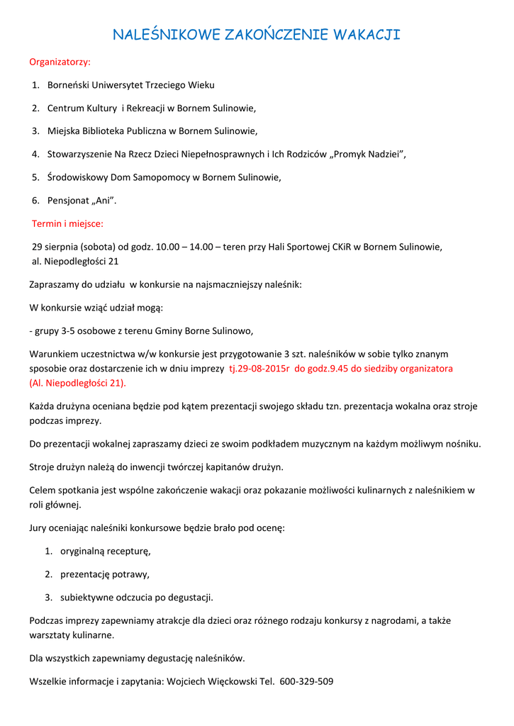 NALEŚNIKOWE ZAKOŃCZENIE WAKACJI Organizatorzy: 1. Borneński Uniwersytet Trzeciego Wieku 2. Centrum Kultury i Rekreacji w Bornem Sulinowie, 3. Miejska Biblioteka Publiczna w Bornem Sulinowie, 4. Stowarzyszenie Na Rzecz Dzieci Niepełnosprawnych i Ich Rodziców „Promyk Nadziei”, 5. Środowiskowy Dom Samopomocy w Bornem Sulinowie, 6. Pensjonat „Ani”. Termin i miejsce: 29 sierpnia (sobota) od godz. 10.00 – 14.00 – teren przy Hali Sportowej CKiR w Bornem Sulinowie, al. Niepodległości 21 Zapraszamy do udziału w konkursie na najsmaczniejszy naleśnik: W konkursie wziąć udział mogą: - grupy 3-5 osobowe z terenu Gminy Borne Sulinowo, Warunkiem uczestnictwa w/w konkursie jest przygotowanie 3 szt. naleśników w sobie tylko znanym sposobie oraz dostarczenie ich w dniu imprezy tj.29-08-2015r do godz.9.45 do siedziby organizatora (Al. Niepodległości 21). Każda drużyna oceniana będzie pod kątem prezentacji swojego składu tzn. prezentacja wokalna oraz stroje podczas imprezy. Do prezentacji wokalnej zapraszamy dzieci ze swoim podkładem muzycznym na każdym możliwym nośniku. Stroje drużyn należą do inwencji twórczej kapitanów drużyn. Celem spotkania jest wspólne zakończenie wakacji oraz pokazanie możliwości kulinarnych z naleśnikiem w roli głównej. Jury oceniając naleśniki konkursowe będzie brało pod ocenę: 1. oryginalną recepturę, 2. prezentację potrawy, 3. subiektywne odczucia po degustacji. Podczas imprezy zapewniamy atrakcje dla dzieci oraz różnego rodzaju konkursy z nagrodami, a także warsztaty kulinarne. Dla wszystkich zapewniamy degustację naleśników. Wszelkie informacje i zapytania: Wojciech Więckowski Tel. 600-329-509