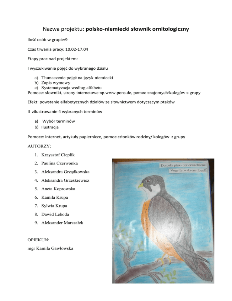 Nazwa projektu: polsko-niemiecki słownik ornitologiczny Ilośd osób w grupie:9 Czas trwania pracy: 10.02-17.04 Etapy prac nad projektem: I wyszukiwanie pojęd do wybranego działu a) Tłumaczenie pojęć na język niemiecki b) Zapis wymowy c) Systematyzacja według alfabetu Pomoce: słowniki, strony internetowe np.www.pons.de, pomoc znajomych/kolegów z grupy Efekt: powstanie alfabetycznych działów ze słownictwem dotyczącym ptaków II zilustrowanie 4 wybranych terminów a) Wybór terminów b) Ilustracja Pomoce: internet, artykuły papiernicze, pomoc członków rodziny/ kolegów z grupy AUTORZY: 1. Krzysztof Cieplik 2. Paulina Czerwonka 3. Aleksandra Grządkowska 4. Aleksandra Grześkiewicz 5. Aneta Koprowska 6. Kamila Krupa 7. Sylwia Krupa 8. Dawid Leboda 9. Aleksander Marszałek OPIEKUN: mgr Kamila Gawłowska