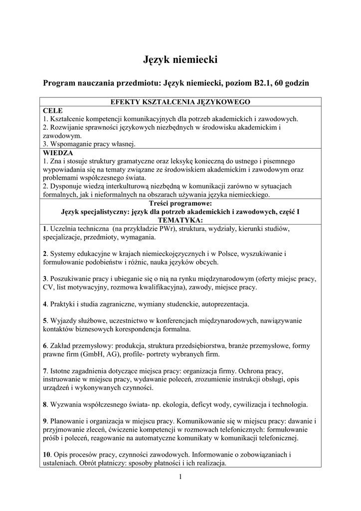 Język niemiecki Program nauczania przedmiotu: Język niemiecki, poziom B2.1, 60 godzin EFEKTY KSZTAŁCENIA JĘZYKOWEGO CELE 1. Kształcenie kompetencji komunikacyjnych dla potrzeb akademickich i zawodowych. 2. Rozwijanie sprawności językowych niezbędnych w środowisku akademickim i zawodowym. 3. Wspomaganie pracy własnej. WIEDZA 1. Zna i stosuje struktury gramatyczne oraz leksykę konieczną do ustnego i pisemnego wypowiadania się na tematy związane ze środowiskiem akademickim i zawodowym oraz problemami współczesnego świata. 2. Dysponuje wiedzą interkulturową niezbędną w komunikacji zarówno w sytuacjach formalnych, jak i nieformalnych na obszarach używania języka niemieckiego. Treści programowe: Język specjalistyczny: język dla potrzeb akademickich i zawodowych, część I TEMATYKA: 1. Uczelnia techniczna (na przykładzie PWr), struktura, wydziały, kierunki studiów, specjalizacje, przedmioty, wymagania. 2. Systemy edukacyjne w krajach niemieckojęzycznych i w Polsce, wyszukiwanie i formułowanie podobieństw i różnic, nauka języków obcych. 3. Poszukiwanie pracy i ubieganie się o nią na rynku międzynarodowym (oferty miejsc pracy, CV, list motywacyjny, rozmowa kwalifikacyjna), zawody, miejsce pracy. 4. Praktyki i studia zagraniczne, wymiany studenckie, autoprezentacja. 5. Wyjazdy służbowe, uczestnictwo w konferencjach międzynarodowych, nawiązywanie kontaktów biznesowych korespondencja formalna. 6. Zakład przemysłowy: produkcja, struktura przedsiębiorstwa, branże przemysłowe, formy prawne firm (GmbH, AG), profile- portrety wybranych firm. 7. Istotne zagadnienia dotyczące miejsca pracy: organizacja firmy. Ochrona pracy, instruowanie w miejscu pracy, wydawanie poleceń, zrozumienie instrukcji obsługi, opis urządzeń i wykonywanych czynności. 8. Wyzwania współczesnego świata- np. ekologia, deficyt wody, cywilizacja i technologia. 9. Planowanie i organizacja w miejscu pracy. Komunikowanie się w miejscu pracy: dawanie i przyjmowanie zleceń, ćwiczenie kompetencji w rozmowach telefonicznych: formułowanie próśb i poleceń, reagowanie na automatyczne komunikaty w komunikacji telefonicznej. 10. Opis procesów pracy, czynności zawodowych. Informowanie o zobowiązaniach i ustaleniach. Obrót płatniczy: sposoby płatności i ich realizacja. 1 11. Poszukiwanie optymalnych rozwiązań w miejscu pracy: proponowanie ulepszeń i ich realizacja. Znajdowanie usterek zaburzających proces pracy i ich usuwanie. Nieporozumienia i problemy w miejscu pracy. MATERIAŁ LEKSYKALNO-GRAMATYCZNY 1. Powtórzenie czasów (opcjonalnie w razie trudności na zajęciach) 2. Zdania podrzędnie złożone: dopełnieniowe, czasowe, warunkowe, okolicznikowe sposobu, przydawkowe 3. Spójniki wieloczłonowe 4. Strona bierna (Passiv) 5. Tryb przypuszczający (Konjunktiv II) 6. Bezokolicznik z zu oraz konstrukcje bezokolicznikowe 7. Słowotwórstwo, np. rola przedrostka i końcówek w tworzeniu nowych wyrazów OBOWIĄZKOWE PODRĘCZNIKI I MATERIAŁY DODATKOWE OBOWIĄZUJĄCE PODRĘCZNIKI: 1. Unternehmen Deutsch B2, Aufbaukurs lekcje 1,2,3,4,5,10, wyd. Klett, LITERATURA UZUPEŁNIAJĄCA: 1. Wirtualne Środowisko Nauki, www.wsn.pwr.edu.pl 2. Język obcy w środowisku pracy inżyniera, Projekt SJO 3. Repetytorium gramatyczno-leksykalne B1, Projekt e-learning SJO 4. Grammatik? Kein Problem cz. II i III, E. Tomiczek, E. Reymont, wyd. Jubi 5. Alles klar – Grammatik, wyd. WSiP UMIEJĘTNOŚCI w zakresie działań językowych (sprawności): Słuchania: Rozpoznaje formalny i nieformalny rejestr wypowiedzi na tematy akademickie oraz nadąża ze zrozumieniem np. wykładów, wystąpień dyskusji między użytkownikami danego języka. Czytania: Posługuje się umiejętnością ogólnego i selektywnego czytania ze zrozumieniem tekstów o tematyce akademickiej i zawodowej (z wykorzystaniem słowników tradycyjnych i/lub internetowych). Mówienia: Dysponuje odpowiednim zasobem środków językowych, aby wypowiadać się na zadany temat, formułować i uzasadniać opinie, wyjaśniać swoje stanowisko, przedstawiać wady i zalety różnych rozwiązań. Pisania: Pisze teksty typowe dla środowiska akademickiego (np.: pisma, opisy, streszczenia); prowadzi korespondencję przy zachowaniu odpowiednich reguł rejestru formalnego i nieformalnego. KOMPETENCJE SPOŁECZNE Dysponuje umiejętnością stosowania wiedzy z uwzględnieniem kultury obcej; ma świadomość potrzeb językowych niezbędnych w międzynarodowym środowisku akademickim i zawodowym. 2 Program nauczania przedmiotu: Język niemiecki, poziom B2.2, 60 godzin EFEKTY KSZTAŁCENIA JĘZYKOWEGO CELE: 1. Kształcenie i rozwijanie kompetencji komunikacyjnych dla potrzeb zawodowych w obszarze nauk technicznych. 2. Doskonalenie sprawności językowych obejmujących język specjalistyczny. 3. Wspieranie pracy własnej. WIEDZA: 1. Ma wiedzę, umiejętności i kompetencje zgodne z wymaganiami określonymi dla poziomu B2 ESOKJ (CEFR). 2. Zna i stosuje struktury gramatyczne oraz zasób leksykalny w zakresie języka specjalistycznego właściwego dla studiowanej dyscypliny, a także wiedzę na temat kultury zachowań w obszarze używania języka fachowego. Treści programowe: Język specjalistyczny: język dla potrzeb akademickich i zawodowych, część II TEMATYKA: 1. Dokumenty dotyczące środowiska pracy (świadectwa pracy, ocena pracownicza, opinie przełożonych). Kadra kierownicza: określanie celów, motywowanie, ocena. Czas pracy, wynagrodzenie, podatki, ubezpieczenia społeczne w krajach niemieckojęzycznych i w Europie. 2. Omawianie strategii działania w miejscu pracy, proponowanie i ustalanie celów i środków. Przedstawianie możliwych rozwiązań, zestawianie ich wad i zalet. Aktywne uczestniczenie w różnych formach pracy na seminariach i konferencjach: logiczne argumentowanie, dyskutowanie pro i contra, reagowanie na wypowiedzi innych, umiejętny podział zadań w zespole. 3. Prezentowanie produktów i technologii na targach branżowych. Op