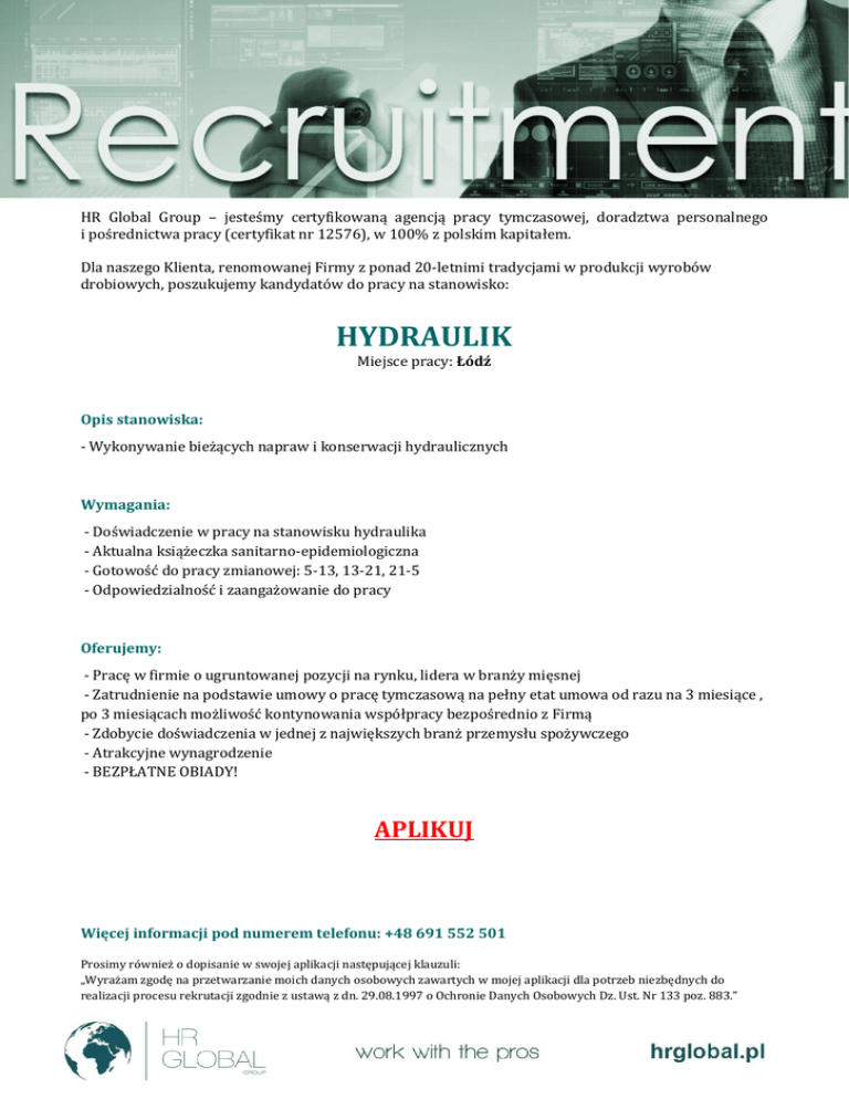 HR Global Group – jesteśmy certyfikowaną agencją pracy tymczasowej, doradztwa personalnego i pośrednictwa pracy (certyfikat nr 12576), w 100% z polskim kapitałem. Dla naszego Klienta, renomowanej Firmy z ponad 20-letnimi tradycjami w produkcji wyrobów drobiowych, poszukujemy kandydatów do pracy na stanowisko: HYDRAULIK Miejsce pracy: Łódź Opis stanowiska: - Wykonywanie bieżących napraw i konserwacji hydraulicznych Wymagania: - Doświadczenie w pracy na stanowisku hydraulika - Aktualna książeczka sanitarno-epidemiologiczna - Gotowość do pracy zmianowej: 5-13, 13-21, 21-5 - Odpowiedzialność i zaangażowanie do pracy Oferujemy: - Pracę w firmie o ugruntowanej pozycji na rynku, lidera w branży mięsnej - Zatrudnienie na podstawie umowy o pracę tymczasową na pełny etat umowa od razu na 3 miesiące , po 3 miesiącach możliwość kontynowania współpracy bezpośrednio z Firmą - Zdobycie doświadczenia w jednej z największych branż przemysłu spożywczego - Atrakcyjne wynagrodzenie - BEZPŁATNE OBIADY! APLIKUJ Więcej informacji pod numerem telefonu: +48 691 552 501 Prosimy również o dopisanie w swojej aplikacji następującej klauzuli: „Wyrażam zgodę na przetwarzanie moich danych osobowych zawartych w mojej aplikacji dla potrzeb niezbędnych do realizacji procesu rekrutacji zgodnie z ustawą z dn. 29.08.1997 o Ochronie Danych Osobowych Dz. Ust. Nr 133 poz. 883.”