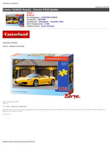 Informacje o produkcie Utworzono 02-03-2017 Castor 010035 Puzzle - Ferrari F430 Spider Cena : 8,50 zł Nr katalogowy : CASTOR.010035 Producent : CASTOR Dostępność : Dostępny - wysyłka 24h! Stan magazynowy : niski Średnia ocena : brak recenzji CASTOR 010035 PUZZLE - FERRARI F430 SPIDER Numer katalogowy: 010035 Wiek: 6+ Stan: nowe - oryginalnie zapakowane Układanie puzzli to twórcza rozrywka bez względu na wiek. Rozwija spostrzegawczość, uczy wytrwałości i ćwiczy koncentrację. Jest wyzwaniem, z którym można zmagać się w pojedynkę lub w większym gronie. 23 x 16,5 cm Wygenerowano w programie www.oscGold.com Dostępność w salonach: Ilość sztuk: Sklep - Złotniki: 1 Sklep - zlikwidowany: 0 Sklep - Szczepankowo: 1 Dostępne opcje Castor 010035 Puzzle - Ferrari F430 Spider » Wiek: 5 - 7 lat, 8 - 11 lat, 12 lat i więcej.