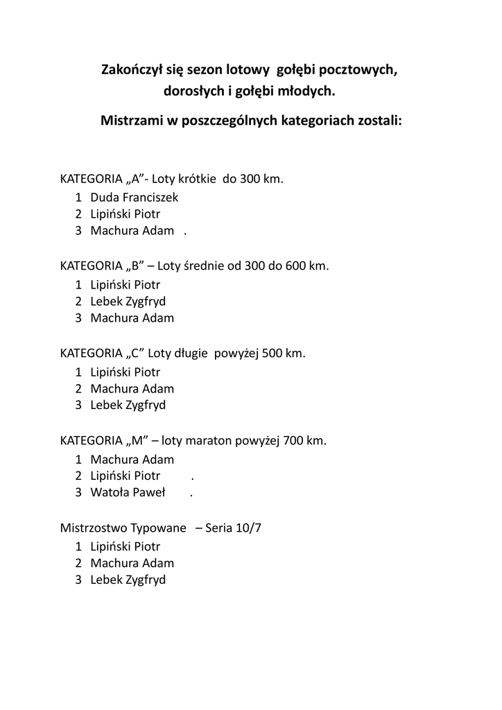 Zakończył się sezon lotowy gołębi pocztowych, dorosłych i gołębi młodych. Mistrzami w poszczególnych kategoriach zostali: KATEGORIA „A”- Loty krótkie do 300 km. 1 Duda Franciszek 2 Lipiński Piotr 3 Machura Adam . KATEGORIA „B” – Loty średnie od 300 do 600 km. 1 Lipiński Piotr 2 Lebek Zygfryd 3 Machura Adam KATEGORIA „C” Loty długie powyżej 500 km. 1 Lipiński Piotr 2 Machura Adam 3 Lebek Zygfryd KATEGORIA „M” – loty maraton powyżej 700 km. 1 Machura Adam 2 Lipiński Piotr . 3 Watoła Paweł . Mistrzostwo Typowane – Seria 10/7 1 Lipiński Piotr 2 Machura Adam 3 Lebek Zygfryd Najlepszy gołąb dorosły- samiec 1 Helisz Eugeniusz – PL-0263-13-9762 2 Machura Adam – PL-0382-123 Watoła Paweł – PL-0382-13-1273 Najlepszy gołąb dorosły - samica 1 Machura Adam – PL-0161-14-5254 2 Lipiński Piotr – PL-0161-14-6107 3 Lipiński Piotr – PL-0382-12-3839 Najlepszy roczny gołąb- samiec 1 Lebek Zygfryd – PL-0161-15-414 2 Machura Adam – PL-0161-15-1050 3 Machura Adam – PL-0161-15-1039 Najlepszy gołąb roczny- samica 1 Lipiński Piotr – PL-0161-15-550 2 Lipiński Piotr – PL-0161-15-536 3 Lipiński Piotr – PL-0161-15-589 Mistrzostwo gołębi młodych 2016 Typowane 15/8 1 Machura Adam 2 Kocyba Andrzej i Alicja 3 Lebek Zygfryd – zdobył Najlepsze gołębie młode 2016 1 Machura Adam – PL-0161-16-3325 2 Lebek Zygfryd – PL-0161-16-3598 3 Machura Adam – PL-0161-16-3346 SEKRETARZ KOCYBA ANDRZEJ