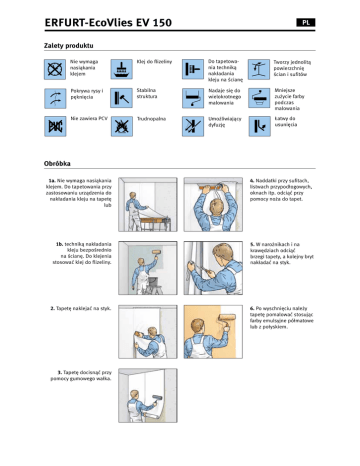 ERFURT-EcoVlies EV 150 PL Zalety produktu Nie wymaga nasiąkania klejem Klej do flizeliny Do tapetowania techniką nakładania kleju na ścianę Tworzy jednolitą powierzchnię ścian i sufitów Pokrywa rysy i pęknięcia Stabilna struktura Nadaje się do wielokrotnego malowania Mniejsze zużycie farby podczas malowania Nie zawiera PCV Trudnopalna Umożliwiający dyfuzję Łatwy do usunięcia Obróbka 1a. Nie wymaga nasiąkania klejem. Do tapetowania przy zastosowaniu urządzenia do nakładania kleju na tapetę lub 4. Naddatki przy sufitach, listwach przypodłogowych, oknach itp. odciąć przy pomocy noża do tapet. 1b. techniką nakładania kleju bezpośrednio na ścianę. Do klejenia stosować klej do flizeliny. 5. W narożnikach i na krawędziach odciąć brzegi tapety, a kolejny bryt nakładać na styk. 2. Tapetę naklejać na styk. 6. Po wyschnięciu należy tapetę pomalować stosując farby emulsyjne półmatowe lub z połyskiem. 3. Tapetę docisnąć przy pomocy gumowego wałka. Instrukcja Techniczna PL Opis produktu Zastosowanie/obróbka Producent Podłoże Erfurt & Sohn KG Hugo-Erfurt-Straße 1 42399 Wuppertal www.erfurt.com Stare, popękane tynki itp., które po uprzednim przygotowaniu będą tylko malowane. Do przygotowania jednolitych powierzchni przed ich malowaniem, np. podłoży mieszanych (tynk, beton elewacyjny lub płyty gipsowokartonowe). Nazwa produktu ERFURT-EcoVlies EV 150 Surowce/produkcja ERFURT-EcoVlies EV 150 to gładka okładzina ścienna wykonana z papieru pochodzącego z recyklingu oraz włókien tekstylnych. Dane produktu · Nr art. do zamówienia 415 · Wymiar rolki: długość 25,00 m x szerokość 0,75 m Do klejenia zalecany jest klej do tapet ciężkich (np. Metylan NP, klej do odnawiania tynków w proporcji 1:10 = 1 kg kleju na 10 l wody lub Metylan NP Power Granulat Plus w proporcji 1:12 = 1kg kleju na 12 l wody lub w przypadku techniki klejenia bezpośrednio na ścianie 1:10 = 1 kg na 10 l wody) lub porównywalny. ERFURT-EcoVlies EV 150 nie wymaga czasu nasiąkania klejem. Tapetę należy naklejać pionowo na styk. Do malowania należy zastosować w zależności od potrzeb farbę emulsyjną o ścieralności na mokro min. wg normy DIN EN 13300. Alternatywnie można pomalować podłoże metodą rozpylania Airless. W takim przypadku należy następnie użyć wałkia krótkim włosiem celem uzyskania optycznie równomiernej powierzchni. · Zawartość kartonu: 4 rolki · Gramatura: ok. 150 g/m2 · Przycięta na krawędziach, opakowana w folię Tapetowane podłoże Właściwości produktu Możliwość przyklejania na gładkiej powierzchni z wszystkimi okładzinami ściennymi. Do klejenia na ERFURT-EcoVlies EV 150 stosowany jest klej przeznaczony dla danej okładziny, jednak przynajmniej specjalny klej w proporcji 1:20 (200 g w 4 l wody). · Dobrze pokrywa kontrasty kolorystczne podłoża · Przepuszczalność pary wodnej wg DIN 52615 odpowiada dyfuzyjnie równoważnej warstwie powietrza wynoszącej 0,02 m · Klasa palności „B-s1,d0“ wg DIN EN 13501-1 odpowiada „B1“ (trudnopalna) wg DIN 4102-1 · Niepalna w połączeniu z podłożem typu płyty gipsowo-kartonowe (DIN 4102-A2) Łatwa do usunięcia Podczas późniejszych remontów okładzina ERFURT-EcoVlies EV 150 pozwala się po zmoczeniu wodą łatwo usunąć. · Nie zawiera PVC, szkodliwych dla zdrowia zmiękczaczy ani rozpuszczalników Komponenty/wyniki bada · Nie zawiera włókna szklanego ERFURT-EcoVlies EV 150 jest regularnie sprawdzana zgodnie z § 30 i § 31 ustawy o żywności i pierwszej potrzeby. · Bez dodatku związków metali ciężkich oraz formaldehydów · Nadaje się do wielokrotnego malowania farbami dostępnymi w sprzedaży · Pokrywająca drobne rysy i pęknięcia · Umożliwiająca dyfuzję pary wodnej · Pozwalająca do oszczędność surowców naturalnych · Wykonana z surowców odnawialnych Oświadczenie o braku zastrzeżeń (20535 U 04 ISEGA- Forschungs- und Untersuchungs-Gesellschaft mbH, Aschaffenburg) potwierdza, że ERFURT-EcoVlies EV 150 spełnia przepisy ustawy o żywności i pierwszej potrzeby oraz 36-te zalecenie Federalnego Urzędu Zdrowia (BGA). Przepuszczalność pary wodnej określona została przez ISEGAForschungs- und Untersuchungs-Gesellschaft mbH, Aschaffenburg, zgodnie z DIN 52615, część 1, w raporcie pokontrolnym nr 1743/32. · Przyjazna dla alergików 07.11 Erfurt & Sohn KG Hugo-Erfurt-Straße 1 D-42399 Wuppertal Tel.: +49 202 61 10-0 Fax: +49 202 61 10-89 451 E-Mail: [email protected] Internet: www.erfurt.com Serviceline: +49 202 61 10-375 DLA TWOICH CZTERECH ŚCIAN