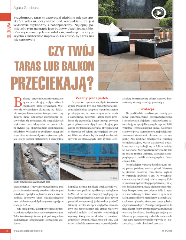 BUDOWA Agata Grudecka Przydomowy taras to zazwyczaj ulubione miejsce spotkań i relaksu, oczywiście pod warunkiem, że jest właściwie wykonany i zabezpieczony. Najlepiej pamiętać o tym na etapie jego budowy. Jeżeli jednak błędów wykonawczych nie udało się uniknąć, należy je szybko i skutecznie naprawić. Co zrobić, by taras nas nie stresował? CZY TWÓJ TARAS LUB BALKON PRZECIEKAJĄ? B alkony i tarasy nieustannie narażane są na destrukcyjny wpływ różnych czynników atmosferycznych. Wieloletnie wystawienie okładziny na działanie skrajnych temperatur, śniegu, mrozu czy deszczu może skutkować przeciekami, pojawieniem się nieestetycznie wyglądających wykwitów oraz odprysków na powierzchni płytek i fug, obluzowaniem i pęknięciami okładziny. Wszystkie te problemy mogą być wynikiem zarówno błędów wykonawczych, jak i złego doboru materiałów, a szczególnie Fot. Libet Ważny jest spadek... Cały taras trzyma się na płycie konstrukcyjnej. Powinna być ona zamontowana nieco niżej niż płyta stropowa w pomieszczeniu przylegającym, w przeciwnym razie woda z zalewanego deszczem tarasu może przelewać się przez próg. Z tego samego powodu górna płaszczyzna płyty konstrukcyjnej powinna być tak ukształtowana, aby spadek był w kierunku od ściany przylegającej do tarasu. Wówczas deszcz będzie mógł swobodnie spływać do otaczających taras rynien. Jeże- Fot. Sopro Skutki niewłaściwie wykonanych prac uszczelnienia. Tradycyjne uszczelnienia pod jastrychem nie chronią przed wymienionymi szkodami. Spotyka się bardzo słabe i kruche podłoża betonowe, które niezabezpieczone uszczelnieniem podpłytkowym rozsypują się w ciągu 1–2 lat. Oto kilka porad, jak naprawić taras umiejscowiony nad pomieszczeniem ogrzewanym. Taka konstrukcja tarasu jest pod względem budowlanym przypadkiem szczególnie złożonym. 16 www.eksper tbudowlany.pl li spadku nie ma, na płycie trzeba zrobić wylewkę – tzw. podkład spadkowy o nachyleniu 1–2% (1–2 cm na 1 m długości). Najlepiej wykonać go bezpośrednio na płycie, przy użyciu posadzki cementowej (minimalna grubość 20 mm). Jeżeli z różnych względów niemożliwe jest zastosowanie tak grubej warstwy wylewki, należy użyć szybko twardniejącej zaprawy, którą można układać w warstwie grubości 5–30 mm. Niezależnie od tego, jaki materiał będzie zastosowany, wcześniej nale- ży płytę konstrukcyjną pokryć warstwą kontaktową, stosując emulsję gruntującą. …izolacja… Na podkładzie spadkowym należy położyć zabezpieczenie przeciwwilgociowe i termoizolację. Najpierw trzeba wykonać paroizolację ze specjalistycznych pap lub folii. Warstwę termoizolacyjną mogą natomiast stanowić płyty styropianowe, najlepiej z frezowanymi obrzeżami, ułożone na tzw. mijankę. Aby uniknąć zawilgocenia warstwy termoizolacyjnej, warto zastosować dodatkową warstwę izolacji, np. z folii wywiniętej na ścianę. Niewygodnego wywijania folii na ścianę można uniknąć, używając samoprzylepnych profili dylatacyjnych z fartuchem z folii. Teraz kolej na warstwę dociskową, na której potem położone zostaną płytki. Warstwę tę stanowi posadzka cementowa, wylana w warstwie grubości 4 cm. Po wyschnięciu warstwy dociskowej należy przystąpić do wykonania hydroizolacji podpłytkowej. W tej roli doskonale sprawdzają się nowoczesne izolacje bezspoinowe, tzw. płynne folie i zaprawy uszczelniające, które wraz z systemem taśm, narożników i mankietów uszczelniających tworzą bardzo skuteczne systemy izolacji przeciwwodnych. Przed przystąpieniem do nakładania folii w płynie należy zagruntować warstwę dociskową. Emulsję gruntującą nakłada się przynajmniej w dwóch warstwach. Tego typu bezspoinowa folia w płynie jest niezawodna, trwała i bardzo skuteczna. nr 1/2015 …i dylatacja Czym przykleić płytki na tarasie lub balkonie? Po całkowitym zastygnięciu powłoki uszczelniającej, tj. po upływie około 24 godzin od naniesienia ostatniej warstwy uszczelnienia, można rozpocząć prace związane z przyklejaniem płytek ceramicznych. Płytki ułożone na tarasie powinny być mrozoodporne i nienasiąkliwe, a zarazem odporne na ścieranie. Do przyklejania okła- BUDOWA W naszym klimacie każdy taras w ciągu roku jest narażony na znaczne różnice temperatur. To narzuca konieczność wykonania, w trakcie budowy, szczelin dylatacyjnych. Będą one niwelowały naturalne rozszerzanie się i kurczenie materiałów, z których zbudowany jest taras, zapobiegając pękaniu poszczególnych warstw. Należy je wykonać w wylewce kształtującej spadek oraz w warstwie dociskowej – tak, aby dzieliły płyty na pola o bokach nie większych niż 2,5×2,5 m. Ważne jest też, aby przebiegały dokładnie jedna nad drugą. Należy także pamiętać o pionowej szczelinie dylatacyjnej między stykiem ściany, słupów itp. a warstwami tarasu. Na tarasach, których szerokość jest mniejsza niż 3 m dylatacje nie są konieczne. Lepiej jednak nie rezygnować z nich w miejscach styku tarasu ze ścianami. Szczeliny dylatacyjne należy wypełnić materiałem elastycznym, na przykład silikonem sanitarnym. Fot. Sopro Skutki niewłaściwie wykonanych prac dziny na tarasach, loggiach i balkonach zaleca się stosowanie wysoko elastycznych zapraw klejących. Przenoszą one naprężenia termiczne powstające przy zmianach temperatury. Dzięki możliwości zastosowania wybranych zapraw w konsystencji półpłynnej, można osiągnąć pełne przyleganie zaprawy do spodu płytki i podłoża, co zapobiega wnikaniu wody w pustki znajdujące się pod płytkami. Ogranicza to do minimum ryzyko pękania płytek na skutek zbierania się pod nimi wody i rozwijających się drobnoustrojów. Warto więc zastosować zaprawę o szerokim zakresie grubości warstwy klejącej (4–20 mm), która umożliwia również wykonanie niezbędnego na tarasie spadku. W tym celu wystarczy blisko ściany położyć grubsz