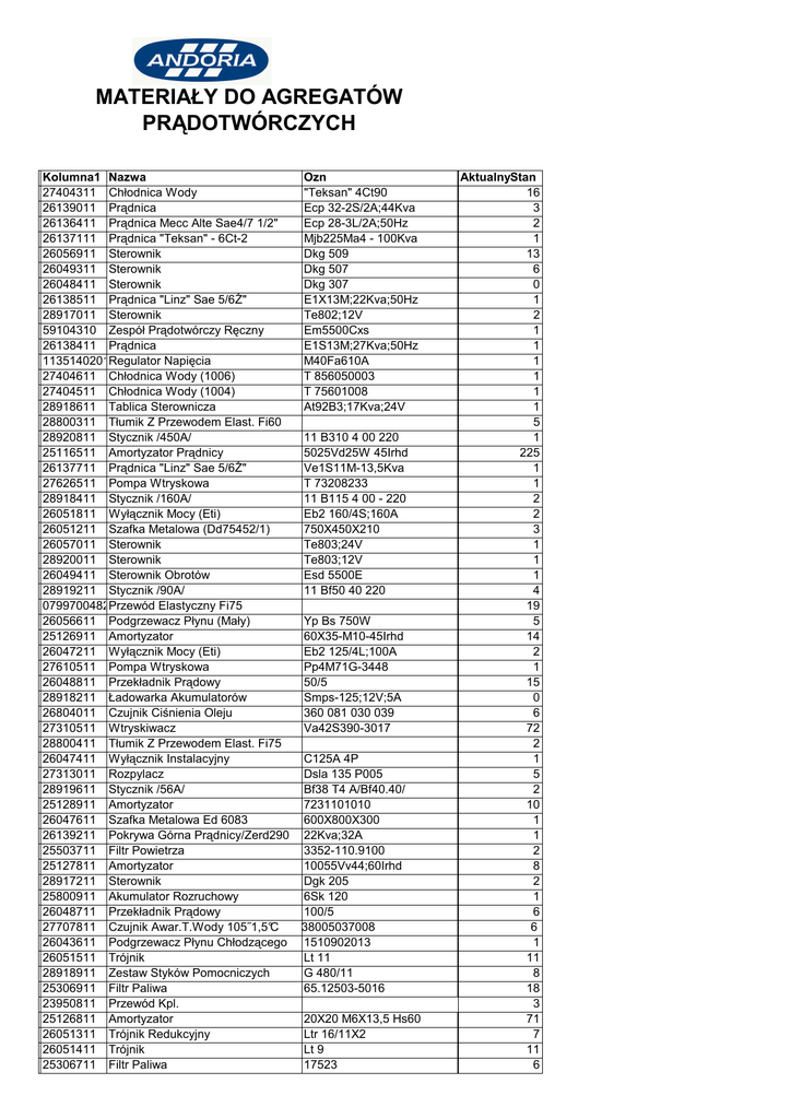 MATERIAŁY DO AGREGATÓW PRĄDOTWÓRCZYCH Kolumna1 Nazwa 27404311 Chłodnica Wody 26139011 Prądnica 26136411 Prądnica Mecc Alte Sae4/7 1/2" 26137111 Prądnica "Teksan" - 6Ct-2 26056911 Sterownik 26049311 Sterownik 26048411 Sterownik 26138511 Prądnica "Linz" Sae 5/6Ź" 28917011 Sterownik 59104310 Zespół Prądotwórczy Ręczny 26138411 Prądnica 1135140201000 Regulator Napięcia 27404611 Chłodnica Wody (1006) 27404511 Chłodnica Wody (1004) 28918611 Tablica Sterownicza 28800311 Tłumik Z Przewodem Elast. Fi60 28920811 Stycznik /450A/ 25116511 Amortyzator Prądnicy 26137711 Prądnica "Linz" Sae 5/6Ź" 27626511 Pompa Wtryskowa 28918411 Stycznik /160A/ 26051811 Wyłącznik Mocy (Eti) 26051211 Szafka Metalowa (Dd75452/1) 26057011 Sterownik 28920011 Sterownik 26049411 Sterownik Obrotów 28919211 Stycznik /90A/ 0799700482000 Przewód Elastyczny Fi75 26056611 Podgrzewacz Płynu (Mały) 25126911 Amortyzator 26047211 Wyłącznik Mocy (Eti) 27610511 Pompa Wtryskowa 26048811 Przekładnik Prądowy 28918211 Ładowarka Akumulatorów 26804011 Czujnik Ciśnienia Oleju 27310511 Wtryskiwacz 28800411 Tłumik Z Przewodem Elast. Fi75 26047411 Wyłącznik Instalacyjny 27313011 Rozpylacz 28919611 Stycznik /56A/ 25128911 Amortyzator 26047611 Szafka Metalowa Ed 6083 26139211 Pokrywa Górna Prądnicy/Zerd290 25503711 Filtr Powietrza 25127811 Amortyzator 28917211 Sterownik 25800911 Akumulator Rozruchowy 26048711 Przekładnik Prądowy 27707811 Czujnik Awar.T.Wody 105˝1,5°C 26043611 Podgrzewacz Płynu Chłodzącego 26051511 Trójnik 28918911 Zestaw Styków Pomocniczych 25306911 Filtr Paliwa 23950811 Przewód Kpl. 25126811 Amortyzator 26051311 Trójnik Redukcyjny 26051411 Trójnik 25306711 Filtr Paliwa Ozn "Teksan" 4Ct90 Ecp 32-2S/2A;44Kva Ecp 28-3L/2A;50Hz Mjb225Ma4 - 100Kva Dkg 509 Dkg 507 Dkg 307 E1X13M;22Kva;50Hz Te802;12V Em5500Cxs E1S13M;27Kva;50Hz M40Fa610A T 856050003 T 75601008 At92B3;17Kva;24V 11 B310 4 00 220 5025Vd25W 45Irhd Ve1S11M-13,5Kva T 73208233 11 B115 4 00 - 220 Eb2 160/4S;160A 750X450X210 Te803;24V Te803;12V Esd 5500E 11 Bf50 40 220 Yp Bs 750W 60X35-M10-45Irhd Eb2 125/4L;100A Pp4M71G-3448 50/5 Smps-125;12V;5A 360 081 030 039 Va42S390-3017 C125A 4P Dsla 135 P005 Bf38 T4 A/Bf40.40/ 7231101010 600X800X300 22Kva;32A 3352-110.9100 10055Vv44;60Irhd Dgk 205 6Sk 120 100/5 38005037008 1510902013 Lt 11 G 480/11 65.12503-5016 20X20 M6X13,5 Hs60 Ltr 16/11X2 Lt 9 17523 AktualnyStan 16 3 2 1 13 6 0 1 2 1 1 1 1 1 1 5 1 225 1 1 2 2 3 1 1 1 4 19 5 14 2 1 15 0 6 72 2 1 5 2 10 1 1 2 8 2 1 6 6 1 11 8 18 3 71 7 11 6 25504711 Wkład Filtra Powietrza 25404211 Filtr Oleju 26051111 Grzałka /900 W/ 26601311 Chłodnica Oleju Kpl. 25504611 Wkład Filtra Powietrza 1024302455000 Chłodnica Wody Żuk 27712711 Czujnik Obrotów 25801211 Akumulator 25505311 Wkład Filtra Powietrza 28920711 Blokada Mech.Ze Stykami 2Nc 28919011 Zestaw Styków Pomocniczych 26051611 Przekaźnik /Finder/ 21752010 Filtr Oleju 23950911 Przewód Kpl. 27509811 Pompa Wody 25403711 Filtr Oleju Puszkowy 25404011 Filtr Oleju /Rd290 Nt/ 28918811 Blokada Mechaniczna 27902411 Termostat (Krótki) 28918311 Ładowarka Akumulatorów 25124711 Wibroizolator 25502311 Wkład Filtru Powietrza 26051711 Przekaźnik 27708811 Czujnik Temperatury Wody 28613311 Siłownik 25306611 Filtr Paliwa (T 750010010) 28920511 Blokada Mechaniczna 28609211 Siłownik 26803411 Czujnik Ciśnienia Oleju 26801111 Czujnik Ciśnienia Oleju 27712611 Czujnik Temperatury Wody 26005111 Stacyjka 25116311 Amortyzator 25404111 Filtr Oleju 23949711 Przewód Kpl. 27712811 Czujnik Poziomu Paliwa 23952911 Przewód Kpl. 25301711 Wkład Filtra Paliwa 27902211 Termostat Do Podgrzewacza 28919311 Styki Pomocnicze 25403211 Wkład Filtru Oleju 28605811 Pompka Zasilająca 21601011 Wkład Filtra Powietrza 25303611 Wkład Filtru Paliwa 28919511 Blokada Mechaniczna 28919711 Adapter 23948511 Przewód Kpl. 25307511 Filtr Paliwa 25129111 Korek Chłodnicy Wody 27901811 Termostat 25301011 Wkład Filtru Paliwa 23951011 Przewód Ochronny Kpl. 25404311 Filtr Oleju (S-Pp12.3,F-Op592) 23941711 Przewód Ochronny Kpl. 21011711 Przewód Kpl. 27713311 Czujnik Wentylatora 25307111 Filtr Paliwa (S-Pd4.2,F-Pp845) Suma końcowa Af 25267 65.05510-5020B 1A12356C+ Af 25268 171301010 T 75205004A 55Ah/460A 68.08304-6025 Bfx 50 01 11 G350 F22-24-8-230 17.524 32.3780-01 Pp-8.7.3 2175107 11 G269 2 Tse - T115 Smps-245;24V;5A W20-A-3 Wa30-1200.00 Rg25/12V Fctw-5 9/013913 Ape 37Hbpsa - 24V T 75004251 11 G356/6 Ape 35-12V APE-4.00.000.00 Fcsc - 6 3K 201747 0420002 6535Vd25W 45Irhd 65.05510-5022B 2834044 Wp-40-3 F-80 11 G218 W050-50X 47Pmo42 Wa 20-250 Wp11.1 11 G269 1 11 G280 Ff 5519 (3033900) 009574 2485C090 2201/10/A 3831236 (205Vv) Ts 6994 21492771 (205Vv) Andoria -Mot Sp. z o.o. 34-120 Andrychów ul.Krakowska 140 tel.+48 33 8762 682 3 11 20 1 2 1 1 1 2 3 4 3 3 1 1 5 3 4 15 1 6 1 3 18 5 53 1 2 9 4 0 1 63 6 1 2 1 5 4 4 4 2 4 4 1 6 2 1 2 1 4 2 1 1 1 1 1