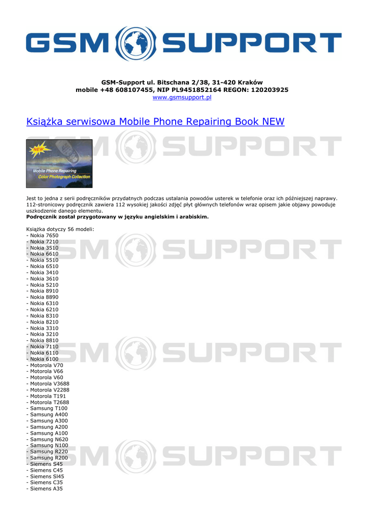 GSM-Support ul. Bitschana 2/38, 31-420 Kraków mobile +48 608107455, NIP PL9451852164 REGON: 120203925 www.gsmsupport.pl Książka serwisowa Mobile Phone Repairing Book NEW Jest to jedna z serii podręczników przydatnych podczas ustalania powodów usterek w telefonie oraz ich późniejszej naprawy. 112-stronicowy podręcznik zawiera 112 wysokiej jakości zdjęć płyt głównych telefonów wraz opisem jakie objawy powoduje uszkodzenie danego elementu. Podręcznik został przygotowany w języku angielskim i arabiskim. Książka dotyczy 56 modeli: - Nokia 7650 - Nokia 7210 - Nokia 3510 - Nokia 6610 - Nokia 5510 - Nokia 6510 - Nokia 3410 - Nokia 3610 - Nokia 5210 - Nokia 8910 - Nokia 8890 - Nokia 6310 - Nokia 6210 - Nokia 8310 - Nokia 8210 - Nokia 3310 - Nokia 3210 - Nokia 8810 - Nokia 7110 - Nokia 6110 - Nokia 6100 - Motorola V70 - Motorola V66 - Motorola V60 - Motorola V3688 - Motorola V2288 - Motorola T191 - Motorola T2688 - Samsung T100 - Samsung A400 - Samsung A300 - Samsung A200 - Samsung A100 - Samsung N620 - Samsung N100 - Samsung R220 - Samsung R200 - Siemens S45 - Siemens C45 - Siemens Sl45 - Siemens C35 - Siemens A35 - Siemens C25 Ericsson T68 Ericsson T65 Ericsson T39 Ericsson T29 Ericsson T28 Ericsson T10 Alcatel 310 Alcatel OT-700 Alcatel OT-500 Alcatel 302 Alcatel 221 Alcatel 206 Panasonic GD92 ©2012 www.gsmsupport.pl Opis ten nie stanowi oferty w rozumieniu Kodeksu Cywilnego. GSM-Support zastrzega sobie prawo do możliwych błędów w opisie produktu. Prosimy o weryfikację z Państwa strony, a w razie wątpliwości o kontakt. GSM-Support ul. Bitschana 2/38 31-420 Kraków POLSKA tel. 608107455 e-mail: [email protected] Powered by TCPDF (www.tcpdf.org)