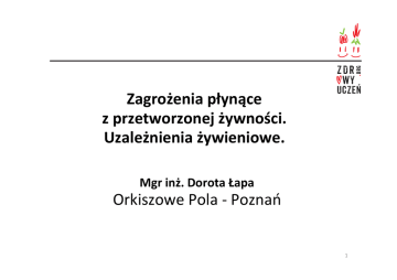Zagrożenia płynące z przetworzonej żywności. Uzależnienia żywieniowe. Mgr inż. Dorota Łapa Orkiszowe Pola -‐ Poznań 1 Błędy w żywieniu dzieci: 1. żywienie niedoborowe: gdy nie jest zrównoważone odżywczo i mało urozmaicone. Niekiedy utajone niedobory pokarmowe pozostają często nie rozpoznane. 2. stosowanie produktów wysokoprzetworzonych z dodatkiem chemicznych dodatków, które nie są obojętne dla organizmu. 3. żywienie nadmiarowe występujące najczęściej z nieprawidłowym stosunkiem poszczególnych składników odżywczych. Zdaniem Światowej Organizacji Zdrowia (WHO) duże znaczenie w odżywianiu dzieci mają reklamy produktów spożywczych skierowane do dzieci. -‐ Presja reklamy, mediów, bilbordów, brak wiedzy o szkodliwości danej grupy produktów, wygoda lub niemoc samych rodziców i opiekunów dość szybko przynosi efekty populacyjne: otyłość, alergie, cukrzycę, zaburzenia zachowania. Żywność naturalna • NIE MA PRAWDZIWEGO ZDROWIA BEZ PRAWDZIWEGO JEDZENIA • Dietetycy są zgodni: • im krótsza droga żywności z pola na stół, tym jest ona zdrowsza • • Źr. "Czy wiesz, co jesz?" K. Bosacka, M. KozłowskaWojciechowska; wyd. Publicat Żywność przetworzona Co to jest żywność wysokoprzetworzona? • poddana obróbce przemysłowej • często z substancjami dodatkowymi (cukier, sól, tłuszcz, witaminy, konserwanty, polepszacze smaku itd.) Żywności wysokoprzetworzonej NIE wytworzymy ani w domu, ani w przedszkolu, ani na stołówce. Człowiek przetwarza żywność od stuleci Procesy naturalne • Rozdrabnianie • Suszenie (owoce suszone na słońcu) • Solenie (kapusta, ogórki) • Wędzenie (w wędzarni!) • Gotowanie • Prażenie • Smażenie • Pieczenie • Pasteryzacja (wekowanie) Procesy przemysłowe • Oddzielanie mechaniczne • Suszenie rozpyłowe • Sterylizacja • Liofilizacja • Pakowanie próżniowe • Poddawanie żywności promieniowaniu • Obróbka podczerwienią • Termizacja • Ekstruzja Żywność wysokoprzetworzona zawiera: • • • • tłuszcze roślinne utwardzone substancje zagęszczające substancje stabilizujące substancje słodzące (cukier, syrop glukozowo – fruktozowy, słodziki) wzmacniacze smaku (np. glutaminian sodu). Czyli wszystkie "E„ (ponad 2000 dodatków do żywności) Spożycie żywności wysokoprzetworzonej o dłuższym okresie przydatności do spożycia, ładniejszym wyglądzie i specjalnych walorach smakowych UZALEŻNIA KONSUMENTA Ok. 2 kg dodatków żywnościowych spożywa 1 konsument w ciągu 1 roku = wzrost zachorowań na alergie i inne choroby niewiadomego pochodzenia PRZEMYSŁ SPOŻYWCZY – opiniotwórczy, dopuszczalne „bezpieczne” ilości, zabezpiecza żywność przed rozwojem drobnoustojów chorobotwóczych, „KORZYŚCI” – TECHNOLOGICZNE, EKONOMICZNE I ZDROWOTNE Porównanie produktów Natura • Upieczone mięso Przemysł • Wędlina z „wzorkiem” • Płatki zbożowe naturalne • Chrupkie płatki śniadaniowe (owsiane, orkiszowe, żytnie (czekoladowe, cynamonowe itd.) itd.) • Kisiel na bazie soku owocowego lub kompotu z mąką ziemniaczaną • Jogurt naturalny (skład: mleko i żywe kultury bakterii) • Kisiel typu „zalej wodą” • „Deser” jogurtowy z wsadem „owocowym” Produkt podlega prawom popytu i podaży. Producenci żywności kuszą nas dosmaczając swoje produkty: dosładzając, przyprawiając, dodając tłuszczu. Efekt? Produkty zbyt słodkie, słone lub tłuste. Opierając się na gotowych daniach prosto z "linii produkcyjnej", trudno jest skomponować zbilansowaną dietę. Cukier - produkt wysokoprzetworzony • Energia dostarczana bardzo szybko, na bardzo krótki okres czasu. • Podczas trawienia cukru zużywane są znaczące ilości minerałów i witamin - witaminy B, cynku, wapnia, fosforu, magnezu czy chromu do jego strawienia • Niszczy śluzówkę jelit - spada w znaczącym stopniu odporność organizmu • Powoduje próchnicę zębów i otyłość. • Powoduje nadpobudliwość organizmu, brak koncentracji, rozdrażnienie, spadki nastroju oraz senność. Syrop glukozowo-‐ fruktozowy! UWAGA! otrzymuje się przemysłowo z kukurydzy, która jest przetwarzana na skrobię kukurydzianą. Skrobia następnie jest przetwarzana pod wpływem kwasów, enzymów owocowych KONSUMPCJA WYSOKOPRZETWORZONYCH CUKRÓW PROSTYCH (GLUKOZY, FRUKTOZY) PROWADZI DO TZW. REAKTYWNEJ HIPOGLIKEMII, TJ. GWAŁTOWNYCH ZMIAN POZIOMU INSULINY ORAZ GLUKOZY WE KRWI Powoduje ZWIĘKSZANIE: -‐ masy ciała i w konsekwencji otyłość -‐ apetytu, insulinooporności -‐ cukrzycy typu 2 -‐ poziomu cholesterolu -‐ frakcji LDL i trójglicerydów Glutaminian sodu = E621 Roczna produkcja ok. 400 tys. ton Glutamina (kwas glutaminowy) jest naturalnie występującym aminokwasem znajdującym się w różnych stężeniach w wielu produktach spożywczych. Jego stężenie jest mniejsze niż 0,1 g/100g produktu. Sól kwasu glutaminowego, czyli glutamininan sodu. wzmocnienie smaku to 0,2-‐0,8 g/100 g produktu. Obecne badania donoszą o szkodliwości glutaminianu sodu Amerykańska organizacja FDA (Food and Drug AdministraWon) – zajmująca się badaniem i dopuszczaniem żywności i leków) uważa, że jest bezpieczny. Obecne badania donoszą o szkodliwości glutaminianu s odu. „Dieta bogata w E 621 zwiększa ryzyko wystąpienia nadwagi i otyłości nawet o 3 razy” Uniwersytet w Północnej Karolinie. Badacze donoszą, że dieta bogata w E 621 zwiększa ryzyko wystąpienia nadwagi i otyłości nawet o 3 razy. Grupa badana: populacja Chińczyków. I grupa -‐ stosowała dietę, prawidłowe odżywianie wykluczając produkty niewskazane przy otyłości i nadwadze, ale stosująca glutaminian sodu II grupa -‐ stosowała dietę wykluczając glutaminian sodu. W pierwszej grupie występowała 3 razy częściej otyłość lub nadwaga niż w grupie drugiej. Zakład Fizjologii na AWF w Warszawie Udowodniono, że glutaminian sodu E 621 przyjmowany nawet w małych 
