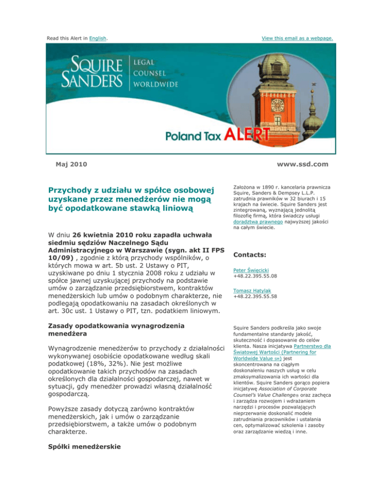 Read this Alert in English. View this email as a webpage. www.ssd.com Maj 2010 Przychody z udziału w spółce osobowej uzyskane przez menedżerów nie mogą być opodatkowane stawką liniową W dniu 26 kwietnia 2010 roku zapadła uchwała siedmiu sędziów Naczelnego Sądu Administracyjnego w Warszawie (sygn. akt II FPS 10/09) , zgodnie z którą przychody wspólników, o których mowa w art. 5b ust. 2 Ustawy o PIT, uzyskiwane po dniu 1 stycznia 2008 roku z udziału w spółce jawnej uzyskującej przychody na podstawie umów o zarządzanie przedsiębiorstwem, kontraktów menedżerskich lub umów o podobnym charakterze, nie podlegają opodatkowaniu na zasadach określonych w art. 30c ust. 1 Ustawy o PIT, tzn. podatkiem liniowym. Zasady opodatkowania wynagrodzenia menedżera Wynagrodzenie menedżerów to przychody z działalności wykonywanej osobiście opodatkowane według skali podatkowej (18%, 32%). Nie jest możliwe opodatkowanie takich przychodów na zasadach określonych dla działalności gospodarczej, nawet w sytuacji, gdy menedżer prowadzi własną działalność gospodarczą. Powyższe zasady dotyczą zarówno kontraktów menedżerskich, jak i umów o zarządzanie przedsiębiorstwem, a także umów o podobnym charakterze. Spółki menedżerskie Założona w 1890 r. kancelaria prawnicza Squire, Sanders & Dempsey L.L.P. zatrudnia prawników w 32 biurach i 15 krajach na świecie. Squire Sanders jest zintegrowaną, wyznającą jednolitą filozofię firmą, która świadczy usługi doradztwa prawnego najwyższej jakości na całym świecie. Contacts: Peter Święcicki +48.22.395.55.08 Tomasz Hatylak +48.22.395.55.58 Squire Sanders podkreśla jako swoje fundamentalne standardy jakość, skuteczność i dopasowanie do celów klienta. Nasza inicjatywa Partnerstwo dla Światowej Wartości (Partnering for Worldwide Value SM) jest skoncentrowana na ciągłym doskonaleniu naszych usług w celu zmaksymalizowania ich wartości dla klientów. Squire Sanders gorąco popiera inicjatywę Association of Corporate Counsel’s Value Challenge® oraz zachęca i zarządza rozwojem i wdrażaniem narzędzi i procesów pozwalających nieprzerwanie doskonalić modele zatrudniania pracowników i ustalania cen, optymalizować szkolenia i zasoby oraz zarządzanie wiedzą i inne. Sposobem na optymalizację kosztów działalności menedżerów były przez pewien czas spółki osobowe (tj. jawna, komandytowa) zakładane przez co najmniej dwóch menedżerów. Wynagrodzenie uzyskiwane przez wspólników spółki na podstawie umowy o zarządzanie opodatkowane było jako przychód z działalności gospodarczej. Od przychodu z tytułu udziału w spółce mógł więc być pobierany podatek liniowy w wysokości 19%. Taki model był akceptowany przez organy podatkowe oraz wojewódzkie sądy administracyjne. W ostatnim jednak czasie, pozytywne wyroki były zaskarżane przez organy podatkowe i jedna z tych spraw trafiła do NSA. Konsekwencje wyroku Swoje rozstrzygnięcie NSA argumentował w ten sposób, że to menedżer jest odpowiedzialny za efekt świadczonych usług i sam zarządza swoją firmą, nawet jeżeli korzysta ze wsparcia innych osób. Taka sama sytuacja będzie miała miejsce, jeżeli menedżer jest wspólnikiem spółki osobowej. Opodatkowanie przychodów uzyskiwanych z takiej działalności znajduje się na poziomie wspólnika. Spółka jest neutralna podatkowo. W związku z tym, przychód ten jest przychodem z działalności wykonywanej osobiście (art. 13 pkt 9 Ustawy o PIT). Uchwała siedmioosobowego składu NSA wzbudza kontrowersje i może powodować problemy techniczne z rozliczeniem wynagrodzenia za zarządzanie. Menedżerowie oraz osoby zarządzające przedsiębiorstwem będą zapewne szukać nowych rozwiązań pozwalających na optymalizację kosztów swojej działalności, w tym obciążeń podatkowych. Income From Participation in a Partnership Earned by Managers Cannot Be Subject to Flat Tax On 26 April 2010 seven judges of the Supreme Administrative Court of Poland in Warsaw (file No. II FPS 10/09) resolved that the income of partners referred to in Art. 5b Section 2 of the Personal Income Tax (PIT) Act that is earned after 1 January 2008 from participation in a registered partnership earning income on the basis of enterprise management contracts, management contracts or contracts of a similar nature is not subject to the flat tax stipulated in Art. 30c Section 1 of the PIT Act. Squire Sanders publikuje alerty także na inne tematy. Jeśli chcą Państwo zobaczyć listę opcji i potwierdzić chęć otrzymywania materiałów, prosimy wejść na strona www. Cincinnati · Cleveland · Columbus · Houston · Los Angeles · Miami · Nowy York · Palo Alto · Phoenix · San Francisco · Tallahassee · Tampa · Tysons Corner · Waszyngton DC · West Palm Beach | Bogotá+ · Buenos Aires+ · Caracas · La Paz+ · Lima+ · Panamá+ · Rio de Janeiro · Santiago+ · Santo Domingo · São Paulo | Bejrut+ · Bratysława · Bruksela · Bukareszt+ · Budapeszt · Frankfurt · Kijów · Londyn · Moskwa · Praga · Rijad+ · Warszawa | Pekin · Hong Kong · Shanghai · Tokio | +Niezależna firma z sieci Rules of Taxation of Managers’ Compensation Managers’ compensation is the income from activity performed personally and subject to taxation at a given tax rate (either 18 percent or 32 percent). It is not possible to tax such income pursuant to the rules specified for business activity even in the situation where the manager pursues his own business activity. Managers’ Partnerships For some time, the best way to minimize the costs of managers’ activity was considered to be partnerships (that is, registered or limited partnerships) incorporated by at least two managers. Compensation earned by partners on the basis of management contracts was taxed as the income from business activity. Therefore, a 19 percent flat tax could be charged on the income earned through participation in a partnership. Such a 