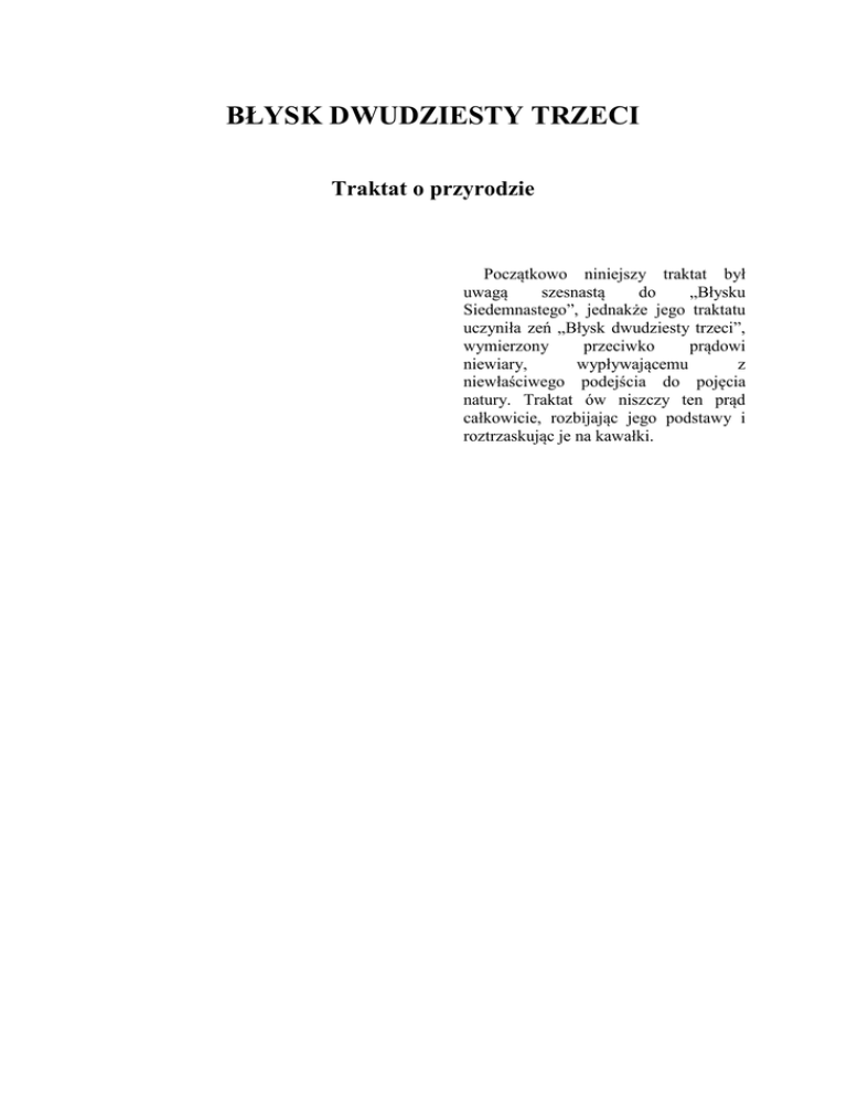 BŁYSK DWUDZIESTY TRZECI Traktat o przyrodzie Początkowo niniejszy traktat był uwagą szesnastą do „Błysku Siedemnastego”, jednakże jego traktatu uczyniła zeń „Błysk dwudziesty trzeci”, wymierzony przeciwko prądowi niewiary, wypływającemu z niewłaściwego podejścia do pojęcia natury. Traktat ów niszczy ten prąd całkowicie, rozbijając jego podstawy i roztrzaskując je na kawałki. Uwaga Za pomocą dziewięciu rozdziałów (nazwanych „absurdami”, a napisanych na podstawie co najmniej dziewięćdziesięciu dziewięciu absurdów), traktat ten ukazuje prawdę o filozofii, uprawianej przez ignorantów spośród naturalistów, ukazuje oddalenie ich prądu od zasad logiki oraz skalę jego bezczelności i fałszu. Część tych absurdów, opisanych w innych traktatach, została niniejszym wymieniona raz jeszcze, wraz z innymi absurdami, bądź przytoczona w nieco krótszej formie. Nasuwa się pytanie: Jak to możliwe, że znani filozofowie oraz sławni uczeni zaakceptowali ten okropny nonsens (naturalizmu – przyp. red. polskiej) i powierzyli mu wodze swoich umysłów?! Odpowiedź brzmi: Nie poznali istoty swojego sposobu myślenia1 ani tego, co się za nim kryje. Nie są świadomi absurdów, wynikających z ich filozofii, ani związanych z ową filozofią szkód i przejawów nonsensu, które zostały wymienione na początku każdego z absurdów, opisanych i odrzuconych w niniejszym traktacie. Jestem w pełni gotów do przedstawienia każdemu, kto ma wątpliwości co do mojego stanowiska, niezbitych dowodów oraz oczywistych argumentów, dowodzących prawdziwości powyższych słów,. Przedstawiam te dowody szeroko i szczegółowo. 1 Powodem, który uczynił napisanie tego traktatu niezwykle pilnym i naglącym, był podły atak na Szlachetny Koran, bezczelne naruszenie prawd wiary poprzez zafałszowanie ich, związanie ateizmu z naturą, użycie określenia „nonsens” wobec wszystkiego, czego nie pojmują ograniczone i zgniłe umysły „naturalistów”. Atak ów wzbudził w mym sercu silny gniew, który wpłynął na wydźwięk traktatu, wymierzającego silny policzek w bezbożników i członków fałszywych prądów intelektualnych, sprzeciwiających się prawdzie. Poza tym jednym przypadkiem, „Traktaty Światła” używają jedynie łagodnej i delikatnej retoryki. (Przyp. autora.) W Imię Boga, Miłosiernego, Litościwego! او وَل رَ رض سلُهم أفي للاه ف طا فا ه هل َل ت ُ قالتْ ُر „Ich posłańcy powiedzieli: ‘Czy może istnieć jakakolwiek wątpliwość co do Boga, Stworzyciela niebios i ziemi?’” (Koran, 14:10) Ten szlachetny werset – poprzez zadanie pytania – wskazuje jasno i dobitnie na istnienie Boga oraz na Jego Jedność. Zanim wyjaśnimy tę tajemnicę, zwróćmy uwagę na następującą kwestię: W roku 1338 hidżry (1922 kalendarza gregoriańskiego) zostałem zaproszony do Ankary. Podczas tej wizyty byłem świadkiem radości wiernych z porażki Grecji w starciu z armią muzułmańską. Niemniej jednak, pośród tej fali radości zauważyłem przerażające herezje, podle przenikające wraz ze swoimi zepsutymi pojęciami do niezachwianych zasad ludzi wiary w celu zepsucia i zatrucia ich. W głębi ducha smuciłem się i wołałem do Najwyższego i Wszechmogącego Boga, prosząc go o pomoc w odparciu tego strasznego demona, który chce naruszyć fundamenty wiary. Wsparcie znalazłem w przytoczonym wyżej szlachetnym wersecie, skorzystałem z zawartych w nim myśli i znaczeń, aby wykazać oczywistość istnienia i Jedności Boga, niechaj Chwała Mu będzie. Okazałem wtedy silny, mocny i ucinający głowę herezji dowód, zawarty następnie w traktacie w języku arabskim. Traktat wydrukowałem w Ankarze, w drukarni „Yeni Gün”. Nie przyniósł on jednak oczekiwanej pomocy w walce z herezją i nie udało mu się zatrzymać procesu przenikania jej do ludzkich umysłów. Stało się tak, ponieważ krótki traktat bardzo ogólnie omawiał temat, a w ówczesnej Turcji niewielu ludzi znało język arabski lub interesowało się nim. Dlatego – niestety! – urojenia ateizmu rozpowszechniły się wśród ludzi, co zmusiło mnie do ponownego napisania traktatu (wraz z jego dowodami i pewnymi objaśnieniami) w języku tureckim. Jako że część tych dowodów została już opisana i wyjaśniona na łamach „Traktatów Światła”, to niniejszym wymienimy je w sposób skrócony. Część innych dowodów, znajdujących się w innych traktatach, jest wspomniana również w tymże, a każdy z nich jest niczym część traktatu. Wstęp O, człowieku! Wiedz, iż istnieją przerażające słowa, od których bije odór niewiary. Wychodzą z ust ludzkich, a powtarzają je języki ludzi wiary, nieświadomych niebezpieczeństw znaczenia słów, które wypowiadają. Wymienimy poniżej trzy niezwykle niebezpieczne rodzaje takiej mowy: Rodzaj pierwszy: Twierdzenie, że coś zostało „stworzone przez przyczyny”, tzn. że przyczyny są czymś, co doprowadziło do istnienia daną rzecz. Rodzaj drugi: Twierdzenie, że coś „sformowało się samo”, tzn. że jakaś rzecz ukształtowała się sama z siebie i sama sobie daje byt, a następnie sama przybiera formę. Rodzaj trzeci: Twierdzenie, że „takiej to a takiej rzeczy wymaga natura”, tzn. że ta rzecz jest naturalna, a natura jest tym, co dało tej rzeczy byt i sprawiło jej istnienie koniecznym. Jako że byty istnieją na naszych oczach, w żaden sposób nie możemy im zaprzeczyć, a każde stworzenie przychodzi do bytu w perfekcyjnej formie i w określonym celu; nie istnieje ono wiecznie, lecz jest czymś nowym. Bezbożniku! Powiadasz, że to stworzenie – na przykład zwierzę – zostało przywołane do istnienia przez znajdujące się na świecie przyczyny (czyli, że jego istnienie jest wynikiem nałożenia się przyczyn materialnych) lub sformowało się samo w sobie, bądź przychodzi na świat, bo natura i jej oddziaływanie tak chciały! A powin