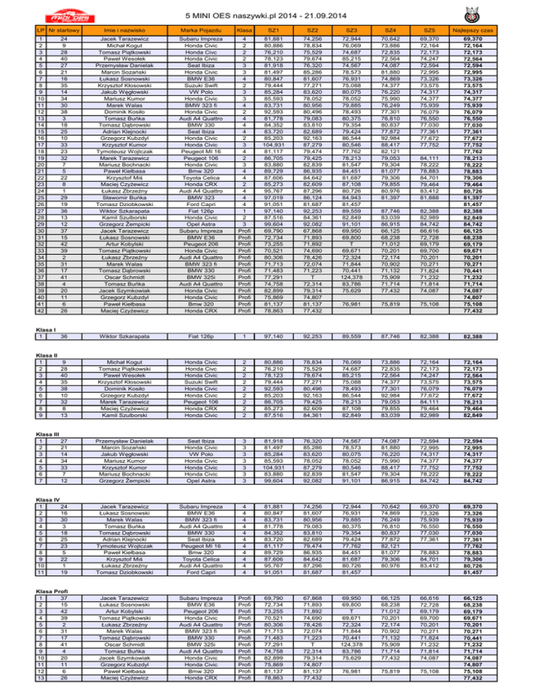 5 MINI OES naszywki.pl 2014 - 21.09.2014 LP Nr startowy Imie i nazwisko Marka Pojazdu Klasa SZ1 SZ2 SZ3 SZ4 SZ5 Najlepszy czas Jacek Tarazewicz Michał Kogut Tomasz Piątkowski Paweł Wesołek Przemysław Danielak Marcin Sozański Łukasz Sosnowski Krzysztof Kłosowski Jakub Węgłowski Mariusz Kumor Marek Walas Dominik Kosiło Tomasz Buńka Tomasz Dąbrowski Adrian Klejnocki Grzegorz Kubzdyl Krzysztof Kumor Tymoteusz Wojtczak Marek Tarazewicz Mariusz Bochnacki Paweł Kiełbasa Krzysztof Miś Maciej Czyżewicz Łukasz Zbrzeźny Sławomir Buńka Tomasz Dziobkowski Wiktor Szkarapata Kamil Szulborski Grzegorz Żempicki Jacek Tarazewicz Łukasz Sosnowski Artur Kobylski Tomasz Piątkowski Łukasz Zbrzeźny Marek Walas Tomasz Dąbrowski Oscar Schmidt Tomasz Buńka Jacek Szymkowiak Grzegorz Kubzdyl Paweł Kiełbasa Maciej Czyżewicz Subaru Impreza Honda Civic Honda Civc Honda Civic Seat Ibiza Honda Civic BMW E36 Suzuki Swift VW Polo Honda Civic BMW 323 fi Honda Civic Audi A4 Quattro BMW 330 Seat Ibiza Honda Civic Honda Civic Peugeot MI 16 Peugeot 106 Honda Civic Bmw 320 Toyota Celica Honda CRX Audi A4 Quattro BMW 323 Ford Capri Fiat 126p Honda Civic Opel Astra Subaru Impreza BMW E36 Peugeot 206 Honda Civic Audi A4 Quattro BMW 323 fi BMW 330 BMW 325i Audi A4 Quattro Honda Civic Honda Civic Bmw 320 Honda CRX 4 2 2 2 3 3 4 2 3 3 4 2 4 4 4 2 3 4 2 3 4 4 2 4 4 4 1 2 3 Profi Profi Profi Profi Profi Profi Profi Profi Profi Profi Profi Profi Profi 81,881 80,886 76,210 78,123 81,918 81,497 80,847 79,444 85,284 85,593 83,731 92,593 81,778 84,352 83,720 85,203 104,931 81,117 86,705 83,880 89,729 87,606 85,273 95,767 97,019 91,051 97,140 87,516 99,604 69,790 72,734 73,255 70,521 80,306 71,713 71,483 77,291 74,758 82,899 75,869 81,137 78,863 74,256 78,834 75,529 79,674 76,320 85,286 81,607 77,271 83,620 78,052 80,956 80,496 79,083 83,810 82,689 92,163 87,279 79,474 79,425 82,839 86,935 84,642 82,609 87,296 86,124 81,687 92,253 84,361 92,082 67,868 71,893 71,892 74,690 78,426 72,074 71,223 T 72,314 79,314 74,807 81,137 77,432 72,944 76,069 74,687 85,215 74,567 78,573 76,931 75,088 80,075 78,052 79,885 78,493 80,375 79,354 79,424 86,544 80,546 77,762 78,213 81,547 84,451 81,687 87,108 80,726 84,943 81,457 89,559 82,849 91,101 69,950 69,800 T 69,671 72,324 71,844 70,441 124,378 83,786 75,629 70,642 73,886 72,835 72,564 74,087 81,880 74,869 74,377 76,220 75,990 76,249 77,301 76,810 80,837 77,872 92,984 88,417 82,121 79,053 79,304 81,077 79,306 79,855 80,976 81,397 69,370 72,164 72,173 74,247 72,594 72,995 73,326 73,575 74,317 74,377 75,939 76,079 76,550 77,030 77,361 77,672 77,752 87,746 83,039 86,915 66,125 68,238 71,012 70,201 72,174 70,902 71,132 75,909 71,714 77,432 82,388 82,989 84,742 66,616 72,728 69,179 69,700 70,201 70,271 71,824 71,232 71,814 74,087 76,981 75,819 75,108 69,370 72,164 72,173 72,564 72,594 72,995 73,326 73,575 74,317 74,377 75,939 76,079 76,550 77,030 77,361 77,672 77,752 77,762 78,213 78,222 78,883 79,306 79,464 80,726 81,397 81,457 82,388 82,849 84,742 66,125 68,238 69,179 69,671 70,201 70,271 70,441 71,232 71,714 74,087 74,807 75,108 77,432 Klasa I 1 36 Wiktor Szkarapata Fiat 126p 1 97,140 92,253 89,559 87,746 82,388 82,388 Klasa II 1 2 3 4 5 6 7 8 9 Michał Kogut Tomasz Piątkowski Paweł Wesołek Krzysztof Kłosowski Dominik Kosiło Grzegorz Kubzdyl Marek Tarazewicz Maciej Czyżewicz Kamil Szulborski Honda Civic Honda Civc Honda Civic Suzuki Swift Honda Civic Honda Civic Peugeot 106 Honda CRX Honda Civic 2 2 2 2 2 2 2 2 2 80,886 76,210 78,123 79,444 92,593 85,203 86,705 85,273 87,516 78,834 75,529 79,674 77,271 80,496 92,163 79,425 82,609 84,361 76,069 74,687 85,215 75,088 78,493 86,544 78,213 87,108 82,849 73,886 72,835 72,564 74,377 77,301 92,984 79,053 79,855 83,039 72,164 72,173 74,247 73,575 76,079 77,672 84,111 79,464 82,989 72,164 72,173 72,564 73,575 76,079 77,672 78,213 79,464 82,849 Klasa III 1 27 2 21 3 14 4 34 5 33 6 7 7 12 Przemysław Danielak Marcin Sozański Jakub Węgłowski Mariusz Kumor Krzysztof Kumor Mariusz Bochnacki Grzegorz Żempicki Seat Ibiza Honda Civic VW Polo Honda Civic Honda Civic Honda Civic Opel Astra 3 3 3 3 3 3 3 81,918 81,497 85,284 85,593 104,931 83,880 99,604 76,320 85,286 83,620 78,052 87,279 82,839 92,082 74,567 78,573 80,075 78,052 80,546 81,547 91,101 74,087 81,880 76,220 75,990 88,417 79,304 86,915 72,594 72,995 74,317 74,377 77,752 78,222 84,742 72,594 72,995 74,317 74,377 77,752 78,222 84,742 Klasa IV 1 24 2 16 3 30 4 3 5 18 6 25 7 23 8 5 9 22 10 1 11 19 Jacek Tarazewicz Łukasz Sosnowski Marek Walas Tomasz Buńka Tomasz Dąbrowski Adrian Klejnocki Tymoteusz Wojtczak Paweł Kiełbasa Krzysztof Miś Łukasz Zbrzeźny Tomasz Dziobkowski Subaru Impreza BMW E36 BMW 323 fi Audi A4 Quattro BMW 330 Seat Ibiza Peugeot MI 16 Bmw 320 Toyota Celica Audi A4 Quattro Ford Capri 4 4 4 4 4 4 4 4 4 4 4 81,881 80,847 83,731 81,778 84,352 83,720 81,117 89,729 87,606 95,767 91,051 74,256 81,607 80,956 79,083 83,810 82,689 79,474 86,935 84,642 87,296 81,687 72,944 76,931 79,885 80,375 79,354 79,424 77,762 84,451 81,687 80,726 81,457 70,642 74,869 76,249 76,810 80,837 77,872 82,121 81,077 79,306 80,976 69,370 73,326 75,939 76,550 77,030 77,361 69,370 73,326 75,939 76,550 77,030 77,361 77,762 78,883 79,306 80,726 81,457 Klasa Profi 1 37 2 15 3 42 4 39 5 2 6 31 7 17 8 41 9 4 10 20 11 11 12 6 13 26 Jacek Tarazewicz Łukasz Sosnowski Artur Kobylski Tomasz Piątkowski Łukasz Zbrzeźny Marek Walas Tomasz Dąbrowski Oscar Schmidt Tomasz Buńka Jacek Szymkowiak Grzegorz Kubzdyl Paweł Kiełbasa Maciej Czyżewicz Subaru Impreza BMW E36 Peugeot 206 Honda Civic Audi A4 Quattro BMW 323 fi BMW 330 BMW 325i Audi A4 Quattro Honda Civic Honda Civic Bmw 320 Honda CRX Profi Profi Profi Profi Profi Profi Profi Profi Profi Profi Profi Profi Profi 69,790 72,734 73,255 70,521 80,306 71,713 71,483 77,291 74,758 82,899 75,869 81,137 78,863 67,868 71,893 71,892 74,690 78,426 72,074 71,223 T 72,314 79,314 74,807 81,137 77,432 69,950 69,800 T 69,671 72,324 71,844 70,441 124,378 83,786 