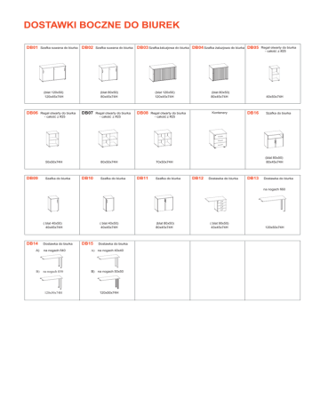 DOSTAWKI BOCZNE DO BIUREK DB01 Szafka suwana do biurka DB02 (blat 120x50) 120x45x74H DB06 Regał otwarty do biurka - całość z #25 Szafka do biurka DB03 Szafka żaluzjowa do biurka DB04 Szafka żaluzjowa do biurka DB05 (blat 80x50) 80x45x74H DB07 50x50x74H DB09 Szafka suwana do biurka Regał otwarty do biurka - całość z #25 (blat 120x50) 120x45x74H DB08 80x50x74H DB10 Szafka do biurka (blat 80x50) 80x45x74H Kontenery Regał otwarty do biurka - całość z #25 40x50x74H DB16 Szafka do biurka Szafka do biurka (blat 80x50) 80x45x74H 70x50x74H DB11 Regał otwarty do biurka - całość z #25 DB12 Dostawka do biurka DB13 Dostawka do biurka na nogach fi60 ( blat 40x50) 40x45x74H DB14 Dostawka do biurka ( blat 40x50) 40x45x74H DB15 Dostawka do biurka A) na nogach fi40 A) na nogach 40x40 B) na nogach fi50 B) na nogach 50x50 120x50x74H 120x50x74H (blat 80x50) 80x45x74H ( blat 90x50) 43x45x74H 120x50x74H BLENDY (OSŁONY) PRZEDNIE DO BIUREK Do biurka długości 100 cm 120 cm 140 cm 160 cm 180 cm Rodzaj blendy ST313 ST314 ST315 ST316 ST317 ST323 ST324 ST325 ST326 ST327 blenda metalowa blenda metalowa --- --- --- Q366 Q367 blenda metalowa ST373 ST374 ST375 ST376 ST377 ST383 ST384 ST385 ST386 ST387 B909 B910 B911 B912 B913 blenda metalowa blenda metalowa blenda z p!yty #18 mm DODATKI DO BIUREK Rodzaj elementu Symbol i cena A) metalowy ST312 ST102 B) plastikowy poziomy kanał kablowy osłona monitora do blatu A) ST322 PM100 B) przepust meblowy na kable osłona monitora do blatu Q362 ST101 osłona monitora do blatu wózek pod komputer ST372 ST103 zawieszka na komputer osłona monitora do blatu ST382 PPL65 wózek pod komputer osłona monitora do blatu ST318 PPL72 podstawka pod monitor osłona monitora na stół ST328 B248 osłona monitora na stół szuflada klawiatury Q368 ST312/1 osłona monitora na stół zawieszka ST378 ST313/1 zawieszka osłona monitora na stół ST388 ST100 kręgosłup na kable osłona monitora na stół