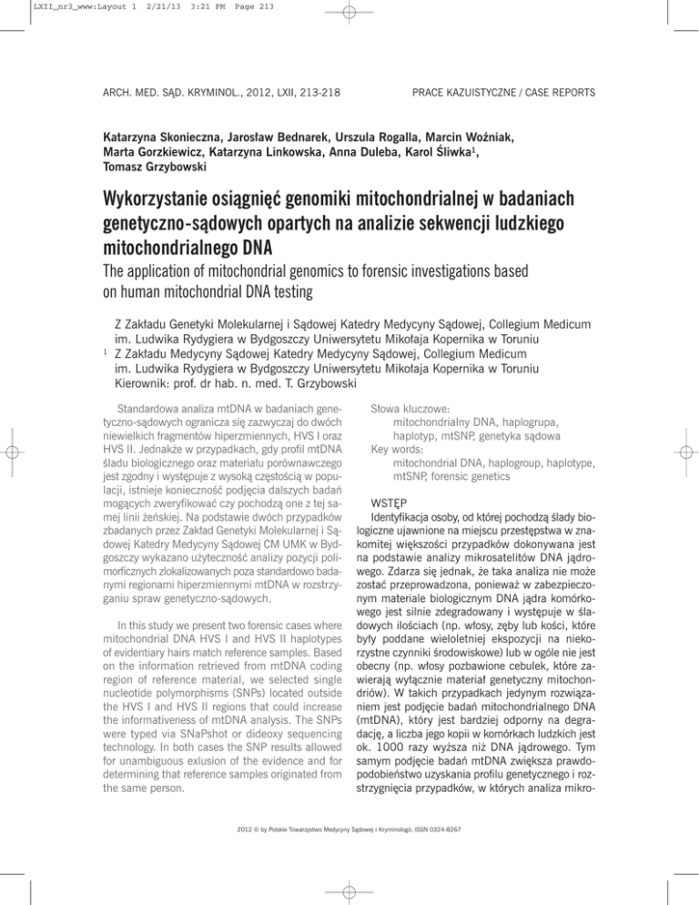 LXII_nr3_www:Layout 1 2/21/13 3:21 PM Page 213 ARCH. MED. SĄD. KRYMINOL., 2012, LXII, 213-218 PRACE KAZUISTYCZNE / CASE REPORTS Katarzyna Skonieczna, Jarosław Bednarek, Urszula Rogalla, Marcin Woźniak, Marta Gorzkiewicz, Katarzyna Linkowska, Anna Duleba, Karol Śliwka1, Tomasz Grzybowski Wykorzystanie osiągnięć genomiki mitochondrialnej w badaniach genetyczno-sądowych opartych na analizie sekwencji ludzkiego mitochondrialnego DNA The application of mitochondrial genomics to forensic investigations based on human mitochondrial DNA testing 1 Z Zakładu Genetyki Molekularnej i Sądowej Katedry Medycyny Sądowej, Collegium Medicum im. Ludwika Rydygiera w Bydgoszczy Uniwersytetu Mikołaja Kopernika w Toruniu Z Zakładu Medycyny Sądowej Katedry Medycyny Sądowej, Collegium Medicum im. Ludwika Rydygiera w Bydgoszczy Uniwersytetu Mikołaja Kopernika w Toruniu Kierownik: prof. dr hab. n. med. T. Grzybowski Standardowa analiza mtDNA w badaniach genetyczno-sądowych ogranicza się zazwyczaj do dwóch niewielkich fragmentów hiperzmiennych, HVS I oraz HVS II. Jednakże w przypadkach, gdy profil mtDNA śladu biologicznego oraz materiału porównawczego jest zgodny i występuje z wysoką częstością w populacji, istnieje konieczność podjęcia dalszych badań mogących zweryfikować czy pochodzą one z tej samej linii żeńskiej. Na podstawie dwóch przypadków zbadanych przez Zakład Genetyki Molekularnej i Sądowej Katedry Medycyny Sądowej CM UMK w Bydgoszczy wykazano użyteczność analizy pozycji polimorficznych zlokalizowanych poza standardowo badanymi regionami hiperzmiennymi mtDNA w rozstrzyganiu spraw genetyczno-sądowych. In this study we present two forensic cases where mitochondrial DNA HVS I and HVS II haplotypes of evidentiary hairs match reference samples. Based on the information retrieved from mtDNA coding region of reference material, we selected single nucleotide polymorphisms (SNPs) located outside the HVS I and HVS II regions that could increase the informativeness of mtDNA analysis. The SNPs were typed via SNaPshot or dideoxy sequencing technology. In both cases the SNP results allowed for unambiguous exlusion of the evidence and for determining that reference samples originated from the same person. Słowa kluczowe: mitochondrialny DNA, haplogrupa, haplotyp, mtSNP, genetyka sądowa Key words: mitochondrial DNA, haplogroup, haplotype, mtSNP, forensic genetics WSTĘP Identyfikacja osoby, od której pochodzą ślady biologiczne ujawnione na miejscu przestępstwa w znakomitej większości przypadków dokonywana jest na podstawie analizy mikrosatelitów DNA jądrowego. Zdarza się jednak, że taka analiza nie może zostać przeprowadzona, ponieważ w zabezpieczonym materiale biologicznym DNA jądra komórkowego jest silnie zdegradowany i występuje w śladowych ilościach (np. włosy, zęby lub kości, które były poddane wieloletniej ekspozycji na niekorzystne czynniki środowiskowe) lub w ogóle nie jest obecny (np. włosy pozbawione cebulek, które zawierają wyłącznie materiał genetyczny mitochondriów). W takich przypadkach jedynym rozwiązaniem jest podjęcie badań mitochondrialnego DNA (mtDNA), który jest bardziej odporny na degradację, a liczba jego kopii w komórkach ludzkich jest ok. 1000 razy wyższa niż DNA jądrowego. Tym samym podjęcie badań mtDNA zwiększa prawdopodobieństwo uzyskania profilu genetycznego i rozstrzygnięcia przypadków, w których analiza mikro- 2012 © by Polskie Towarzystwo Medycyny Sądowej i Kryminologii, ISSN 0324-8267 LXII_nr3_www:Layout 1 214 2/21/13 3:21 PM Page 214 Katarzyna Skonieczna, Jarosław Bednarek, Urszula Rogalla, Marcin Woźniak, Marta Gorzkiewicz, Katarzyna Linkowska, Anna Duleba, Karol Śliwka, Tomasz Grzybowski satelitów jądrowych jest niemożliwa do przeprowadzenia. Mimo, że mtDNA składa się z ok. 16569 nukleotydów [1], to dla potrzeb identyfikacyjnych większość laboratoriów genetyczno-sądowych poddaje analizie jedynie dwa jego niewielkie fragmenty, HVS I (ang. Hypervariable Segment I) oraz HVS II (ang. Hypervariable Segment II), które położone są w obrębie regionu kontrolnego, a ich wielkość wynosi łącznie ok 600 p.z. Charakteryzują się one szczególnie wysoką zmiennością międzyosobniczą. Należy jednak zauważyć, że ze względu na sposób dziedziczenia w linii żeńskiej bez rekombinacji, uzyskany w toku badań profil mtDNA nie pozwala jednoznacznie wskazać osoby, od której pochodzi badany materiał, choć umożliwia wykluczenie jej z kręgu osób wytypowanych ze 100% pewnością. W przypadkach, gdy profil regionów HVS I oraz HVS II śladu biologicznego oraz materiału porównawczego jest zgodny, można wskazać grupę osób o identycznej sekwencji, która ze względu na częstość występowania w ogólnej populacji może być mniej lub bardziej liczna. Istotność takiego dowodu genetycznego jest jednak niewielka, gdy ustalony haplotyp występuje z bardzo wysoką częstością w analizowanej populacji. W odniesieniu do populacji europejskich, problem ten dotyczy szczególnie haplotypów należących do najczęściej występujących kladów, zwłaszcza dla haplogrupy H stanowiącej do 45% puli mtDNA populacji Europy [2]. Choć zróżnicowanie w obrębie haplogrupy H jest ogromne [3], to jednak w większości przypadków mutacje definiujące określone podhaplogrupy zlokalizowane są w regionie kodującym, co z oczywistych względów wyklucza możliwość ich wyróżnienia na podstawie standardowo badanych regionów HVS I oraz HVS II. Jedynym rozwiązaniem pozostaje więc rozszerzenie analizy sekwencji mtDNA poprzez zbadanie zestawu dodatkowych miejsc znajdujących się poza wspomnianymi regionami hiperzmiennymi. Postęp w dziedzinie genomiki mitochondrialnej jaki dokonał się w ostatniej dekadzie, zaowocował znaczącym przyrostem danych o zróżnicowaniu sekwencji pełnych genomów mitochondrialnych [3]. To z kolei przyczyniło się do zidentyfikowania nowych markerów SN