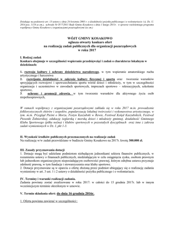 Działając na podstawie art. 13 ustawy z dnia 24 kwietnia 2003 r. o działalności pożytku publicznego i o wolontariacie ( tj. Dz. U. 2014 poz. 1118 ze zm.), uchwały Nr IV/7/2011 Rady Gminy Kosakowo z dnia 1 lutego 2011r. w sprawie wieloletniego programu współpracy Gminy Kosakowo z organizacjami pozarządowymi (ze zm.) WÓJT GMINY KOSAKOWO ogłasza otwarty konkurs ofert na realizację zadań publicznych dla organizacji pozarządowych w roku 2017 I. Rodzaj zadań Konkurs obejmuje w szczególności wspieranie przedsięwzięć i zadań o charakterze lokalnym w dziedzinach: 1. rozwoju kultury i ochrony dziedzictwa narodowego, w tym wspieranie amatorskiego ruchu artystycznego i harcerstwa 2. rozwijania działalności w zakresie kultury fizycznej i sportu oraz tworzenie warunków sprzyjających rozwojowi i upowszechnianiu sportu wśród dzieci i młodzieży, w tym w szczególności organizacja i uczestnictwo w zawodach sportowych, imprezach sportowo – rekreacyjnych, szkolenie sportowe, 3. ochrony i promocji zdrowia, w tym tworzenie warunków dla aktywnego życia osób niepełnosprawnych, W ramach współpracy z organizacjami pozarządowymi zakłada się w roku 2017 m.in. prowadzenie folklorystycznych chórów i zespołów, popularyzację lokalnej twórczości i wykonawstwa artystycznego, w tym. m.in. Przegląd Pieśni o Morzu, Festyn Kaszubski w Rewie, Festiwal Kolęd Kaszubskich, Festiwal Piosenki Żołnierskiej, edukację żeglarską i morską dzieci i młodzieży gminnej, działalność Gminnego Klubu Sportowego (piłka nożna) i klubów sportowych w pozostałych dyscyplinach oraz inne z zakresu zadań wymienionych w Dz. I, pkt 1-3. II. Wysokość środków publicznych przeznaczonych na realizacje zadań Na realizację w/w zadań przewidziano w budżecie Gminy Kosakowo na 2017r. kwotę 300.000 zł. III. Zasady przyznawania dotacji 1. Dotacje mogą być udzielane podmiotom niebędącym jednostkami sektora finansów publicznych, w rozumieniu ustawy o finansach publicznych, niedziałającym w celu osiągnięcia zysku, osobom prawnym lub jednostkom organizacyjnym nieposiadającym osobowości prawnej, którym odrębna ustawa przyznaje zdolność prawną, w tym fundacje i stowarzyszenia oraz kluby sportowe. 2. Dotacje przyznawane są w oparciu o ofertę złożoną przez podmiot ubiegający się o realizację zadania wymieniony w art. 3 ust. 1 i 2 ustawy o działalności pożytku publicznego i o wolontariacie. IV. Terminy i warunki realizacji zadania. Zadania powinny zostać zrealizowane w roku 2017: w całości do 15 grudnia 2017r. lub w innym wcześniejszym terminie określonym w umowie. V. Termin składania ofert: do dnia 16 grudnia 2016r. 1. Oferta powinna zawierać w szczególności:: 1) szczegółowy zakres rzeczowy zadania publicznego proponowanego do realizacji; 2) termin i miejsce realizacji zadania publicznego; 3) kalkulację przewidywanych kosztów realizacji zadania publicznego 4) informacje o wcześniejszej działalności organizacji pozarządowej lub podmiotów wymienionych w art. 3 ust. 3 ustawy o działalności pożytku publicznego i o wolontariacie 5) informację o posiadanych zasobach rzeczowych i kadrowych zapewniających wykonanie zadania publicznego oraz o planowanej wysokości środków finansowych na realizację danego zadania pochodzących z innych źródeł 6) deklarację o zamiarze odpłatnego lub nieodpłatnego wykonania zadania publicznego 2. Za ofertę spełniającą wymogi formalne uznaje się ofertę: 1/ złożoną na obowiązującym formularzu (załącznik Nr 1 do Rozporządzenia Ministra Rodziny, Pracy i Polityki Społecznej z dnia 17 sierpnia 2016 r. w sprawie wzorów ofert i ramowych wzorów umów dotyczących realizacji zadań publicznych oraz wzorów sprawozdań z wykonania tych zadań – Dz. U. z 2016 r. poz. 1300) i w terminie wskazanym w ogłoszeniu, 2/ podpisaną przez osoby uprawnione 3/ posiadającą wymagane załączniki (wymienione we wzorze oferty). 3. Wszystkie wymagane załączniki do oferty muszą być oryginałami lub kopiami poświadczonymi za zgodność z oryginałem. 4. Oferty dotyczące projektów, wykraczających poza zadania określone w ogłoszeniu o konkursie, nie będą rozpatrywane. Za poprawność złożonej oferty odpowiada składający. VI. Tryb i kryteria stosowane przy wyborze ofert oraz termin dokonania wyboru ofert 1. Złożone w otwartym konkursie oferty analizuje i ocenia powołana przez Wójta Gminy komisja konkursowa. W skład komisji wchodzą przedstawiciele organu wykonawczego Gminy (wójta) oraz przedstawiciele organizacji pozarządowych (reprezentanci sektora pozarządowego nie mogą brać udziału w posiedzeniu komisji, jeśli organizacja, którą reprezentują bierze udział w konkursie). Tryb powoływania i zasady działania komisji do opiniowania ofert w otwartych konkursach ofert określa uchwała Rady Gminy Kosakowo w sprawie wieloletniego programu współpracy Gminy Kosakowo z organizacjami pozarządowymi. Komisja przedstawia Wójtowi propozycję podziału środków finansowych na poszczególne zadania wynikające z ofert. 2. Wójt, biorąc pod uwagę rekomendację komisji konkursowej oraz wysokość środków przeznaczonych w budżecie na dotacje dla organizacji pozarządowych w danym roku, zatwierdza do realizacji najkorzystniejsze oferty. Po zatwierdzeniu przez Wójta wybór ofert jest ostateczny. 3. Organ administracji publicznej przy rozpatrywaniu ofert: 1) ocenia możliwość realizacji zadania publicznego 2) ocenia przedstawiona kalkulacje kosztów realizacji zadania publicznego 3) przy wspieraniu wykonania zadania publicznego uwzględnia planowany przez organizację udział środków finansowych własnych oraz pochodzących z innych źródeł 4) uwzględnia planowany wkład rzeczowy 5) uwzględnia analizę i ocenę realizacji zleconych zadań publicznych przez organizację pozarządową lub podmiot wymieniony w art. 3 ust. 3 ustawy o działalności pożytku publicznego i o wolontariacie w latach poprz