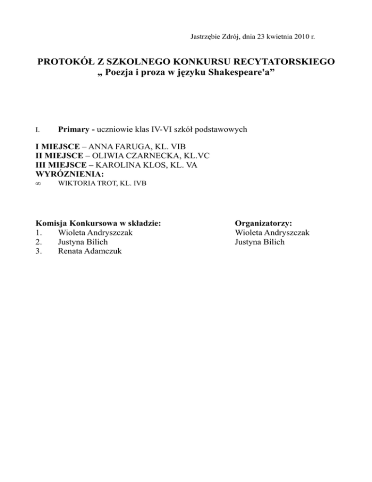 Jastrzębie Zdrój, dnia 23 kwietnia 2010 r. PROTOKÓŁ Z SZKOLNEGO KONKURSU RECYTATORSKIEGO „ Poezja i proza w języku Shakespeare'a” I. Primary - uczniowie klas IV-VI szkół podstawowych I MIEJSCE – ANNA FARUGA, KL. VIB II MIEJSCE – OLIWIA CZARNECKA, KL.VC III MIEJSCE – KAROLINA KLOS, KL. VA WYRÓZNIENIA: • WIKTORIA TROT, KL. IVB Komisja Konkursowa w składzie: 1. Wioleta Andryszczak 2. Justyna Bilich 3. Renata Adamczuk Organizatorzy: Wioleta Andryszczak Justyna Bilich Jastrzębie Zdrój, dnia 09 kwietnia 2010 r. PROTOKÓŁ Z SZKOLNEGO ETAPU KONKURSU „ The Globe” I MIEJSCE – KRZYSZTOF WYSMOLIŃSKI, KL. VIC II MIEJSCE – ALEKSANDRA RZEPKA, KL. VIC III MIEJSCE –ANNA FARUGA, KL. VIB Komisja Konkursowa w składzie: 4. Wioleta Andryszczak 5. Justyna Bilich Organizator: Justyna Bilich Jastrzębie Zdrój, dnia 21 kwietnia 2010 r. PROTOKÓŁ Z SZKOLNEGO KONKURSU „ English Dictation Contest” I MIEJSCE – MICHAŁ PYTRACZYK, KL. VIC II MIEJSCE – ALEKSANDRA KANIA, KL. VC ŁUKASZ RYDZON, KL. VIC III MIEJSCE –AGATA KORONOWSKA, KL VC Komisja Konkursowa w składzie: 6. Wioleta Andryszczak 7. Justyna Bilich Organizatorzy: Wioleta Andryszczak Justyna Bilich