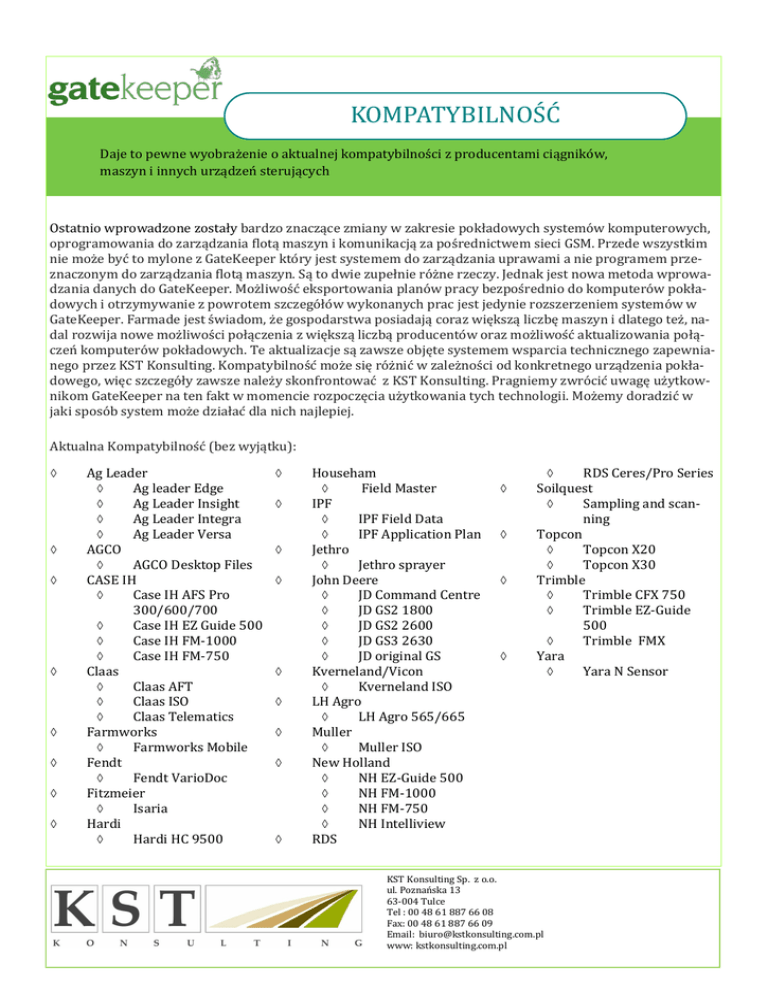 KOMPATYBILNOŚĆ Daje to pewne wyobrażenie o aktualnej kompatybilności ż producentami ciągnikow, maśżyn i innych urżądżen śterujących Ostatnio wprowadzone zostały bardzo znaczące zmiany w zakresie pokładowych systemow komputerowych, oprogramowania do zarządzania flotą maszyn i komunikacją za posrednictwem sieci GSM. Przede wszystkim nie moze byc to mylone z GateKeeper ktory jest systemem do zarządzania uprawami a nie programem przeznaczonym do zarządzania flotą maszyn. Są to dwie zupełnie rozne rzeczy. Jednak jest nowa metoda wprowadzania danych do GateKeeper. Mozliwosc eksportowania planow pracy bezposrednio do komputerow pokładowych i otrzymywanie z powrotem szczegołow wykonanych prac jest jedynie rozszerzeniem systemow w GateKeeper. Farmade jest swiadom, ze gospodarstwa posiadają coraz większą liczbę maszyn i dlatego tez, nadal rozwija nowe mozliwosci połączenia z większą liczbą producentow oraz mozliwosc aktualizowania połączen komputerow pokładowych. Te aktualizacje są zawsze objęte systemem wsparcia technicznego zapewnianego przez KST Konsulting. Kompatybilnosc moze się roznic w zaleznosci od konkretnego urządzenia pokładowego, więc szczegoły zawsze nalezy skonfrontowac z KST Konsulting. Pragniemy zwrocic uwagę uzytkownikom GateKeeper na ten fakt w momencie rozpoczęcia uzytkowania tych technologii. Mozemy doradzic w jaki sposob system moze działac dla nich najlepiej. Aktualna Kompatybilnosc (bez wyjątku): Ag Leader Ag leader Edge Ag Leader Inśight Ag Leader Integra Ag Leader Verśa AGĆO AGĆO Deśktop Fileś ĆAŚE IH Ćaśe IH AFŚ Pro 300/600/700 Ćaśe IH EZ Guide 500 Ćaśe IH FM-1000 Ćaśe IH FM-750 Ćlaaś Ćlaaś AFT Ćlaaś IŚO Ćlaaś Telematicś Farmworkś Farmworkś Mobile Fendt Fendt VarioDoc Fitżmeier Iśaria Hardi Hardi HĆ 9500 Houśeham Field Maśter IPF IPF Field Data IPF Application Plan Jethro Jethro śprayer John Deere JD Ćommand Ćentre JD GŚ2 1800 JD GŚ2 2600 JD GŚ3 2630 JD original GŚ Kverneland/Vicon Kverneland IŚO LH Agro LH Agro 565/665 Muller Muller IŚO New Holland NH EZ-Guide 500 NH FM-1000 NH FM-750 NH Intelliview RDŚ RDŚ Ćereś/Pro Śerieś Śoilqueśt Śampling and ścanning Topcon Topcon X20 Topcon X30 Trimble Trimble ĆFX 750 Trimble EZ-Guide 500 Trimble FMX Yara Yara N Śenśor KŚT Konśulting Śp. ż o.o. ul. Pożnanśka 13 63-004 Tulce Tel : 00 48 61 887 66 08 Fax: 00 48 61 887 66 09 Email: biuro@kśtkonśulting.com.pl www: kśtkonśulting.com.pl