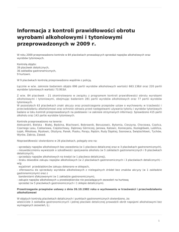 Informacja z kontroli prawidłowości obrotu wyrobami alkoholowymi i tytoniowymi przeprowadzonych w 2009 r. W roku 2009 przeprowadzono kontrole w 84 placówkach prowadzących sprzedaż napojów alkoholowych oraz wyrobów tytoniowych. Kontrolą objęto: 39 placówek detalicznych, 36 zakładów gastronomicznych, 9 hurtowni. W 9 placówkach kontrolę przeprowadzono wspólnie z policją. Łącznie w w/w. zakresie badaniem objęto 696 partii wyrobów alkoholowych wartości 663.138zł oraz 220 partii wyrobów tytoniowych wartości 73.953zł. Z w/w. 84 placówek - 21 skontrolowano w związku z programem kontroli prawidłowości obrotu wyrobami alkoholowymi i tytoniowymi, obejmując badaniem 281 partii wyrobów alkoholowych oraz 77 partii wyrobów tytoniowych. W pozostałych 63 placówkach znaki akcyzy oraz przestrzeganie przepisów ustaw o wychowaniu w trzeźwości i przeciwdziałaniu alkoholizmowi oraz ochronie zdrowia przed następstwami używania tytoniu i wyrobów tytoniowych badano w toku kontroli przeprowadzanych na podstawie i w zakresie otrzymanych informacji. Sprawdzono 415 partii alkoholu oraz 143 partie wyrobów tytoniowych. Kontrole przeprowadzono na terenie: Aleksandrii, Bielska - Białej, Będzina, Blachowni, Bobrownik, Boruszowic, Bytomia, Cieszyna, Chorzowa, Czańca, Czarnego Lasu, Czekanowa, Częstochowy, Dąbrowy Górniczej, Janowa, Katowic, Koniecpolu, Koziegłówek, Lublińca, Łojek, Mikołowa, Mysłowic, Olsztyna, Panek, Piasku, Poraju, Rędzin, Rudy Śląskiej, Sosnowca, Świętochłowic, Tychów, Wyrów, Zabrza, Zawad. Nieprawidłowości stwierdzono w 26 placówkach, polegały one na: - sprzedaży napojów alkoholowych bez zezwolenia (w 1 placówce detalicznej oraz w 3 placówkach gastronomicznych), - nieuwidocznieniu wywieszek o szkodliwości spożywania alkoholu (w 5 zakładach gastronomicznych i 9 placówkach detalicznych), - sprzedaży napojów alkoholowych na kredyt (w 1 placówce detalicznej), - braku dowodów zakupu napojów alkoholowych (w 2 placówkach gastronomicznych i 3 placówkach detalicznych) w/g wyjaśnień przedsiębiorców zakupu dokonano w sklepach, - oferowaniu do sprzedaży wyrobów alkoholowych z nielegalnych źródeł bez znaków akcyzy (w 1 zakładzie gastronomicznym) oraz z banderolami sfałszowanymi (w 1 zakładzie gastronomicznym), - zakupie napojów alkoholowych u przedsiębiorców nie posiadających zezwoleń na hurtową sprzedaż (w 5 placówkach gastronomicznych i 1 sklepie detalicznym). Przestrzeganie przepisów ustawy z dnia 26.10.1982 roku o wychowaniu w trzeźwości i przeciwdziałaniu alkoholizmowi W objętych kontrolą placówkach detalicznych i punktach gastronomicznych stwierdzono, że: właściciele 3 zakładów gastronomicznych i jednej placówki detalicznej prowadzili obrót napojami alkoholowymi bez wymaganych zezwoleń, tj.: 1 - właściciele baru „Hutnik" w Dąbrowie Górniczej prowadzili sprzedaż napojów alkoholowych zawierających do 4,5 proc. alkoholu i piwa oraz powyżej 18 proc. alkoholu bez wymaganych zezwoleń szacunkowej wartości 500zł. W toku kontroli stwierdzono w sprzedaży 12 but. a' 500 ml oryginalnie zamkniętych, z etykietą „wódka Soplica Szlachetna Polska", wypełnionych bezbarwnym płynem i 1 but. a' 500 ml pustą z ww. etykietą oraz 961 but. lub puszek różnych rodzajów piwa. W dniu kontroli właściciele wstrzymali sprzedaż napojów alkoholowych, a funkcjonariusze Komendy Miejskiej Policji w Dąbrowie Górniczej dokonali ich zabezpieczenia. Do ww. Komendy skierowano zawiadomienie o podejrzeniu popełnienia przez właściciela baru przestępstwa z art. 43 ust. 1 ustawy o wychowaniu w trzeźwości i przeciwdziałaniu alkoholizmowi. Skierowano informację do Urzędu Miasta i Urzędu Skarbowego w Dąbrowie Górniczej; - właścicielka baru „Sport Pub" w Tychach wprowadziła do sprzedaży napoje alkoholowe zawierające powyżej 4,5 proc. do 18 proc. alkoholu i powyżej 18 proc. alkoholu bez wymaganych zezwoleń, szacunkowej wartości 3900zł. Na stanie zakładu i w ofercie handlowej znajdowało się 12 partii piwa, 7 partii wina i 12 partii wódki łącznej wartości zł 1760,-. Właścicielka zaopatrywała się w wyroby spirytusowe w placówkach detalicznych. Funkcjonariusze Komendy Miejskiej Policji w Tychach dokonali ich zabezpieczenia. W związku z powyższym skierowano do ww. Komendy zawiadomienie o podejrzeniu popełnienia przez właścicielkę baru przestępstwa z art. 43 ust. 1 ustawy o wychowaniu w trzeźwości i przeciwdziałaniu alkoholizmowi oraz informację do Urzędu Miasta w Tychach; - w barze „Elektryk" w Bytomiu właścicielka wprowadziła do sprzedaży piwo oraz napoje zawierające powyżej 18 proc. alkoholu bez wymaganych zezwoleń, szacunkowej wartości 8100zł. Na stanie zakładu i w ofercie handlowej znajdowało się 8 asortymentów piwa i 11 asortymentów wyrobów spirytusowych łącznej wartości 423zł. Właścicielka okazała zezwolenia na sprzedaż napojów alkoholowych, które wygasły na mocy decyzji wydanej przez Prezydenta Miasta Bytomia, podtrzymanej decyzją Samorządowego Kolegium Odwoławczego w Katowicach. Z okazanych faktur wynikało, iż w okresie 1.10 do 31.11.2009 roku właścicielka zakupiła 59 but. wyrobów spirytusowych i 1342 but. piwa. W toku kontroli funkcjonariusze Komendy Miejskiej Policji w Bytomiu dokonali zabezpieczenia znajdujących się na stanie zakładu napojów alkoholowych. Ponadto do ww. Komendy skierowano zawiadomienie o popełnieniu przez właśc. baru przestępstwa z art. 43 ust. 1 ustawy o wychowaniu w trzeźwości i przeciwdziałaniu alkoholizmowi. Skierowano również informację do Urzędu Miejskiego w Tychach; - w sklepie spożywczo-przemysłowym w Bytomiu właściciel dokonał sprzedaży 1167 op. piwa szacunkowej wartości 2.800zł. bez wymaganego zezwolenia. W/wym. posiadał zezwolenie na wyprzedaż zinwentaryzowanych 2112 op. jednostkowych piwa puszkowego i butelkowego (402 op. znajdowało się na stanie placówki), a z rozlic