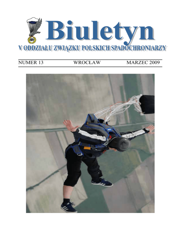 NUMER 13 WROCŁAW MARZEC 2009 Od Redakcji „ Dni zimowe szybko miną, wiosna majem wróci” – słowa ze starej piosenki przywołują nadzieję szybkiego powrotu do aktywniejszego życia w ciepłej, pachnącej łąkowymi kwiatkami murawy lotniska, która wyzwalała w nas i nadal wyzwala chęć czerpania nowych wrażeń z uprawiania, czy też przebywania w atmosferze działalności spadochronowej każdego, na miarę możliwości swoich lat. Skoki wyczynowe, rekreacyjne, praca szkoleniowa, czy organizacyjna i propagandowa wiąże spadochroniarzy w poszczególnych etapach wykonywania zadań. Kolejnością rzeczy ludzi, którzy z zamiłowania uprawiają spadochroniarstwo jest przechodzenie tych szczebli i wnoszenie swoich doświadczeń w to środowisko, dla jego rozwijania i podnoszenia na wyższy poziom wyników sportowych, czy pracy szkoleniowej a także kultywowania osiągniętych sukcesów i przekazywania ich następnym pokoleniom. W każdym etapie tej działalności jesteśmy sobie potrzebni. Dla trwania tej dziedziny w sposób nam przyjazny, potrzeba nam współpracy międzypokoleniowej spadochroniarzy. Każdy etap kiedyś się kończy i nie powinien nas wówczas eliminować, nie każdy też ma predyspozycje i możliwości przejścia do zawodowego szkolnictwa, czy pracy organizatorskiej w spadochroniarstwie, ale każdy może być czynnym uczestnikiem życia swojego środowiska spadochronowego z którym był na długie lata związany. Martwi więc trochę fakt zmniejszania się czynnej liczebności naszych członków ZPS-u a przecież nic to nas nie kosztuje / roczna składka członkowska – 12 zł. nie jest chyba żadnym obciążeniem finansowym zważywszy, że tradycyjne ogniskowe spotkania, przynajmniej dwa razy w roku, można uznać za wesołe, dobrze zorganizowane przyjęcie, dogodzić przy tym podniebieniu i mile spędzić wiosenny, czy jesienny weekend z kolegami z pod znaku czaszy /. Ubiegły rok minął różnie dla naszych spadochroniarzy. Rozwiązanie Zakładu Spadochroniarstwa w WSOWLąd. zubożyło wrocławskie środowisko i pozostawiło głęboki niesmak w duszy spadochroniarzy wojskowych i nie tylko. Cieszy fakt znacznego poprawienia się samopoczucia kolegów z OSWRiS w Poznaniu /dawniej Bydgoszcz, Oleśnica/, którzy, miejmy nadzieję na dłużej zakotwiczyli się w 31 Bazie LT i wszystko wskazuje na osiągnięcie wreszcie, dawno oczekiwanych warunków dla zdrowego funkcjonowania tego rodzaju ośrodka. Naszym jedynym już reprezentantom – Aeroklubowwi Wrocławskiemu życzymy udanych startów w kolejnych imprezach spadochronowych a Ośrodkowi ZPS-u, szerszego rozłożenia skrzydeł a raczej czasz, aby w tym a może i w kolejnym roku, przełamał stagnację i wzmocnił ofertę szkolenia dla zagranicznych grup, na kończących niebawem resurs spadochronach desantowych i wzmocnił choć niewielkim saldem działalność Oddziału ZPS. W niedzielę 22.03. 2009 r. zobaczymy się z pewnością na sprawozdawczym zebraniu V Oddziału, podsumowującym dwuletnią działalność, na którym spodziewamy się usłyszeć, mimo krajowego kryzysu, dobrych perspektyw dla naszej związkowej organizacji. Wojciech Soleżyński 2 KONIEC SPADOCHRONIARSTWA W WYŻSZEJ SZKOLE OFICERSKIEJ WOJSK LADOWYCH WE WROCŁAWIU ZAKŁAD SPADOCHRONIARSTWA – ROZWIĄZANY Z końcem roku 2008 po 44 latach aktywnej działalności, zostaje rozwiązany Zakład Spadochroniarstwa w Wyższej Szkole Oficerskiej Wojsk Lądowych we Wrocławiu. W dniu 21.11.2008 roku kadra Zakładu Spadochroniarstwa Wyższej Szkoły Oficerskiej Wojsk Lądowych zorganizowała uroczystość podsumowania 44-letniej działalności szkoleniowej, zapraszając na nią wszystkich swoich, byłych i obecnych etatowych pracowników Zakładu, przedstawicieli Komendy Szkoły, jednostek wojskowych i instytucji współpracujących z Zakładem w procesie szeroko pojętego uczestnictwa w szkoleniu i realizacji wykonywanych zadań. Po przedstawieniu przez Kierownika Zakładu ppłk. dr Lecha Plezię referatu z całokształtu prowadzonej przez okres istnienia działalności, przybyli delegaci z żalem składali na jego ręce podziękowania za wzorową wręcz współpracę, przekazując też na jego ręce pożegnalne, symboliczne upominki. W tej smutnej okazjonalnej atmosferze, wielu mówcom trudno było wypowiadać słowa przy załamującym się głosie, nie mogącym pogodzić się z rozwiązaniem tej dynamicznej, profesjonalnej i wszechstronnej spadochronowej placówki, działającej w tej szkole na rzecz wojsk PD, rozpoznawczych i rozwijających się wojsk aerobilnych, mając doświadczoną kadrę, oraz wspaniałą bazę szkoleniową i socjalną. Swoje podziękowania wygłosili przedstawiciele: Szefa Wojsk Aerobilnych - płk. Zbigniew Stec, Dowództwa 6BDSz - płk.Tomasz Piekarski, Dowództwa 3BLot. - płk. Mirosław Molik, Dowództwa 3 Eskadry Lotnictwa Transportowego ppłk. Grzegorz Wiatrak, Dowództwa Sił Specjalnych – mjr. Marek Sobolewski, Komendant Instytutu Dowodzenia ppłk. Dariusz Nieke, Komendant Ośrodka Szkol. Wys-Rat. i Spadochron. ppłk. Krzysztof Szopiński, Pododdziałów Antyterrorystycznych Policji insp. Ryszard Biały, Organizator szkolenia Komendant Instytutu Dowodzenia WSOWLad.spadochronowego w płk.dr Tadeusz Dakudowicz, OSWZmech. ówczesny Były Kier. Zakł. - płk/r/ mgr. Władysław Koźmiński kpt. Józef Dwernicki 3 W wielkim skrócie przypomnijmy rozwój i zakres działalności Zakładu. Szkolenie spadochronowe wprowadzone zostało do programu kształcenia podchorążych ówczesnej Szkoły Oficerskiej Wojsk Zmechanizowanych decyzją Głównego Inspektora Szkolenia MON w 1964 roku, podyktowaną koniecznością przygotowania kadr dowódczych dla 6 Pomorskiej Dywizji Powietrznodesantowej i pododdziałów specjalnych a także potrzebą wyrabiania u podchorążych cech psychofizycznych i predyspozycji zawodowych niezbędnych każdemu dowódcy. Ten specyficzny dla Instruktorzy i zawodnicy Cyklu przed spadochroniarnią szkoły