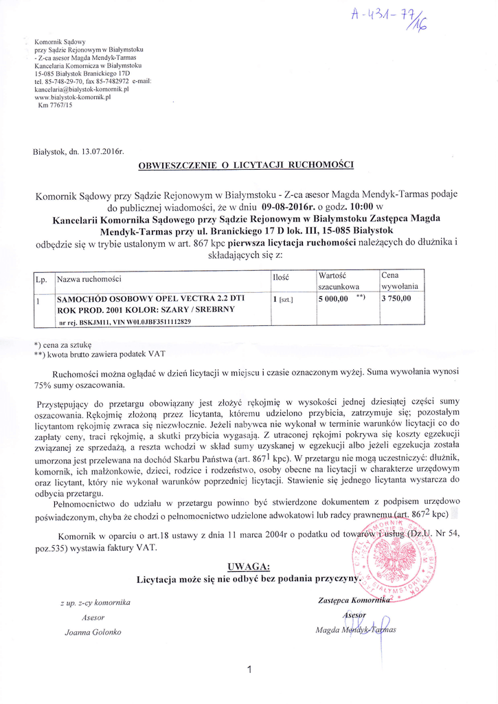 fi - t-t \Ą _ +?/r /Ąl. Komornik Sądowy przy Sądzie Rejonowymw Białymstoku - Z-ca asesor Magda Mendyk-Tarmas I(ancelaria Konrornicza w Białymstoku 15-085 Białystok Branickiego 17D tel' 85-748-Ż9-70, fax 85-7482972 ę-mail kancel [email protected] www.bialystok-komornik.pl Km 7767 /15 BiaĘstok, dn' l3.07.2016r" OBWIESZCZENIE o LICYTACJI RUCHoMoŚcI Komornik Sądowy przy Sądzie Rejonowym w Białymstoku - Z-ca xęsor Magda Mendyk-Tarmas podaje do publicznej wiadomości, że w dniu 09-08-2016r. o godz. 10:00 w Kancelarii Komornika Sądowego pY7ry Sądzie Rejonowym w BiaĘmstoku Zastępca Magda Mendyk-Tarmas przy ul. Branickiego 17 D lok. III' 15-085 BiaĘstok odbędzie się w trybie ustalonym w art. 867 kpc pierwsza licytacja ruchomościnaIeżącychdo dłużnikai składających się z: Lp. lość Nazwa ruchomości szacunkowa SAMOCHOD OSOBOWY OI'EL VECTRA 2,2DTI ROK PROD. 2001 KOLOR: SZARY / SREBRNY nr rei. Cena wvwołania Wartośó 1 [szt.] 5 ooo,oo **) 3 750,00 BSKJMIl, VIN W0L0JBF3511112829 *) cena zasrtukę **) kwota brffto zawiera podatek VAT Ruchomości mozna oglądaó w dzień licytacji w miejscu i czasię oznaczonymwyżęj.Suma wywołania wynosi 7 5%o sumy oszacowania. Przystępujący do przetargu obowiązany jest złoĘó rękojmię w wysokościjednej dziesiątej częścisumy or'u.o*uniu. Rękojmię złózoną przez \icytanta, któremu udzięlono przybicia, zatruymuje się; pozostaĘm licytantom rękojmĘ Zwraca się niezwłocznl,e. JężeIi nabywca nie wykonał w tetminie warunków licytacji co do ,upłuty ceny, tiaci rękojmię' a skutki przybicia wygasają. Z utraconej rękojmi pokrywa się koszty egzekucji związanej źe sprzeduzą, a reszta wclrodzi w skład sumy uzyskanej w egzekucji albo jeżeli egzekucja została umorzona jest przelewana na dochód Skarbu Państwa (aft.867I kpc). W przetargunie mogą uczestniczyć: dłuznik, komornik, ich małzonkowie, dzięci , rcdzice i rodzeństwo' osoby obecne na licytacji w charaktęrze urzędowym oraz |icytant, który nie wykonał warunków poprzedniej licytacji. Stawięnie się jednego licy'tanta wystarcza do odbycia przetatgu. Pęłnomocnictwo do udziału w przetargu powinno byó stwierdzone dokumęntem z podpisem urzędowo poświadczonym, chyba Że chodzio pełnomocnictwo udzielone adwokatowi lub radcy prawn'9!iltł€FL8 67Ż kpc) z''io tł \ Ą Nr 54, Komornikw oparciu o art.l8 ustawy zdnia 11marca 20O4r o podatku "a to*p{ó$Ę1it___łęs poz.535) wystawia laktury /łt.fiĘEffiffiY,'] l1 '| ;i,f,ffiff'ffgx ię, VAT. UWAGA; $irffi przyczy"Yi:i' odbyć bez podania przyczyny':;'.K,'ąN.t$di Licytacja może się nie odlryĆ . /-V(l rj z up. z-cy komornika Asesor .Ioanna Golonko a(Ylt'l$t.i Zustępca Komo I'Y'(/ , 'l n Magda Isf${fo!/bą]ńas i €l')