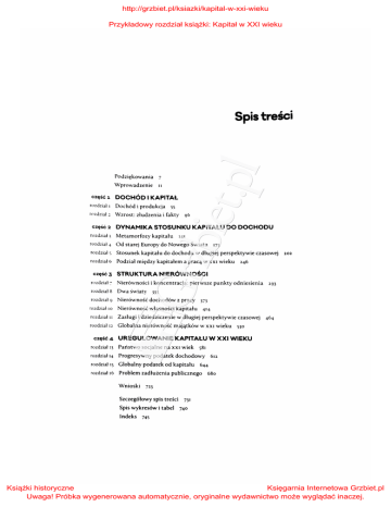 http://grzbiet.pl/ksiazki/kapital-w-xxi-wieku Przykładowy rozdział książki: Kapitał w XXI wieku Spistreści część 1 rozdział 1 rozdział~ część 2 rozdział< Podziękowania 7 Wprowadzenie 11 DOCHÓD l KAPITAl Dochód i produkcja 55 Wzrost: złudzenia i fakty 96 DYNAMIKA STOSUNKU KAPITAlU DO DOCHODU Metamorfozy kapitału 141 rozdział 4 Od starej Europy do Nowego Świata 173 rozdział :; Stosunek kapitału do dochodu w długiej perspektywie czasowej 202 rozdział 6 Podział między kapitałem a pracą w XXI wieku 246 część 3 STRUKTURA NIERÓWNOŚCI rozdział 7 rozdz1ał Nierówności i koncentracja: pierwsze punkty odniesienia 293 8 Dwa światy rozdziJ.ł 9 Nierówność 333 dochodów z pracy 373 rozdział 10 Nierówność własności kapitału rozdział 11 Zasługi rozdział 12 Globalna nierówność majątków w XXI wieku 530 część 4 rozdział 13 414 i dziedziczenie w długiej perspektywie czasowej 464 UREGULOWANIE KAPITAlU W XXI WIEKU Państwo socjalne na XXI wiek 581 rozdział 14 Progresywny podatek dochodowy 612 rozdział 15 Globalny podatek od kapitału 644 rozdział 16 Problem zadłużenia publicznego 68o Wnioski 723 Szczegółowy spis treści 731 Spis wykresów i tabel 740 Indeks 745 Książki historyczne Księgarnia Internetowa Grzbiet.pl Uwaga! Próbka wygenerowana automatycznie, oryginalne wydawnictwo może wyglądać inaczej. http://grzbiet.pl/ksiazki/kapital-w-xxi-wieku Przykładowy rozdział książki: Kapitał w XXI wieku Podziękowania Książka ta jest podsumowaniem piętnastu lat badań (1998-2013) poświęco nych głównie historycznej dynamice rozwoju dochodów i majątków. Znacz na część tych badań była prowadzona we współpracy z innymi badaczami. Wkrótce po opublikowaniu Les hau ts revenus en France au xxe siec/e w 2001 roku miałem szczęście skorzystać z entuzjastycznego wsparcia Anthony'ego Atkinsona i Emmanuela Saeza. Bez nich ten skromny francuski projekt bez wątpienia nie uzyskałby takiego międzynarodowego zasięgu, jakim cieszy się dzisiaj. Tony, który w latach twórczego dojrzewania był dla mnie wzo rem, stał się pierwszym czytelnikiem mojej pracy historycznej o nierów nościach we Francji, po czym natychmiast zajął się przypadkiem Wielkiej Brytanii, a potem wielu innych krajów. Wspólnie przygotowaliśmy dwa opa słe tomy, wydane w 2007 i 2010 roku, obejmujące łącznie ponad dwadzieś cia krajów i stanowiące największą dostępną do tej pory bazę danych o hi storycznej ewolucji nierówności dochodów. Natomiast z Emmanuelem zajęliśmy się z kolei przypadkiem Stanów Zjednoczonych. Wydobyliśmy na światło dzienne zawrotny wzrost dochodów jednego procenta najbogat szych Amerykanów od lat 70. i Bo. xx wieku, co odbiło się szerokim echem za Atlantykiem. Prowadziliśmy również wspólnie wiele badań nad teorią optymalnego opodatkowania dochodu i kapitału. Nasze badania znacząco wzbogaciły tę książkę, która im wiele zawdzięcza. Także moje spotkanie z Gilles'em Postelem-Vinaym i )eanem-Laurentem Rosenthalem oraz badania historyczne, które nadal prowadzimy w pary skich archiwach spadkowych, poczynając od epoki rewolucji francuskiej aż po dzień dzisiejszy, miały na tę książkę istotny wpływ. Uzmysłowiły mi one materialny i żywy wymiar majątku i kapitału, jak również prob lemy związane z ich rejestracją. Przede wszystkim jednak Gilles i )ean -Laurent pozwolili mi lepiej zrozumieć rozliczne podobieństwa - jak i róż nice - między strukturami własności w czasach belle epoque a początkiem XXI wieku. Książki historyczne Księgarnia Internetowa Grzbiet.pl Uwaga! Próbka wygenerowana automatycznie, oryginalne wydawnictwo może wyglądać inaczej. http://grzbiet.pl/ksiazki/kapital-w-xxi-wieku Przykładowy rozdział książki: Kapitał w XXI wieku 8 PODZIĘKOWANIA tej pracy zawdzięcza ogromnie dużo wszystkim doktorantom , z którymi miałem okazję pracować przez ostatnie naukowcom i młodym piętnaście lat. Poza ich bezpośrednim wkładem w wykorzystane tu mate· riały, ich badania i energia współtworzyły klimat intelektualnego wrzenia, w którym powstawała ta książka. Wymienienia wymagają zwłaszcza: Fa cundo Alvaredo, Laurent Bach, Antoine Bozio, Clement Carbonnier, Fabien Dell, Gabrielle Fack, Nicolas Fremeaux, Lucie Gadenne, )ulien Grenet, Elise Huilery, Camille Landais, loana Marinescu, Elodie Morival, Nancy Qian, Dorothee Rouzet, Stefanie Stantcheva, Juliana Londono Velez, Guillaume ~aint-)acques, Christoph Schinke, Aurelie Sotura, Mathieu Valdenaire, Ga briel Zucman. W szczególności bez Facunda Alvareda i jego skuteczności, obowiązkowości oraz talentu koordynatorskiego nie powstałaby szeroko wykorzystywana w tej książce baza World Top lncomes Database. Bez en tuzjazmu Camille'a Landais'a światła dziennego nigdy nie ujrzałby nasz projekt partycypacyjny w sprawie "rewolucji fiskalnej': Bez dokładności i niezwykłej pracowitości Gabriela Zucmana nie mógłbym pracować nad historyczną ewolucją stosunku kapitału do dochodu w zamożnych krajach, Całość odgrywającą w tej książce kluczową rolę. Chciałbym także podziękować instytucjom, które umożliwiły realizację tego projektu, w pierwszej kolejności Ecole des hautes etudes en sciences sociales, gdzie od 2000 roku jestem dyrektorem badań, oraz Ecole normale superieure i wszystkim innym instytucjom założycielskim Ecole d'economie de Paris, której profesorem jestem od jej powstania, po sprawowaniu funkcji pierwszego dyrektora w latach 2005-2007. Przystając na połączenie wysił ków i rolę mniejszościowego partnera w projekcie szerszym od sumy ich indywidualnych interesów, instytucje te pozwoliły na powstanie skrom nego dobra publicznego, które - mam nadzieję - przyczyni się do rozwoju wieiobiegunowej ekonomii politycznej w XXI wieku. Wreszcie, dziękuję moim trzem drogim córkom, )uliette, Deborah i He lene, za miłość i siłę, którą mi dają. l dziękuję Julii, kt