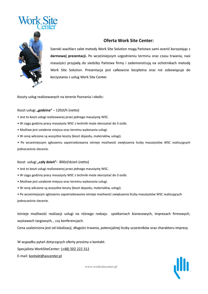 Oferta Work Site Center: Szeroki wachlarz zalet metody Work Site Solution mogą Państwo sami ocenić korzystając z darmowej prezentacji. Po wcześniejszym uzgodnieniu terminu oraz czasu trwania, nasi masażyści przyjadą do siedziby Państwa firmy i zademonstrują na ochotnikach metodę Work Site Solution. Prezentacja jest całkowicie bezpłatna oraz nie zobowiązuje do korzystania z usług Work Site Center. Koszty usług realizowanych na terenie Poznania i okolic: Koszt usługi „godzina” – 120zł/h (netto) • Jest to koszt usługi realizowanej przez jednego masażystę WSC. • W ciągu godziny pracy masażysty WSC z techniki może skorzystać do 3 osób. • Możliwe jest ustalenie miejsca oraz terminu wykonania usługi. • W cenę wliczone są wszystkie koszty (koszt dojazdu, materiałów, usługi). • Po wcześniejszym zgłoszeniu zapotrzebowania istnieje możliwość zwiększenia liczby masażystów WSC realizujących jednocześnie zlecenie. Koszt usługi „cały dzień”- 800zł/dzień (netto) • Jest to koszt usługi realizowanej przez jednego masażystę WSC. • W ciągu godziny pracy masażysty WSC z techniki może skorzystać do 3 osób. • Możliwe jest ustalenie miejsca oraz terminu wykonania usługi. • W cenę wliczone są wszystkie koszty (koszt dojazdu, materiałów, usługi). • Po wcześniejszym zgłoszeniu zapotrzebowania istnieje możliwość zwiększenia liczby masażystów WSC realizujących jednocześnie zlecenie. Istnieje możliwość realizacji usługi na różnego rodzaju spotkaniach biznesowych, imprezach firmowych, wystawach targowych, , czy konferencjach. Cena uzależniona jest od lokalizacji, długości trwania, potencjalnej liczby uczestników oraz charakteru imprezy. W wypadku pytań dotyczących oferty prosimy o kontakt: Specjalista WorkSiteCenter: (+48) 502 222 312 E-mail: [email protected] www.worksitecenter.pl