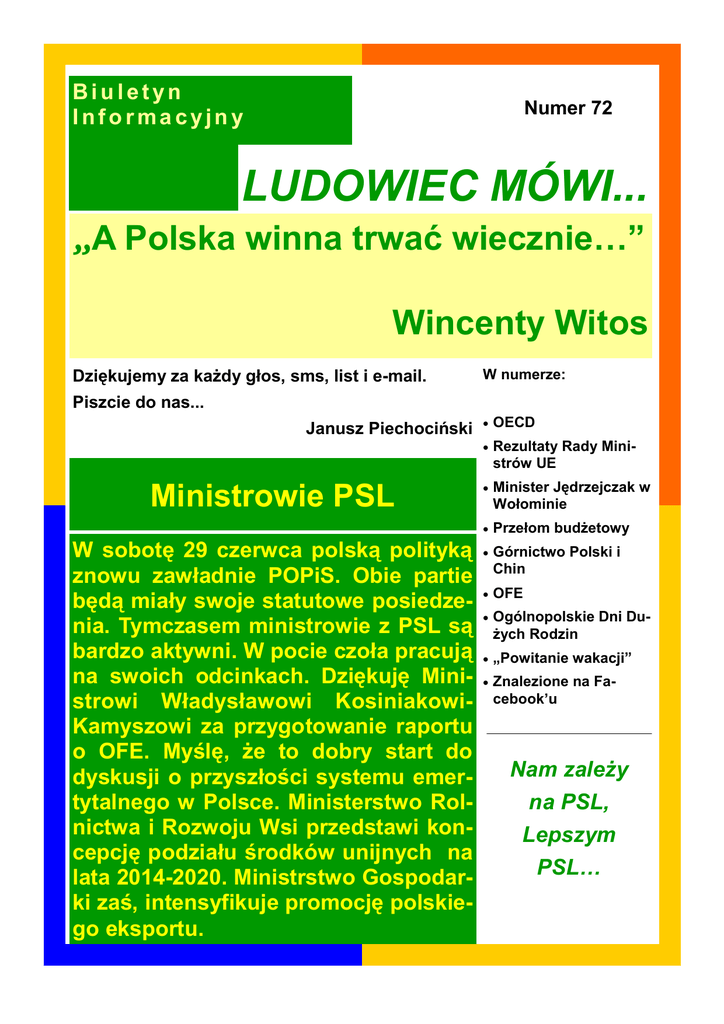 Biuletyn Informacyjny Numer 72 LUDOWIEC MÓWI... „A Polska winna trwać wiecznie…” Wincenty Witos Dziękujemy za kaŜdy głos, sms, list i e-mail. W numerze: Piszcie do nas... Janusz Piechociński Ministrowie PSL W sobotę 29 czerwca polską polityką znowu zawładnie POPiS. Obie partie będą miały swoje statutowe posiedzenia. Tymczasem ministrowie z PSL są bardzo aktywni. W pocie czoła pracują na swoich odcinkach. Dziękuję Ministrowi Władysławowi KosiniakowiKamyszowi za przygotowanie raportu o OFE. Myślę, Ŝe to dobry start do dyskusji o przyszłości systemu emertytalnego w Polsce. Ministerstwo Rolnictwa i Rozwoju Wsi przedstawi koncepcję podziału środków unijnych na lata 2014-2020. Ministrstwo Gospodarki zaś, intensyfikuje promocję polskiego eksportu. • OECD • Rezultaty Rady Ministrów UE • Minister Jędrzejczak w Wołominie • Przełom budŜetowy • Górnictwo Polski i Chin • OFE • Ogólnopolskie Dni DuŜych Rodzin • „Powitanie wakacji” • Znalezione na Facebook’u Nam zaleŜy na PSL, Lepszym PSL… LUDOWIEC MÓWI... Str. 2 Kraje Eurazji atrakcyjnym partnerem gospodarczym UE - PołoŜenie geograficzne tych państw na przecięciu szlaków handlowych z Azji do Europy, znaczne zasoby minerałów i kopalin, surowców energetycznych i rozwój rolnictwa sprawiają, iŜ obszar ten jest postrzegany przez polskich przedsiębiorców jako atrakcyjny i perspektywiczny - powiedział wicepremier, minister gospodarki Janusz Piechociński podczas otwarcia Forum Biznesu. Spotkanie zorganizowane w ramach Konferencji Ministerialnej OECD odbyło się 27 czerwca 2013 r. w MG. Szef resortu gospodarki podkreślił, Ŝe kraje regionu Eurazji odgrywają waŜną rolę w relacjach Polski z zagranicą. - Kierujemy tam prawie 5 proc. naszego eksportu o wartości 8,5 mld dol. Dlatego duŜe znaczenie dla rozwoju współpracy będzie miało stworzenie we wszystkich krajach Eurazji transparentnych warunków inwestycyjnych – powiedział. W opinii wicepremiera w relacjach biznesowych duŜym wsparciem jest unijny Program Konkurencyjności „Eurazja”, którego załoŜeniem jest przeprowadzenie kompleksowej oceny, wypracowanie rekomendacji oraz dostosowywanie do standardów OECD polityk prowadzonych przez 13 uczestniczących w nim państw. - Podejmowane w ramach Programu działania mają na celu nie tylko wsparcie rządów w procesie reform gospodarczych, ale równieŜ ułatwienie prowadzenia działalności gospodar- czej w krajach regionu – powiedział wicepremier Piechociński. - Mołdawii - pod przewodnictwem wicepremiera i ministra gospodarki Valeriu Lazara, Jego zdaniem naleŜy połoŜyć równieŜ nacisk na rozwój sektora prywatnego, w tym małych i średnich przedsiębiorstw, poprawę klimatu biznesowego, promocję inwestycji zagranicznych oraz udostępnianie informacji gospodarczych. – Ułatwi to nawiązywanie nowych kontaktów biznesowych oraz bardziej efektywne wykorzystanie moŜliwości rynkowych w krajach Europy Wschodniej, Południowego Kaukazu i Azji Centralnej – dodał. Przypomniał, Ŝe z większością krajów regionu Polska zawarła międzyrządowe umowy o współpracy, na podstawie których powstały dwustronne komisje gospodarcze. – Chcemy, aby zespoły naszych ekspertów wypracowywały perspektywiczne projekty oraz rozwiązywały problemy, które pojawiają się w dostępie do rynków poszczególnych krajów – dodał. Dodał, Ŝe zarówno w posiedzeniach komisji, jak i w towarzyszących im forach bizneso wo–g ospod arczych uczestniczy coraz więcej przedsiębiorców. - TadŜykistanu - pod przewodnictwem wicepremiera Matlubkhona Dawlatowa, W Forum Biznesu i spotkaniach bilateralnych wzięli udział przedstawiciele: - Gruzji – pod przewodnictwem wicepremiera i ministra ds. energii Kakha Kaladze, - Kazachstanu – pod przewodnictwem wicepremiera Yerbol Orynbayewa, - Afganistanu - pod przewodnictwem ministra gospodarki Abdul Hadi Arghandiwala, - Ukrainy – pod przewodnictwem I Zastępcy Szefa Kancelarii Prezydenta Iriny Akimowej, - Armenii - pod przewodnictwem wiceministra gospodarki Geregin Melkonjana, - Republiki Białoruś - pod przewodnictwem wiceministra gospodarki Dmytria Golukowa, - Republiki Turkmenistanu – pod przewodnictwem zastępcy ministra gospodarki i rozwoju Shamyrata Mustafayeva, - Mongolii – pod przewodnictwem Ambasadora Adiya Ganbaatara, - Uzbekistanu – reprezentowaną przez Charge d’Affaires Ambasady Ikroma Nazarowa, - Republiki AzerbejdŜanu – reprezentowaną przez Fuada Eyvazova przedstawiciela Ministerstwa Rozwoju Gospodarczego oraz Zastępca Sekretarza Generalnego OECD Richarda Bouchera, akredytowani w Polsce ambasadorowie państw członkowskich OECD, ministrowie z Polski i eksperci z państw partnerskich. - Kirgizji - pod przewodnictwem wicepremiera Djoormata Otor- http://www.mg.gov.pl bayewa, Numer 72 Str. 3 Spotkania bilateralne w Ministerstwie Gospodarki Otwarcie Forum Biznesu w ramach Konferencji Ministerialnej Organizacji Współpracy Gospodarczej i Rozwoju (OECD) Programu „Konkurencyjność Eurazja” Spotkanie z delegacją Afganistanu i Gruzji Spotkanie z delegacją Kazachstanu i Kirgistanu Spotkanie z delegacją Ukrainy i TadŜykistanu LUDOWIEC MÓWI... Str. 4 Rezultaty Rady Ministrów UE ds. Rolnictwa i Rybołówstwa „Prawie w całości zrealizow aliśmy nasze najwaŜniejsze priorytety" poinformował minister rolnictwa i rozwoju wsi Stanisław Kalemba na dzisiejszej konferencji prasowej zorganizowanej po dwudniowych obradach Rady Ministrów UE ds. Rolnictwa i Rybołówstwa, które odbywały się w Luksemburgu. „Przede wszystkim utrzymany został uproszczony system płatności SAPS, do 2020 roku. Po drugie - rolnicy i przedsiębiorcy z województwa mazowieckiego będą traktowani tak samo jak pozostali rolnicy i przedsiębiorcy z pozostałych rejonów kraju pomimo, ze do- chód w tym województwie przekracza 75 % średniego unijnego dochodu. Po trzecie - płatności związane z produkcją zosta