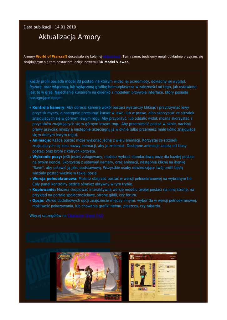 Data publikacji : 14.01.2010 Aktualizacja Armory Armory World of Warcraft doczekało się kolejnej aktualizacji. Tym razem, będziemy mogli dokładnie przyjrzeć się znajdującym się tam postaciom, dzięki nowemu 3D Model Viewer. Każdy profil posiada model 3d postaci na którym widać jej przedmioty, dokładny jej wygląd, fryzurę, oraz włączoną, lub wyłączoną grafikę hełmu/płaszcza w zależności od tego, jak ustawione jest to w grze. Najechanie kursorem na okienko z modelem przywoła interface, który posiada następujące opcje: ● ● ● ● ● ● Kontrola kamery: Aby obrócić kamerę wokół postaci wystarczy kliknąć i przytrzymać lewy przycisk myszy, a następnie przesunąć kursor w lewo, lub w prawo, albo skorzystać ze strzałek znajdujących się w górnym lewym rogu. Aby przybliżyć, lub oddalić widok można skorzystać z przycisków znajdujących się w górnym lewym rogu. Aby przemieścić postać w oknie, naciśnij prawy przycisk myszy a następnie przeciągnij ją w oknie (albo przemieść małe kółko znajdujące się w dolnym lewym rogu). Animacje: Każda postać może wykonać jedną z wielu animacji. Korzystaj ze strzałek znajdujących się koło nazwy animacji, aby je zmieniać. Dostępne animacje zależą od klasy postaci oraz broni z których korzysta. Wybranie pozy: Jeśli jesteś zalogowany, możesz wybrać standardową pozę dla każdej postaci na twoim koncie. Skorzystaj z ustawień kamery, oraz animacji, następnie kliknij na ikonkę "Save", aby ustawić ją jako podstawową. Wszystkie osoby odwiedzające twój profil będą widziały postać właśnie w takiej pozie. Wersja pełnoekranowa: Możesz obejrzeć postać w wersji pełnoekranowej na wybranym tle. Cały panel kontrolny będzie również aktywny w tym trybie. Kopiowanie: Możesz skopiować interaktywną wersję modelu twojej postaci na inną stronę, na przykład na portale społecznościowe, stronę gildii, czy forum. Opcje: Wśród dodatkowych opcji znajdziecie między innymi: wybór tła w wersji pełnoekranowej, możliwość pokazywania, lub chowania grafiki hełmu, płaszcza, czy tabardu. Więcej szczegółów na Character Sheet FAQ AKTUALIZACJA: Europejskie Armory zostało zaktualizowane o te same opcje. Dziękujemy użytkownikowi Rydia za informację na ten temat. Autor: Grzegorz "Sigmar" Sadziński Liczba wyświetleń strony: 3224 Data publikacji : 14.01.2010 Data modyfikacji : 15.01.2010 Tagi: Armory Komentarz (13) dodaj komentarz niezły pomysł!~dee 2010/01/14 10:04 Eh zawsze wszystko muszą mieć pierwsi -_-~Rydia 2010/01/14 10:56 bardzo fajne, ciekawe kiedy w europie to będzie~ElemenT 2010/01/14 13:25 Sig, ale dopakowaną postać masz hehe :P Set wygląda uber!~BeLial 2010/01/14 16:53 No no sig ;) Tyle achiev pointsow ;) Ladna postac, gz. Co do samego pomysłu - bajka ! Czekam na wersje EU. PS. Widze ze battlenet sie rozkrecil, tak trzymac !~Blackslight 2010/01/14 17:29 Blizz poinformował może kiedy będzie aktualizacja europejskiego armory?~Los_Emilos 2010/01/14 20:05 hehe niezly pomysl :) nlizz oby tak dalej~Zygi123 2010/01/14 20:48 blizz*~Zygi123 2010/01/14 20:49 wszystko fajnie tylko BE sux :< :(~kurka 2010/01/14 22:46 yay w europejskim armory tez już to jest ;D~Rydia 2010/01/15 08:15 Dzięki Rydia za informację, zaktualizowałem newsa kurka: może BE sux, ale nie przypominam sobie, żeby inna rasa w Hordzie mogła wybrać paladyna jako klasę~Sigmar 2010/01/15 09:12 hehe juz jest też na EU~Toldan 2010/01/15 15:12 U nas na privie tez jest widok 3D w Armory ;) mala probka: http://www.theatreofdreams.pl/armory2/?name=nucleo~eX 2010/01/20 07:09 dodaj komentarz Pozostałe nowości Zapowiedź zmian w klasach - Mnich Legion wkroczył w fazę alfa testów w czasie których dostępna jest póki co jedynie lokacja startowa łowców demonów, a my przyglądamy się temu, jakich zmian doczeka się klasa, która stosunkowo niedawno pojawiła się w World of Warcraft. Oto co na najnowszy dodatek Blizzard przygotował dla mnichów.Data publikacji: 24.11.20150 Zapowiedź zmian w klasach - Wojownik Po krótkiej przerwie wracamy z tłumaczeniami blogów poświęconych zmianom, jakie pojawią się w klasach w nadchodzącym dodatku do World of Warcraft. Oto czego powinni spodziewać się wojownicy z Azeroth w LegionieData publikacji: 23.11.20150 Zapowiedź zmian w klasach - Szaman Kolejna zapowiedzieć, która pojawiła się jakiś czas temu na łamach oficjalnej strony społecznościowej dotyczy szamana. Największe zmiany w przypadku tej klasy dotknęły totemy oraz system zasobów specjalizacji Elemental oraz EnhancementData publikacji: 16.11.20150 11 urodziny World of Warcraft World of Warcraft obchodzi już swoje 11 urodziny. Z tej okazji Blizzard przygotował kilka zabawek, które powinny wszystkim przypomnieć sam początek przygody w świecie Azeroth - w rolach głównych Edwin VanCleef, Hogger, murlok oraz Windfury (w wersji nadmuchiwanej).Data publikacji: 16.11.20150 Zapowiedź zmian w klasach - Rycerz śmierci Kolejna zapowiedź opublikowana na łamach oficjalnej strony społecznościowej World of Warcraft poświęcona jest klasie rycerzy śmierci. Poniżej znajdziecie informacje między innymi o ujednoliceniu wszystkich run oraz nowej umiejętności specjalizacji Blood, która została zainspirowana Lordem Marrowgarem z Icecrown Citadel.Data publikacji: 15.11.20150 Wszystkie nowości