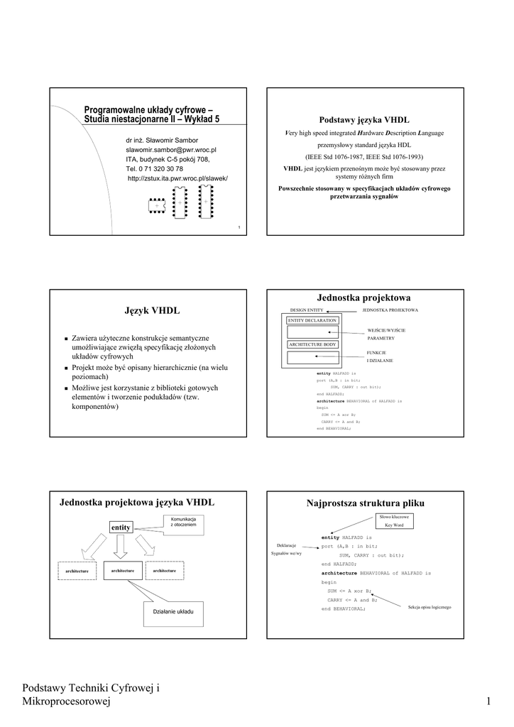 Programowalne układy cyfrowe – Studia niestacjonarne II – Wykład 5 Podstawy języka VHDL Very high speed integrated Hardware Description Language dr inŜ. Sławomir Sambor [email protected] ITA, budynek C-5 pokój 708, Tel. 0 71 320 30 78 http://zstux.ita.pwr.wroc.pl/slawek/ przemysłowy standard języka HDL (IEEE Std 1076-1987, IEEE Std 1076-1993) VHDL jest językiem przenośnym moŜe być stosowany przez systemy róŜnych firm Powszechnie stosowany w specyfikacjach układów cyfrowego przetwarzania sygnałów 1 Jednostka projektowa Język VHDL DESIGN ENTITY JEDNOSTKA PROJEKTOWA ENTITY DECLARATION WEJŚCIE/WYJŚCIE Zawiera uŜyteczne konstrukcje semantyczne umoŜliwiające zwięzłą specyfikację złoŜonych układów cyfrowych Projekt moŜe być opisany hierarchicznie (na wielu poziomach) MoŜliwe jest korzystanie z biblioteki gotowych elementów i tworzenie podukładów (tzw. komponentów) PARAMETRY ARCHITECTURE BODY FUNKCJE I DZIAŁANIE entity HALFADD is port (A,B : in bit; SUM, CARRY : out bit); end HALFADD; architecture BEHAVIORAL of HALFADD is begin SUM <= A xor B; CARRY <= A and B; end BEHAVIORAL; Jednostka projektowa języka VHDL Najprostsza struktura pliku Słowo kluczowe Komunikacja z otoczeniem entity Key Word entity HALFADD is Deklaracje port (A,B : in bit; Sygnałów we/wy SUM, CARRY : out bit); end HALFADD; architecture architecture architecture architecture BEHAVIORAL of HALFADD is begin SUM <= A xor B; CARRY <= A and B; Działanie układu Podstawy Techniki Cyfrowej i Mikroprocesorowej end BEHAVIORAL; Sekcja opisu logicznego 1 Jednostka deklaracji Jednostka deklaracji entity HALFADD is port (A,B : in bit; SUM, CARRY : out bit); end HALFADD; entity HALFADD is Deklaracja sygnałów •in - wejściowy port (A,B : in bit; • nazwa •out - wyjściowy • tryb •inout - dwukierunkowy • typ danych •buffer - wyjściowy z moŜliwością odczytu SUM, CARRY : out bit); end HALFADD; Typy danych: bit, bit_vector, integer, Boolean Style specyfikacji - przykłady Blok architektury architecture Budowa_Sumatora1 of Sumator is signal S1, S2 : bit; begin Bramka_Not1 : entity Work.Gate_Not port map (wej1, S1); Bramka_Not2 : entity Work.Gate_Not port map (wej2, S2); Bramka_And1 : entity Work.Gate_And port map (S1, S2, wyj); end Budowa_Sumatora1; Architektura opisuje sposób działania jednostki (entity) lub jej budowę (strukturę). architecture BEHAVIORAL of HALFADD is begin SUM <= A xor B; Style specyfikacji CARRY <= A and B; • funkcjonalny (behavioralny) end BEHAVIORAL; architecture Budowa_Sumatora2 of Sumator is signal S1, S2 : bit; begin process (wej1, wej2) S1 <= not wej1 after 2 ns; S2 <= not wej2 after 2 ns; wyj <= S1 and S2 after 2 ns; end process; end Budowa_Sumatora2; • przepływ danych (dataflow) • strukturalny Blok architektury Elementy strukturalne języka VHDL architecture nazwa_arch of nazwa_jednostki is Definicje i deklaracje: (typów, podtypów, stałych, sygnałów, komponentów,konfiguracji) begin – instrukcje przypisania wartości do sygnałów – procesy – komponenty end nazwa_arch; Podstawy Techniki Cyfrowej i Mikroprocesorowej Słowa kluczowe Identyfikatory Obiekty danych Operatory Atrybuty Instrukcje 2 Słowa kluczowe Identyfikatory abs downto library postponed Srl access else linkage procedure Subtype after elsif literal process Then alias end loop pure To BEGIN, END.. all entity map range Transport and exit mod record Type IF, THEN, CASE... architecture file nand register Unaffected array for new reject Units AND, OR, NAND, XOR... assert function Next rem Until attribute generate Nor report Use SIGNAL, COMPONEN, IN, OUT begin generic Not return Variable block group Null rol Wait Identyfikatory mogą się składać z liter, cyfr i podkreślników Wielkość liter nie ma znaczenia Nazwa musi się rozpoczynać od litery Nazwa nie powinna być dłuŜsza niŜ 16 znaków Nazwa powinna być znacząca body guarded Of ror When buffer if On select While bus impure Open severity With case in Or signal Xnor component inertial Others shared Xor configuration inout Out sla Ta_Sama_Nazwa 16_bit_bus : integer; -- błędnie TA_SAMA_NAZWA _bus_16_bit_ : integer; -- błędnie ta_sama_nazwa bus_16_bit : integer; -- O.K. constant is Package sll disconnect label Port sra Obiekty danych Obiekty danych słuŜą do przechowywania wartości. WyróŜnia się trzy klasy obiektów: • sygnał – signal Pojęcie typu danych Język VHDL jest bardzo silnie zorientowany na typy danych. KaŜdy obiekt musi mieć zdefiniowany typ i moŜe przechowywać dane tylko tego typu. SIGNAL signal_name : type_name ; • zmienne – variable entity HALFADD is • stałe – constant port (A,B : in bit; Wartości zmiennych są przypisywane natychmiast, wartości sygnałów – z pewnym opóźnieniem. Odpowiednikiem sprzętowym sygnału jest ścieŜka w układzie scalonym. Zmienna nie ma odpowiednika sprzętowego i słuŜy do obliczeń na wyŜszym poziomie abstrakcji. SUM, CARRY : out bit); end HALFADD; Wartości dozwolone w sygnale typu bit: ‘0’, ‘1’ Przy operacji przyporządkowania sygnałów, typy danych po kaŜdej stronie operatora przyporządkowania muszą być zgodne Typy danych Predefiniowane typy danych WyróŜnia się 10 typów danych sygnału: STD_LOGIC, STD_LOGIC_VECTOR BIT, BIT_VECTOR, STD_LOGIC, STD_LOGIC_VECTOR, (STD_ULOGIC), SIGNED, UNSIGNED, INTEGER, LIBRARY IEEE; use IEEE.Std_Logic_1164.all; STD_LOGIC: 0, 1, Z, –, L, H, U, X, W STD_LOGIC_VECTOR jest tablicą obiektów z STD_LOGIC ENUMERATION, BOOLEAN Podstawy Techniki Cyfrowej i Mikroprocesorowej 3 Sygnały Sygnał moŜe być zdefiniowany w jednostce deklaracji oraz w części deklaracyjnej architektury lub pakietu. Sygnał posiada dwie cechy z nim skojarzone: Stałe typ wartość Składnia signal nazwa_syg: typ_syg[:=wart_pocz]; Stałe to takie obiekty danych, których wartości nie zmieniają się w trakcie symulacji Stałe mogą być zadeklarowane w jednostce projektowej, pakiecie, procesie, architekturze, fu