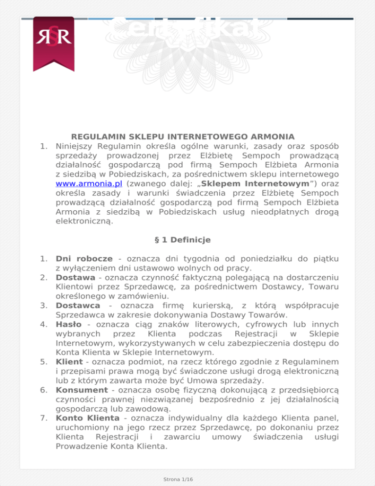 Certyfikat REGULAMIN SKLEPU INTERNETOWEGO ARMONIA 1. Niniejszy Regulamin określa ogólne warunki, zasady oraz sposób sprzedaży prowadzonej przez Elżbietę Sempoch prowadzącą działalność gospodarczą pod firmą Sempoch Elżbieta Armonia z siedzibą w Pobiedziskach, za pośrednictwem sklepu internetowego www.armonia.pl (zwanego dalej: „Sklepem Internetowym”) oraz określa zasady i warunki świadczenia przez Elżbietę Sempoch prowadzącą działalność gospodarczą pod firmą Sempoch Elżbieta Armonia z siedzibą w Pobiedziskach usług nieodpłatnych drogą elektroniczną. § 1 Definicje 1. Dni robocze - oznacza dni tygodnia od poniedziałku do piątku z wyłączeniem dni ustawowo wolnych od pracy. 2. Dostawa - oznacza czynność faktyczną polegającą na dostarczeniu Klientowi przez Sprzedawcę, za pośrednictwem Dostawcy, Towaru określonego w zamówieniu. 3. Dostawca - oznacza firmę kurierską, z którą współpracuje Sprzedawca w zakresie dokonywania Dostawy Towarów. 4. Hasło - oznacza ciąg znaków literowych, cyfrowych lub innych wybranych przez Klienta podczas Rejestracji w Sklepie Internetowym, wykorzystywanych w celu zabezpieczenia dostępu do Konta Klienta w Sklepie Internetowym. 5. Klient - oznacza podmiot, na rzecz którego zgodnie z Regulaminem i przepisami prawa mogą być świadczone usługi drogą elektroniczną lub z którym zawarta może być Umowa sprzedaży. 6. Konsument - oznacza osobę fizyczną dokonującą z przedsiębiorcą czynności prawnej niezwiązanej bezpośrednio z jej działalnością gospodarczą lub zawodową. 7. Konto Klienta - oznacza indywidualny dla każdego Klienta panel, uruchomiony na jego rzecz przez Sprzedawcę, po dokonaniu przez Klienta Rejestracji i zawarciu umowy świadczenia usługi Prowadzenie Konta Klienta. Strona 1/16 8. Login - oznacza indywidualne oznaczenie Klienta, przez niego ustalone, składające się z ciągu znaków literowych, cyfrowych lub innych, wymagane wraz z Hasłem do założenia Konta Klienta w Sklepie Internetowym. Login jest właściwym adresem poczty elektronicznej Klienta. 9. Przedsiębiorca - oznacza osobę fizyczną, osobę prawną lub jednostkę organizacyjną niebędącą osobą prawną, której ustawa przyznaje zdolność prawną, prowadzącą we własnym imieniu działalność gospodarczą lub zawodową i dokonującą czynności prawnej związaną bezpośrednio z jej działalnością gospodarczą lub zawodową. 10. Regulamin - oznacza niniejszy regulamin. 11. Rejestracja - oznacza czynność faktyczną dokonaną w sposób określony w Regulaminie, umożliwiającą korzystanie Klientowi ze wszystkich funkcjonalności Sklepu Internetowego. 12. Sprzedawca - oznacza Elżbietę Sempoch prowadzącą działalność gospodarczą pod firmą Sempoch Elżbieta Armonia z siedzibą w Pobiedziskach (62-010), ul. Gajowa 9a, NIP: 6651617526, REGON: 300778552, wpisaną do Centralnej Ewidencji i Informacji o Działalności Gospodarczej prowadzonej przez Ministra Rozwoju; email: [email protected], będącą jednocześnie właścicielem Sklepu Internetowego. 13. Strona Internetowa Sklepu - oznacza strony internetowe, pod którymi Sprzedawca prowadzi Sklep Internetowy, działające w domenie www.armonia.pl. 14. Towar - oznacza produkt przedstawiony przez Sprzedawcę za pośrednictwem Strony Internetowej Sklepu, mogący być przedmiotem Umowy sprzedaży. 15. Trwały nośnik - oznacza materiał lub narzędzie umożliwiające Klientowi lub Sprzedawcy przechowywanie informacji kierowanych osobiście do niego, w sposób umożliwiający dostęp do informacji w przyszłości przez czas odpowiedni do celów, jakim te informacje służą, i które pozwalają na odtworzenie przechowywanych informacji w niezmienionej postaci. 16. Umowa sprzedaży - oznacza umowę sprzedaży zawartą na odległość, na zasadach określonych w Regulaminie, między Klientem a Sprzedawcą. § 2 Postanowienia ogólne i korzystanie ze Sklepu Internetowego 1. Wszelkie prawa do Sklepu Internetowego, w tym majątkowe prawa autorskie, prawa własności intelektualnej do jego nazwy, jego domeny internetowej, Strony Internetowej Sklepu, a także do wzorców, formularzy, logotypów zamieszczanych na Stronie Internetowej Sklepu (za wyjątkiem logotypów i zdjęć prezentowanych na Stronie Internetowej Sklepu w celach prezentacji towarów, do których to prawa autorskie należą do Strona 2/16 2. 3. 4. 5. 6. podmiotów trzecich) należą do Sprzedawcy, a korzystanie z nich może następować wyłącznie w sposób określony i zgodny z Regulaminem oraz za zgodą Sprzedawcy wyrażoną na piśmie. Sprzedawca dołoży starań, aby korzystanie ze Sklepu Internetowego było możliwe dla użytkowników Internetu z użyciem wszystkich popularnych przeglądarek internetowych, systemów operacyjnych, typów urządzeń oraz typów połączeń internetowych. Minimalne wymagania techniczne umożliwiające korzystanie ze Strony Internetowej Sklepu to przeglądarka internetowa w wersji co najmniej Internet Explorer 11 lub Chrome 39 lub FireFox 34 lub Opera 26 lub Safari 5 lub nowszych, z włączoną obsługą języka Javascript, akceptująca pliki typu „cookies” oraz łącze internetowe o przepustowości co najmniej 256 kbit/s. Strona Internetowa Sklepu jest zoptymalizowana dla minimalnej rozdzielczości ekranu 1024x768 pikseli. Sprzedawca stosuje mechanizm plików "cookies", które podczas korzystania przez Klientów ze Strony Internetowej Sklepu, zapisywane są przez serwer Sprzedawcy na dysku twardym urządzenia końcowego Klienta. Stosowanie plików "cookies" ma na celu poprawne działanie Strony Internetowej Sklepu na urządzeniach końcowych Klientów. Mechanizm ten nie niszczy urządzenia końcowego Klienta oraz nie powoduje zmian konfiguracyjnych w urządzeniach końcowych Klientów ani w oprogramowaniu zainstalowanym na tych urządzeniach. Każdy Klient może wyłączyć mechanizm „cookies” w przeglądarce internetowej swojego urządzenia końcowego. S