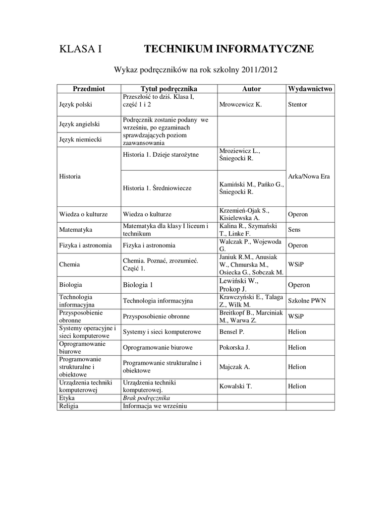 TECHNIKUM INFORMATYCZNE KLASA I Wykaz podręczników na rok szkolny 2011/2012 Przedmiot Język polski Język angielski Język niemiecki Tytuł podręcznika Przeszłość to dziś. Klasa I, część 1 i 2 Autor Mrowcewicz K. Stentor Podręcznik zostanie podany we wrześniu, po egzaminach sprawdzających poziom zaawansowania Historia 1. Dzieje staroŜytne Mroziewicz L., Śniegocki R. Historia 1. Średniowiecze Kamiński M., Pańko G., Śniegocki R. Historia Arka/Nowa Era Wiedza o kulturze Wiedza o kulturze Matematyka Matematyka dla klasy I liceum i technikum Fizyka i astronomia Fizyka i astronomia Chemia Chemia. Poznać, zrozumieć. Część 1. Biologia Biologia 1 Technologia informacyjna Przysposobienie obronne Systemy operacyjne i sieci komputerowe Oprogramowanie biurowe Programowanie strukturalne i obiektowe Urządzenia techniki komputerowej Etyka Religia Wydawnictwo Technologia informacyjna Przysposobienie obronne Krzemień-Ojak S., Kisielewska A. Kalina R., Szymański T., Linke F. Walczak P., Wojewoda G. Janiuk R.M., Anusiak W., Chmurska M., Osiecka G., Sobczak M. Lewiński W., Prokop J. Operon Sens Operon WSiP Operon Krawczyński E., Talaga Szkolne PWN Z., Wilk M. Breitkopf B., Marciniak WSiP M., Warwa Z. Systemy i sieci komputerowe Bensel P. Helion Oprogramowanie biurowe Pokorska J. Helion Programowanie strukturalne i obiektowe Majczak A. Helion Kowalski T. Helion Urządzenia techniki komputerowej. Brak podręcznika Informacja we wrześniu TECHNIKUM INFORMATYCZNE KLASA II Wykaz podręczników na rok szkolny 2011/2012 Przedmiot Język polski Tytuł podręcznika Autor Horizons 1 i 2 Nawarecki A., Siwicka D., Paczoska E. Radley P., Simons D. Oxford Repetytorium z języka angielskiego Gryca D., Sosnowska J. Przeszłość to dziś. Klasa II, część 1 i 2 Wydawnictwo Stentor Oxford University Press Język angielski Język niemiecki Historia Matematyka Fizyka i astronomia Chemia Biologia Geografia Przysposobienie obronne Systemy operacyjne i sieci komputerowe Oprogramowanie biurowe Programowanie strukturalne i obiektowe Urządzenia techniki komputerowej Multimedia i grafika komputerowa Etyka Religia Direkt 1B Historia 2. Od renesansu do czasów napoleońskich Ćwikowska B. Śniegocki R., Kamiński M Kalina R., Matematyka dla klasy I i II Szymański T., liceum i technikum Linke F. Walczak P., Fizyka i astronomia Wojewoda G. Janiuk R.M., Anusiak W., Chemia. Poznać, zrozumieć. Chmurska M., Część 2. Osiecka G., Sobczak M. Biologia. Poznać, Sobolewska-Łącka M., zrozumieć. Część 2. Kropiowska T. Makowska D., Poznać, zrozumieć. Część I Błaszkiewicz J. Breitkopf B., Przysposobienie obronne Marciniak M., Warwa Z. Systemy i sieci Bensel P. komputerowe Oprogramowanie biurowe Oxford University Press LektorKlett Arka/Nowa Era Sens Operon WSiP WSiP WSiP WSiP Helion Pokorska J. Helion Programowanie strukturalne Majczak A. i obiektowe Helion Urządzenia techniki komputerowej. Multimedia i grafika komputerowa Brak podręcznika Z wiarą w Ŝycie i świat. Kowalski T. Helion Rudy P. Helion Red. Tadeusz Śmiech Jedność TECHNIKUM INFORMATYCZNE KLASA III Wykaz podręczników na rok szkolny 2011/2012 Przedmiot Język polski Tytuł podręcznika Autor Przeszłość to dziś. Klasa III Kopciński J. Radley P., Simons D. Stentor Oxford Repetytorium z języka angielskiego Gryca D., Sosnowska J. Oxford University Press Direkt 2A Historia 2. Od kongresu wiedeńskiego do I wojny światowej Ćwikowska B. LektorKlett Horizons 2 i 3 Wydawnictwo Oxford University Press Język angielski Język niemiecki Historia Wiedza o społeczeństwie Wiedza o społeczeństwie Matematyka Matematyka dla klasy II i III liceum i technikum Geografia Poznać, zrozumieć. Część II Śniegocki R. Smutek Z., Maleska J., Surmacz B. Kalina R., Szymański T., Linke F. Wites T., Wieloński A. Stańda B., Wierzbowska B. Arka/Nowa Era Operon Sens WSiP Podstawy przedsiębiorczości Systemy operacyjne i sieci komputerowe Oprogramowanie biurowe Programowanie strukturalne i obiektowe Urządzenia techniki komputerowej Zajęcia specjalizacyjne Etyka Systemy i sieci komputerowe Bensel P. Helion Oprogramowanie biurowe Programowanie strukturalne i obiektowe Urządzenia techniki komputerowej. HTML i JavaScript Brak podręcznika Pokorska J. Helion Majczak A. Helion Kowalski T. Helion Lis M. Helion Religia Z wiarą na progu miłości. Red. Tadeusz Śmiech Jedność Podstawy przedsiębiorczości Szkolne PWN TECHNIKUM INFORMATYCZNE KLASA IV Wykaz podręczników na rok szkolny 2010/2011 Przedmiot Język polski Tytuł podręcznika Przeszłość to dziś. Klasa III Horizons 3 Autor Kopciński J. Radley P., Simons D. Wydawnictwo Stentor Oxford University Press Język angielski Oxford Repetytorium z języka Gryca D., angielskiego Sosnowska J. Oxford University Press Język niemiecki Direkt 2B LektorKlett Historia Historia 3. Burzliwy wiek XX Matematyka Matematyka dla klasy III liceum i technikum Podstawy przedsiębiorczości Systemy operacyjne i sieci komputerowe Oprogramowanie biurowe Programowanie strukturalne i obiektowe Język angielski zawodowy Zajęcia specjalizacyjne Etyka Religia Podstawy przedsiębiorczości Systemy i sieci komputerowe Ćwikowska B. Śniegocki R. Kalina R., Szymański T., Linke F Stańda B., Wierzbowska B. Bensel P. Oprogramowanie biurowe Pokorska J. Programowanie strukturalne i Majczak A. obiektowe Brak podręcznika HTML i JavaScript Lis M. Brak podręcznika Red. Tadeusz Z wiarą na progu miłości. Śmiech Arka/Nowa Era Sens Szkolne PWN Helion Helion Helion Helion Jedność