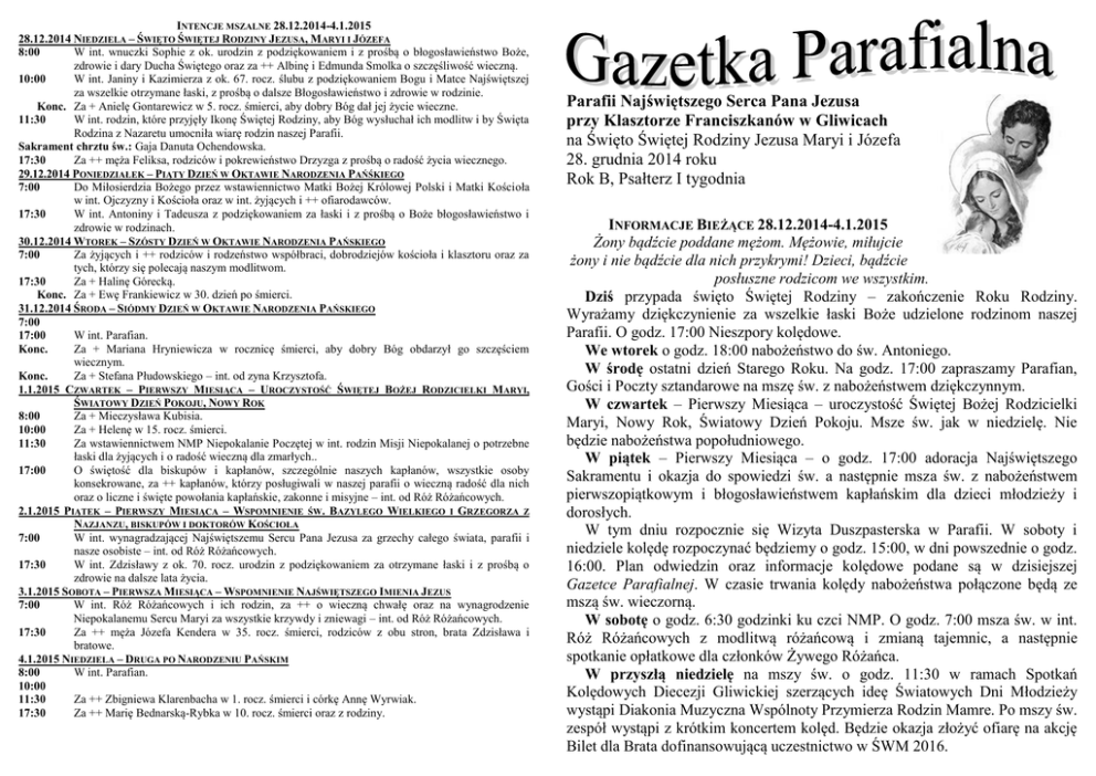 INTENCJE MSZALNE 28.12.2014-4.1.2015 28.12.2014 NIEDZIELA – ŚWIĘTO ŚWIĘTEJ RODZINY JEZUSA, MARYI I JÓZEFA 8:00 W int. wnuczki Sophie z ok. urodzin z podziękowaniem i z prośbą o błogosławieństwo Boże, zdrowie i dary Ducha Świętego oraz za ++ Albinę i Edmunda Smolka o szczęśliwość wieczną. 10:00 W int. Janiny i Kazimierza z ok. 67. rocz. ślubu z podziękowaniem Bogu i Matce Najświętszej za wszelkie otrzymane łaski, z prośbą o dalsze Błogosławieństwo i zdrowie w rodzinie. Konc. Za + Anielę Gontarewicz w 5. rocz. śmierci, aby dobry Bóg dał jej życie wieczne. 11:30 W int. rodzin, które przyjęły Ikonę Świętej Rodziny, aby Bóg wysłuchał ich modlitw i by Święta Rodzina z Nazaretu umocniła wiarę rodzin naszej Parafii. Sakrament chrztu św.: Gaja Danuta Ochendowska. 17:30 Za ++ męża Feliksa, rodziców i pokrewieństwo Drzyzga z prośbą o radość życia wiecznego. 29.12.2014 PONIEDZIAŁEK – PIĄTY DZIEŃ W OKTAWIE NARODZENIA PAŃŚKIEGO 7:00 Do Miłosierdzia Bożego przez wstawiennictwo Matki Bożej Królowej Polski i Matki Kościoła w int. Ojczyzny i Kościoła oraz w int. żyjących i ++ ofiarodawców. 17:30 W int. Antoniny i Tadeusza z podziękowaniem za łaski i z prośbą o Boże błogosławieństwo i zdrowie w rodzinach. 30.12.2014 WTOREK – SZÓSTY DZIEŃ W OKTAWIE NARODZENIA PAŃSKIEGO 7:00 Za żyjących i ++ rodziców i rodzeństwo współbraci, dobrodziejów kościoła i klasztoru oraz za tych, którzy się polecają naszym modlitwom. 17:30 Za + Halinę Górecką. Konc. Za + Ewę Frankiewicz w 30. dzień po śmierci. 31.12.2014 ŚRODA – SIÓDMY DZIEŃ W OKTAWIE NARODZENIA PAŃSKIEGO 7:00 17:00 W int. Parafian. Konc. Za + Mariana Hryniewicza w rocznicę śmierci, aby dobry Bóg obdarzył go szczęściem wiecznym. Konc. Za + Stefana Płudowskiego – int. od zyna Krzysztofa. 1.1.2015 CZWARTEK – PIERWSZY MIESIĄCA – UROCZYSTOŚĆ ŚWIĘTEJ BOŻEJ RODZICIELKI MARYI, ŚWIATOWY DZIEŃ POKOJU, NOWY ROK 8:00 Za + Mieczysława Kubisia. 10:00 Za + Helenę w 15. rocz. śmierci. 11:30 Za wstawiennictwem NMP Niepokalanie Poczętej w int. rodzin Misji Niepokalanej o potrzebne łaski dla żyjących i o radość wieczną dla zmarłych.. 17:00 O świętość dla biskupów i kapłanów, szczególnie naszych kapłanów, wszystkie osoby konsekrowane, za ++ kapłanów, którzy posługiwali w naszej parafii o wieczną radość dla nich oraz o liczne i święte powołania kapłańskie, zakonne i misyjne – int. od Róż Różańcowych. 2.1.2015 PIĄTEK – PIERWSZY MIESIĄCA – WSPOMNIENIE ŚW. BAZYLEGO WIELKIEGO I GRZEGORZA Z NAZJANZU, BISKUPÓW I DOKTORÓW KOŚCIOŁA 7:00 W int. wynagradzającej Najświętszemu Sercu Pana Jezusa za grzechy całego świata, parafii i nasze osobiste – int. od Róż Różańcowych. 17:30 W int. Zdzisławy z ok. 70. rocz. urodzin z podziękowaniem za otrzymane łaski i z prośbą o zdrowie na dalsze lata życia. 3.1.2015 SOBOTA – PIERWSZA MIESIĄCA – WSPOMNIENIE NAJŚWIĘTSZEGO IMIENIA JEZUS 7:00 W int. Róż Różańcowych i ich rodzin, za ++ o wieczną chwałę oraz na wynagrodzenie Niepokalanemu Sercu Maryi za wszystkie krzywdy i zniewagi – int. od Róż Różańcowych. 17:30 Za ++ męża Józefa Kendera w 35. rocz. śmierci, rodziców z obu stron, brata Zdzisława i bratowe. 4.1.2015 NIEDZIELA – DRUGA PO NARODZENIU PAŃSKIM 8:00 W int. Parafian. 10:00 11:30 Za ++ Zbigniewa Klarenbacha w 1. rocz. śmierci i córkę Annę Wyrwiak. 17:30 Za ++ Marię Bednarską-Rybka w 10. rocz. śmierci oraz z rodziny. Parafii Najświętszego Serca Pana Jezusa przy Klasztorze Franciszkanów w Gliwicach na Święto Świętej Rodziny Jezusa Maryi i Józefa 28. grudnia 2014 roku Rok B, Psałterz I tygodnia INFORMACJE BIEŻĄCE 28.12.2014-4.1.2015 Żony bądźcie poddane mężom. Mężowie, miłujcie żony i nie bądźcie dla nich przykrymi! Dzieci, bądźcie posłuszne rodzicom we wszystkim. Dziś przypada święto Świętej Rodziny – zakończenie Roku Rodziny. Wyrażamy dziękczynienie za wszelkie łaski Boże udzielone rodzinom naszej Parafii. O godz. 17:00 Nieszpory kolędowe. We wtorek o godz. 18:00 nabożeństwo do św. Antoniego. W środę ostatni dzień Starego Roku. Na godz. 17:00 zapraszamy Parafian, Gości i Poczty sztandarowe na mszę św. z nabożeństwem dziękczynnym. W czwartek – Pierwszy Miesiąca – uroczystość Świętej Bożej Rodzicielki Maryi, Nowy Rok, Światowy Dzień Pokoju. Msze św. jak w niedzielę. Nie będzie nabożeństwa popołudniowego. W piątek – Pierwszy Miesiąca – o godz. 17:00 adoracja Najświętszego Sakramentu i okazja do spowiedzi św. a następnie msza św. z nabożeństwem pierwszopiątkowym i błogosławieństwem kapłańskim dla dzieci młodzieży i dorosłych. W tym dniu rozpocznie się Wizyta Duszpasterska w Parafii. W soboty i niedziele kolędę rozpoczynać będziemy o godz. 15:00, w dni powszednie o godz. 16:00. Plan odwiedzin oraz informacje kolędowe podane są w dzisiejszej Gazetce Parafialnej. W czasie trwania kolędy nabożeństwa połączone będą ze mszą św. wieczorną. W sobotę o godz. 6:30 godzinki ku czci NMP. O godz. 7:00 msza św. w int. Róż Różańcowych z modlitwą różańcową i zmianą tajemnic, a następnie spotkanie opłatkowe dla członków Żywego Różańca. W przyszłą niedzielę na mszy św. o godz. 11:30 w ramach Spotkań Kolędowych Diecezji Gliwickiej szerzących ideę Światowych Dni Młodzieży wystąpi Diakonia Muzyczna Wspólnoty Przymierza Rodzin Mamre. Po mszy św. zespół wystąpi z krótkim koncertem kolęd. Będzie okazja złożyć ofiarę na akcję Bilet dla Brata dofinansowującą uczestnictwo w ŚWM 2016. Plan kolędy: w piątek ulice Św. Katarzyny i Jagiellońska 16-24 oraz 9-23a, w sobotę ulica Jagiellońska 27-31 oraz 26-46, w niedzielę ulice Jagiellońska 46a-50 i Szara. Polecamy Gazetkę Parafialną. Parafianom i Gościom dziękujemy za modlitwy, wszelkie złożone ofiary i kwiaty. Życzymy potrzebnych łask n